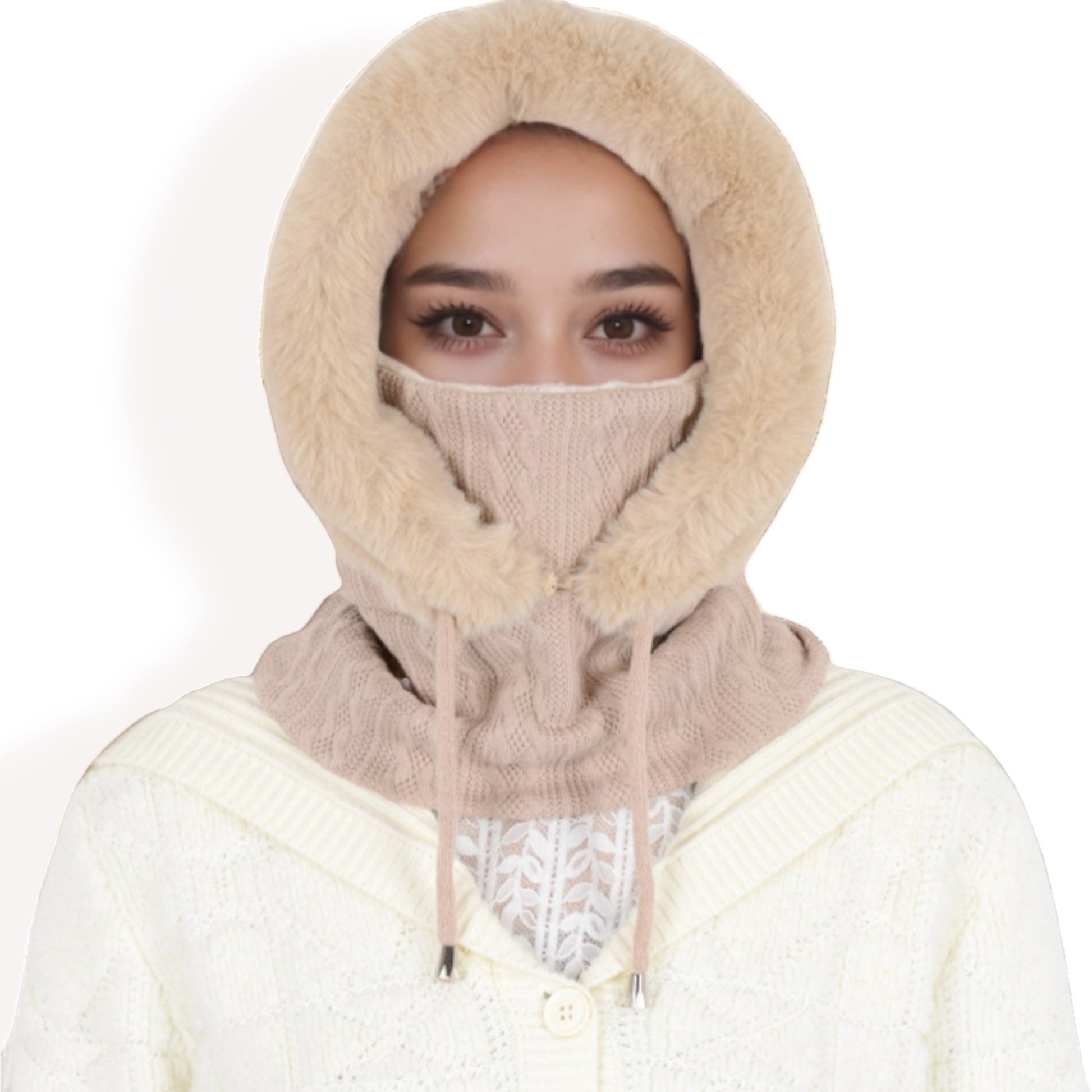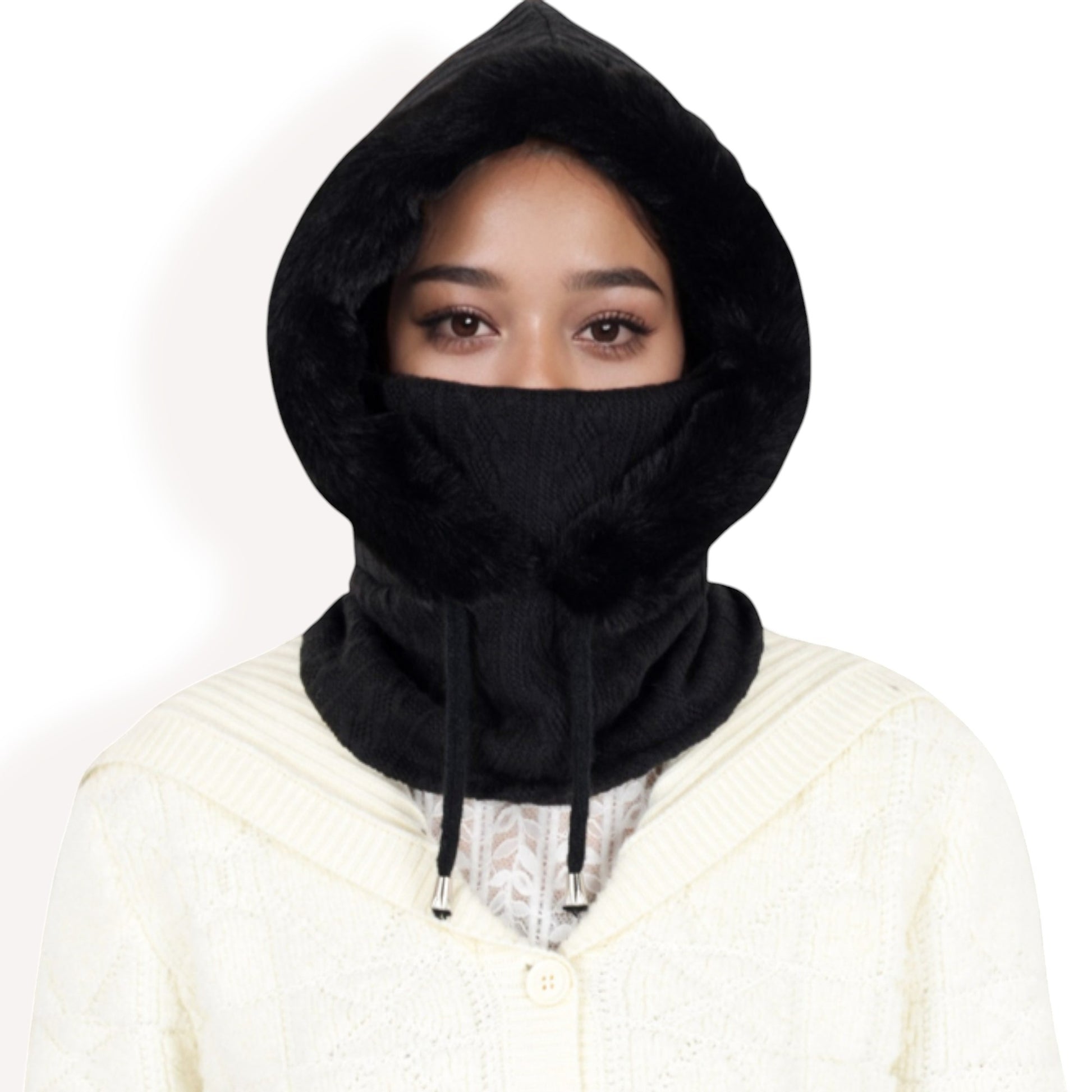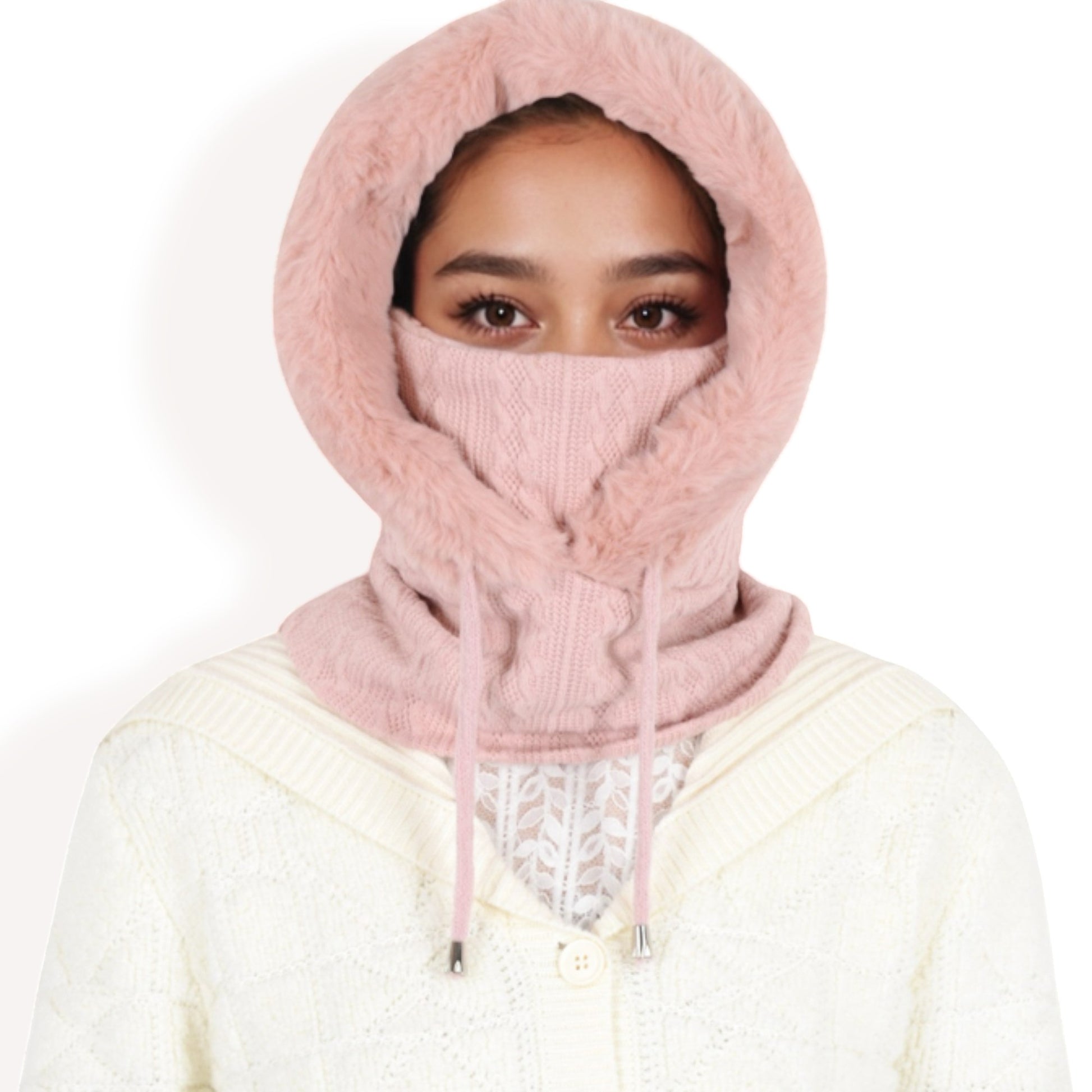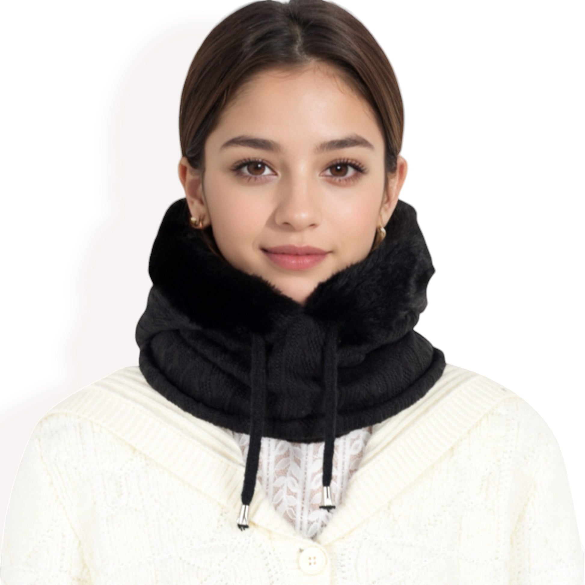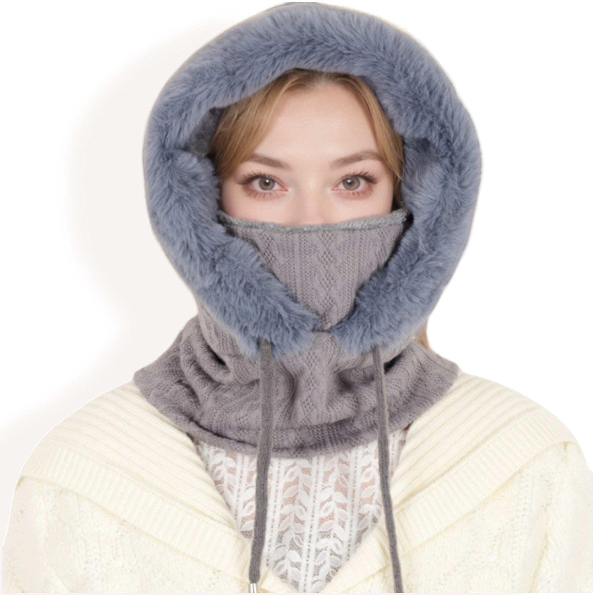 Embrace cozy warmth and elegant style with this faux fur-lined knit hooded scarf, a must-have for chilly days. The soft knit exterior paired with a plush faux fur interior provides exceptional warmth and comfort. Designed with an adjustable drawstring, this versatile hooded scarf ensures a secure and customizable fit. Its unique design offers full coverage for your head, neck, and face, making it ideal for cold-weather activities. Whether you're out for a winter stroll or need extra protection against the elements, this hooded scarf seamlessly combines practicality with fashion.
