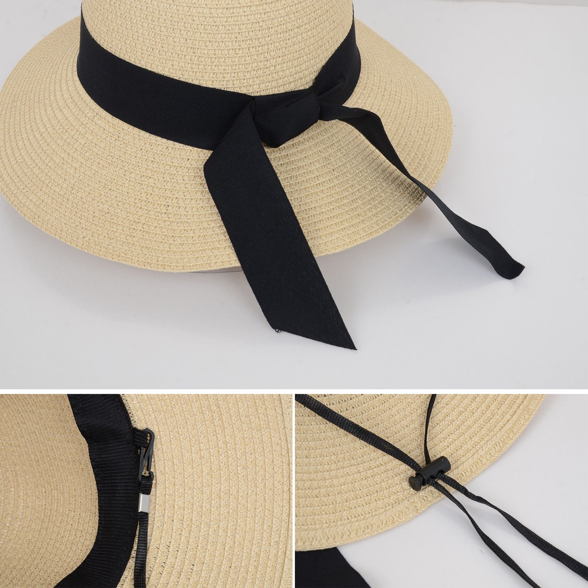 This stylish straw sun hat features a wide brim for sun protection, a large black ribbon bow for a feminine touch, and a built-in adjustable chin strap. A breathable inner sweatband keeps you cool, making it ideal for travel, outdoor events, or casual wear.
