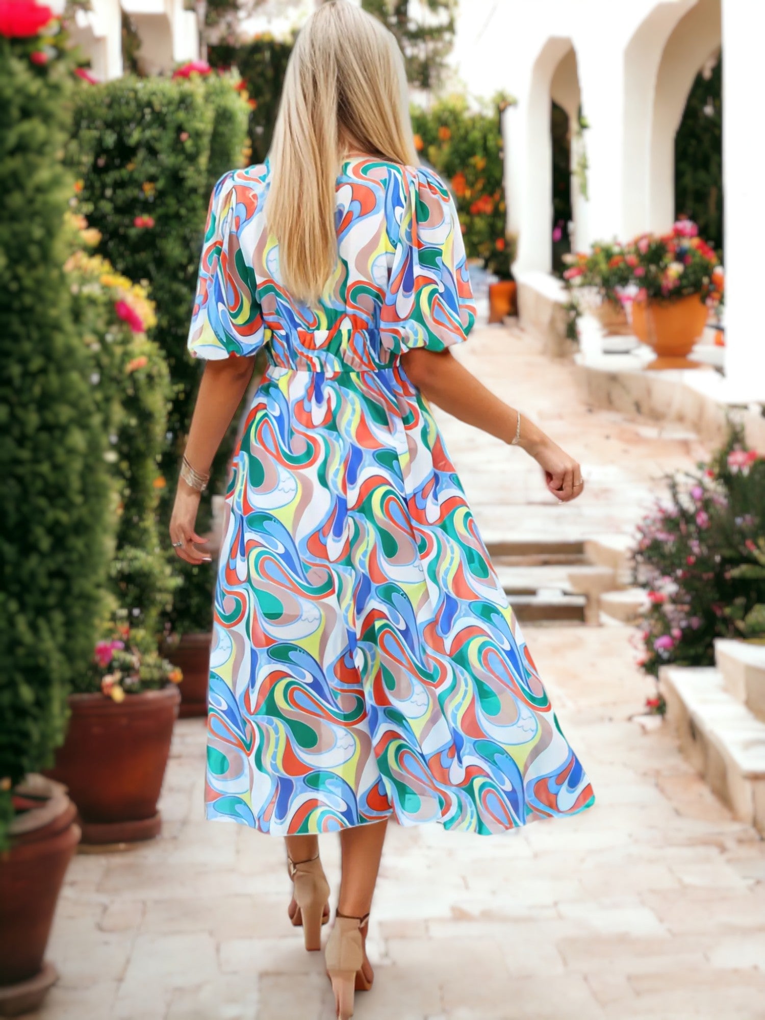 Casual Floral Printed V-Neck Puffed Sleeve Maxi Dress