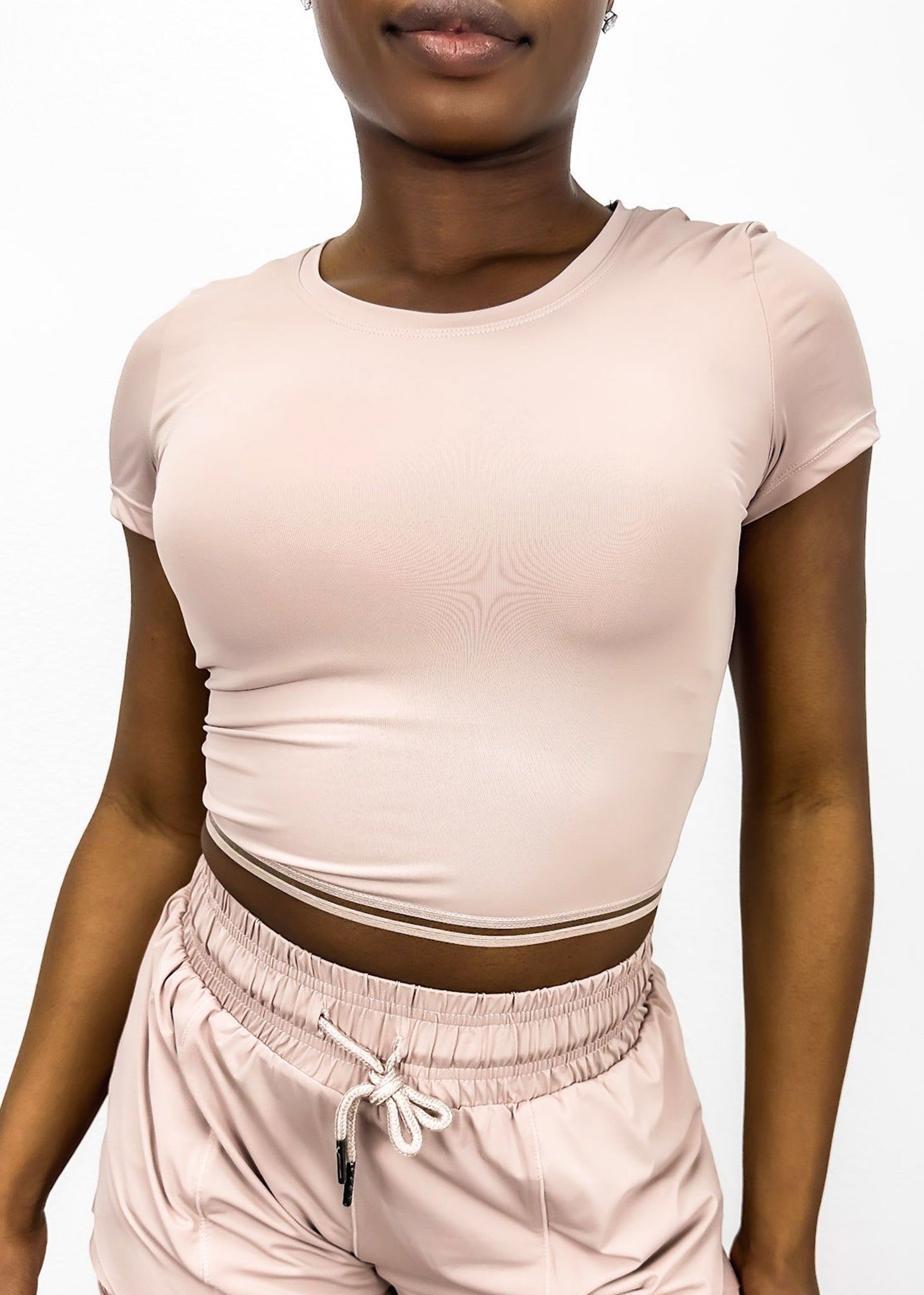 The Anna-Kaci t-shirt is detailed with a round neckline, short cap sleeves, cropped length, and form fitting throughout. Features a thin mesh trim on bottom hemline. Pair this buttery soft, light-weight fitness baby tee with our Drawstring Waist Lined Active Shorts for an effortless gym ensemble.