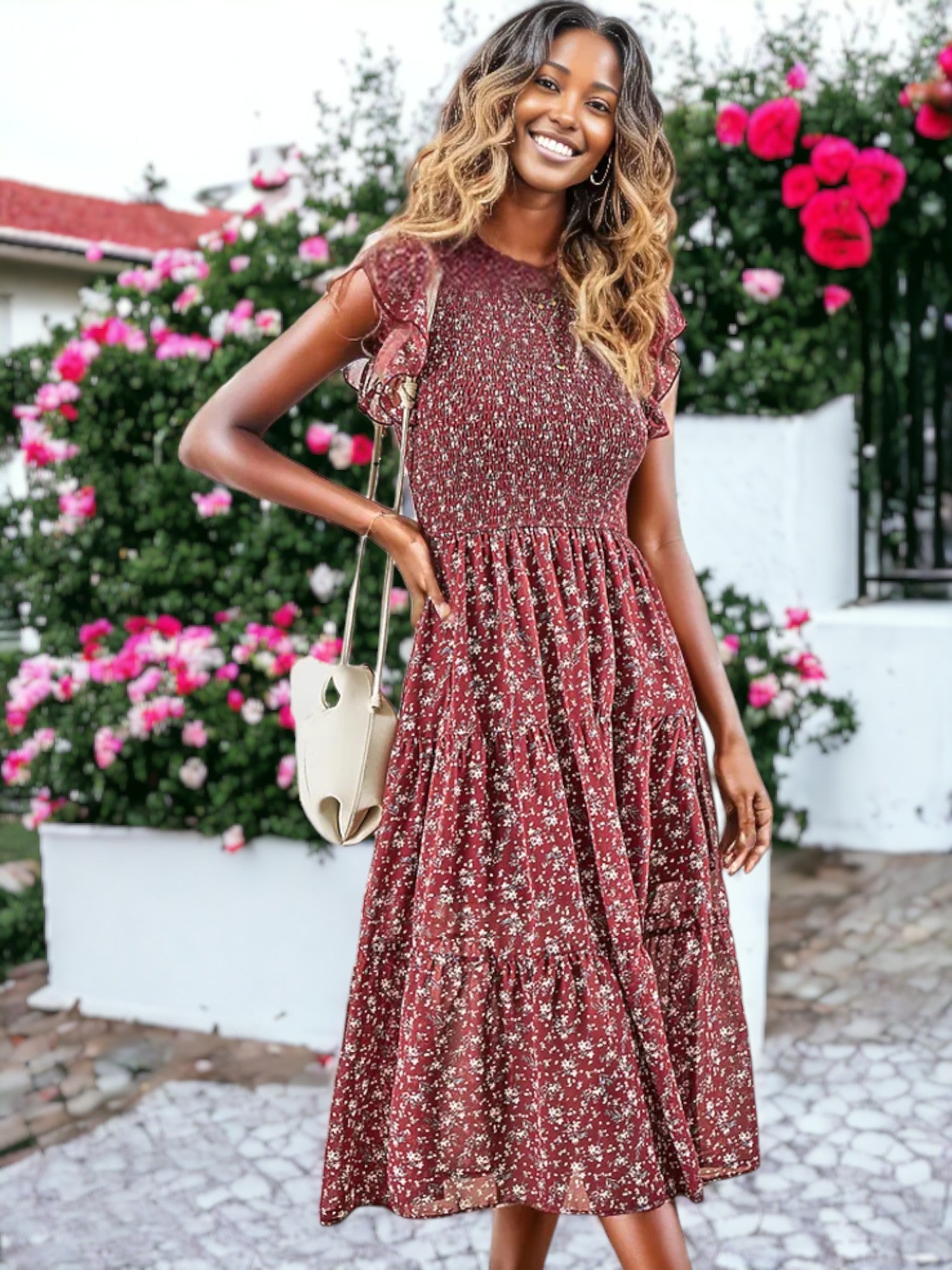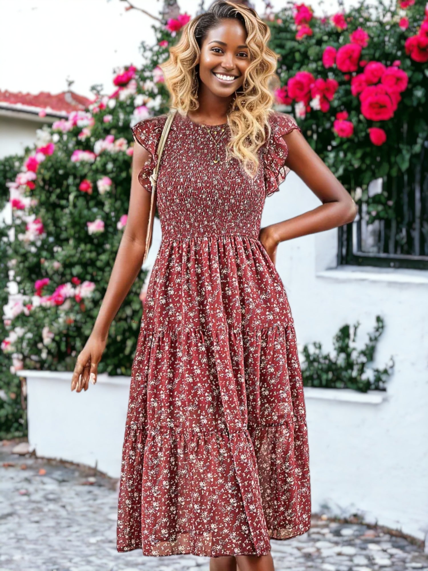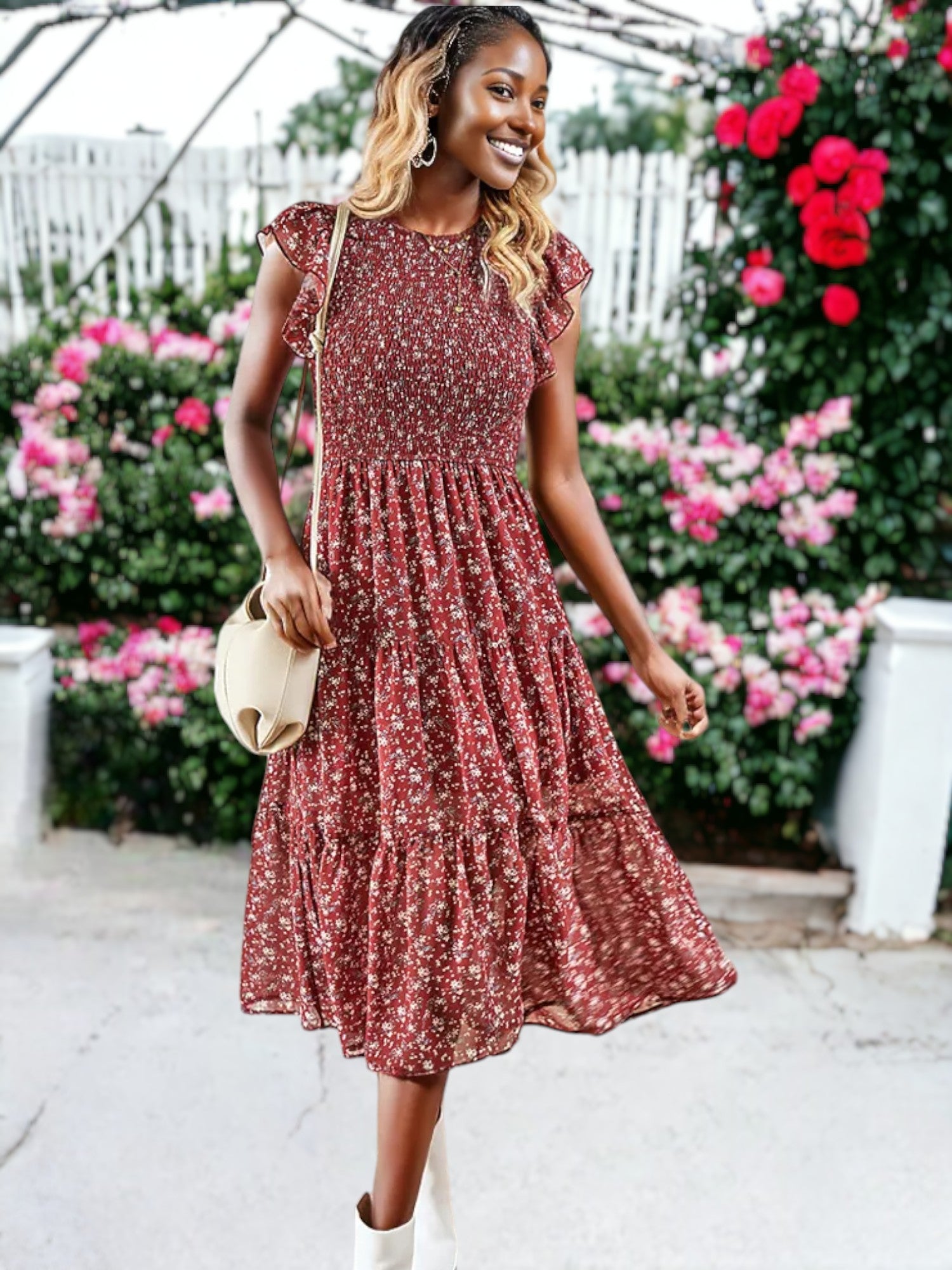 Flower Printed Smocked Check Ruffle Cap Sleeve Gathered Midi Dress