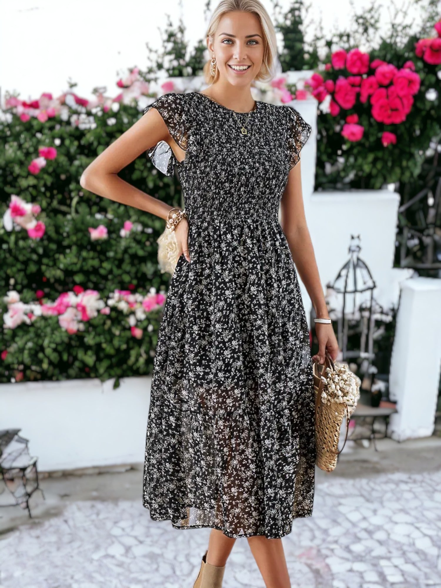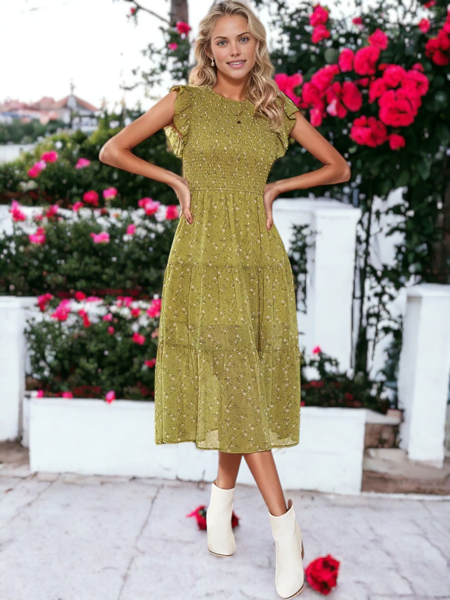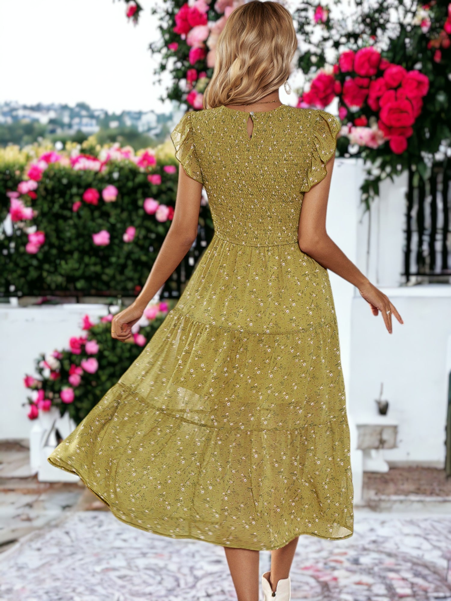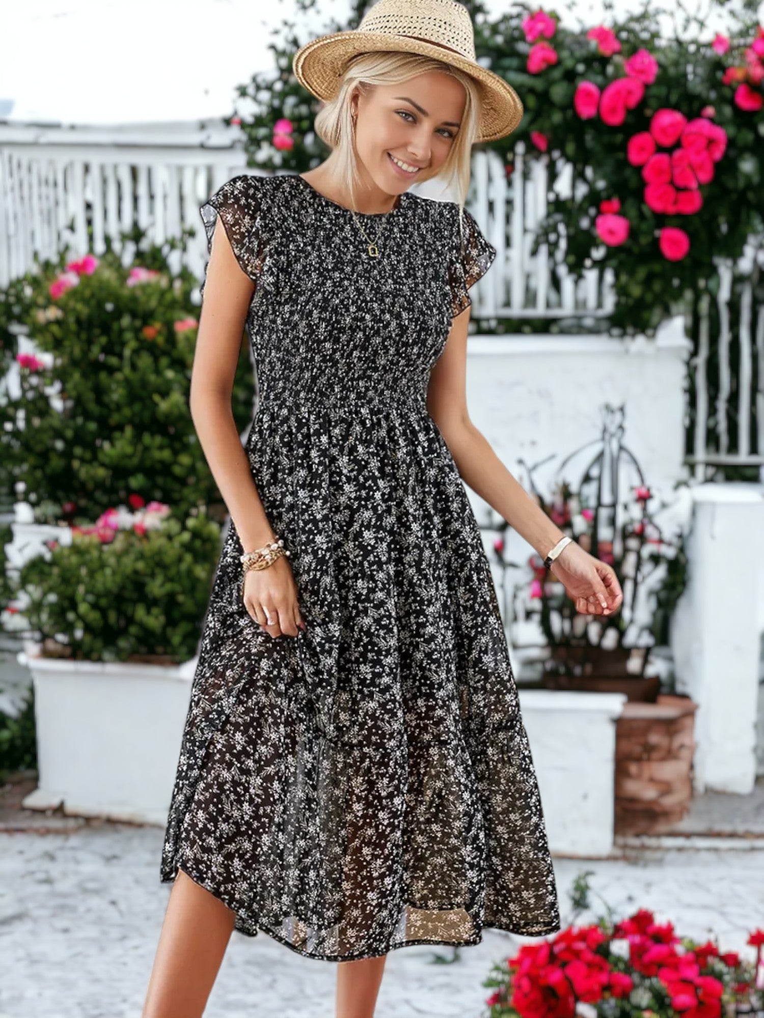 Flower Printed Smocked Check Ruffle Cap Sleeve Gathered Midi Dress