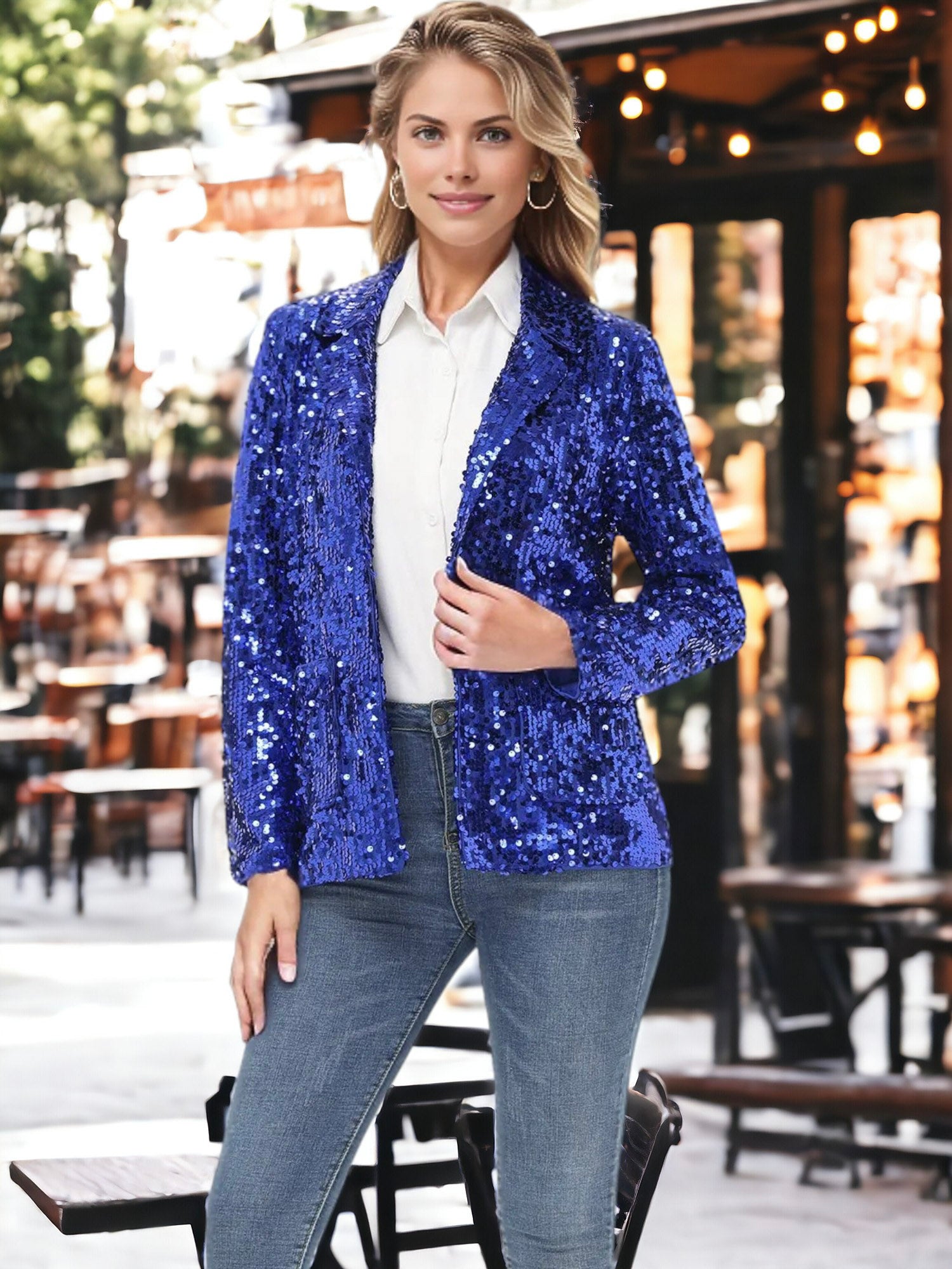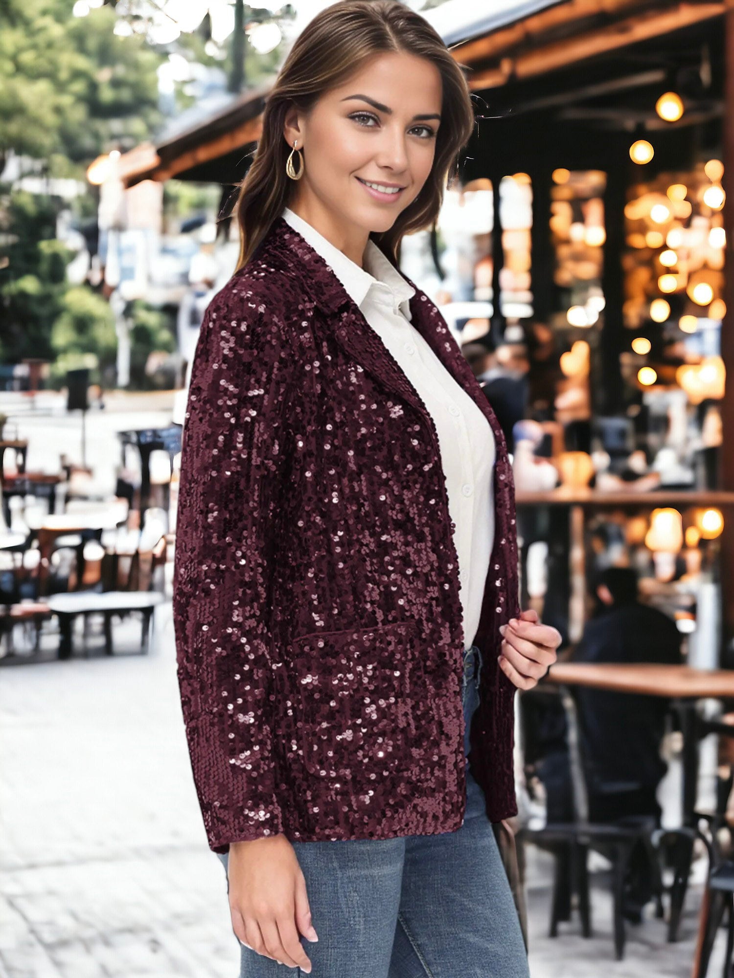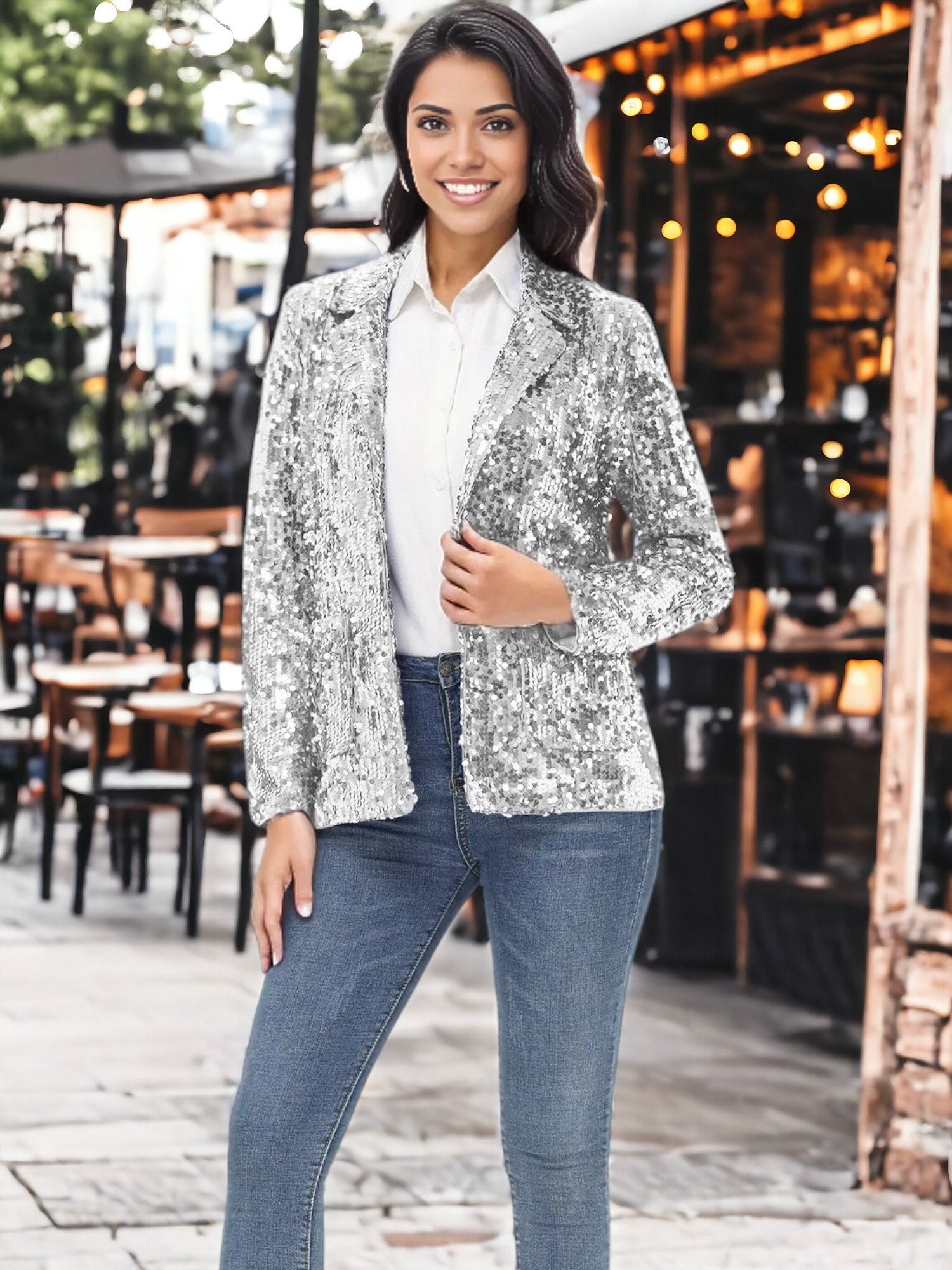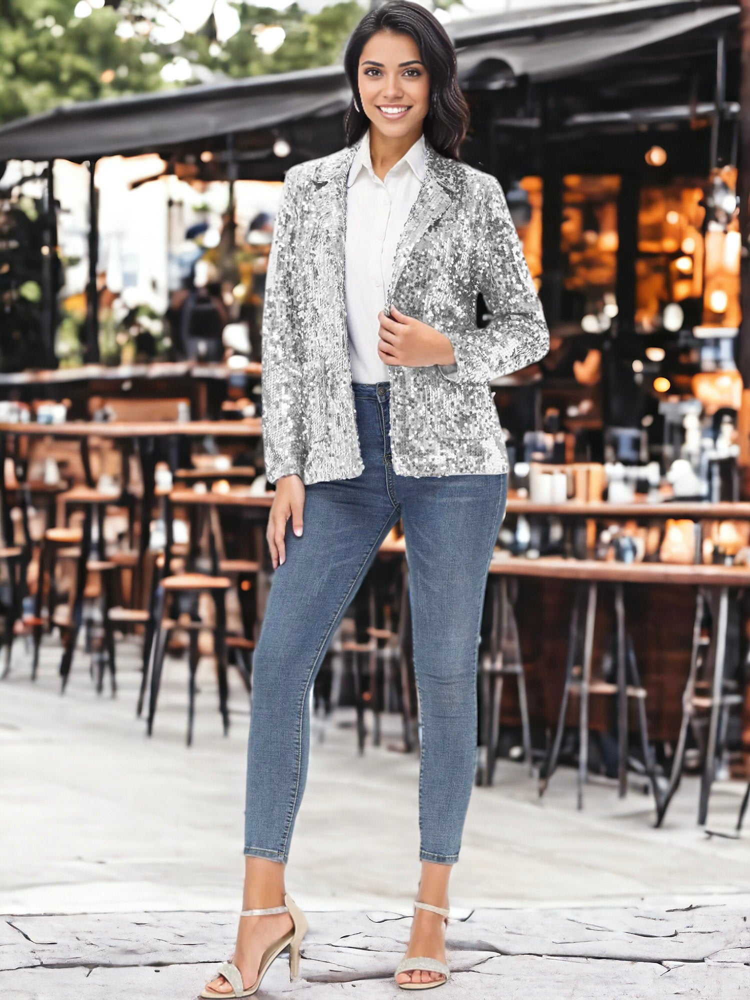 Shine bright in our Glitter Long Sleeve Open Front Sparkle Party Blazer Jacket. This jacket is a perfect blend of sophistication and glamour, designed to elevate your party ensemble. The long sleeves and open front, adorned with sparkling glitter, make it a statement piece for any special occasion. Whether it's a night out on the town or a festive celebration, this blazer adds a touch of dazzle to your outfit. Embrace the sparkle and turn heads with this glamorous and chic party blazer that's ready to make you the star of the event.
