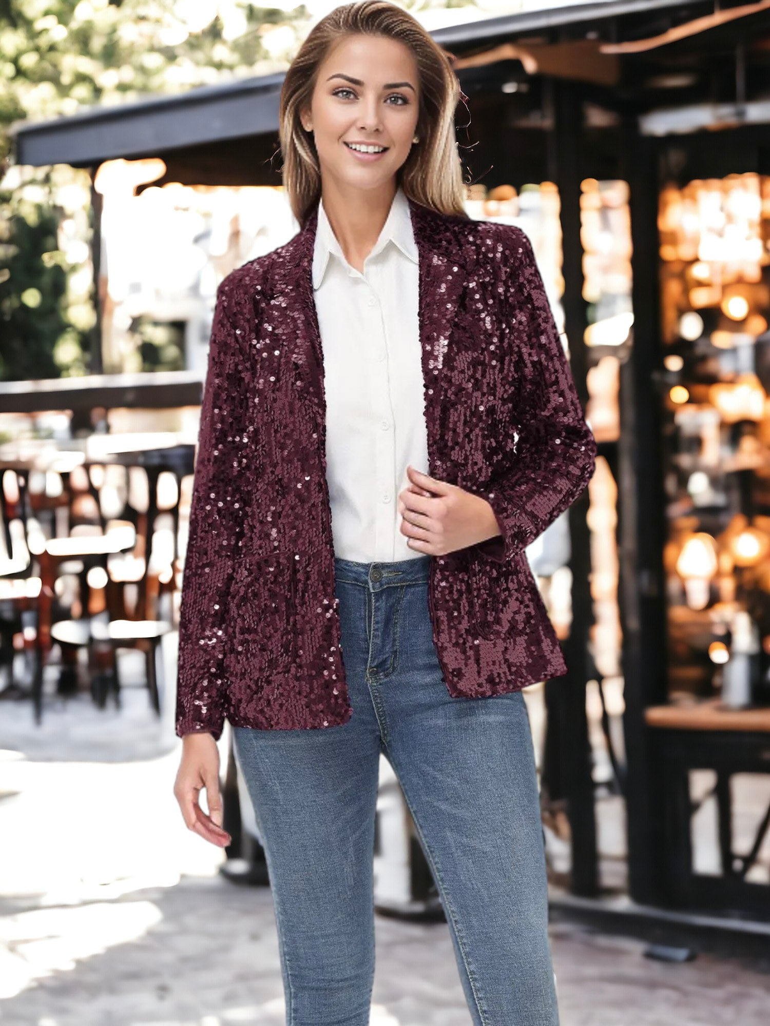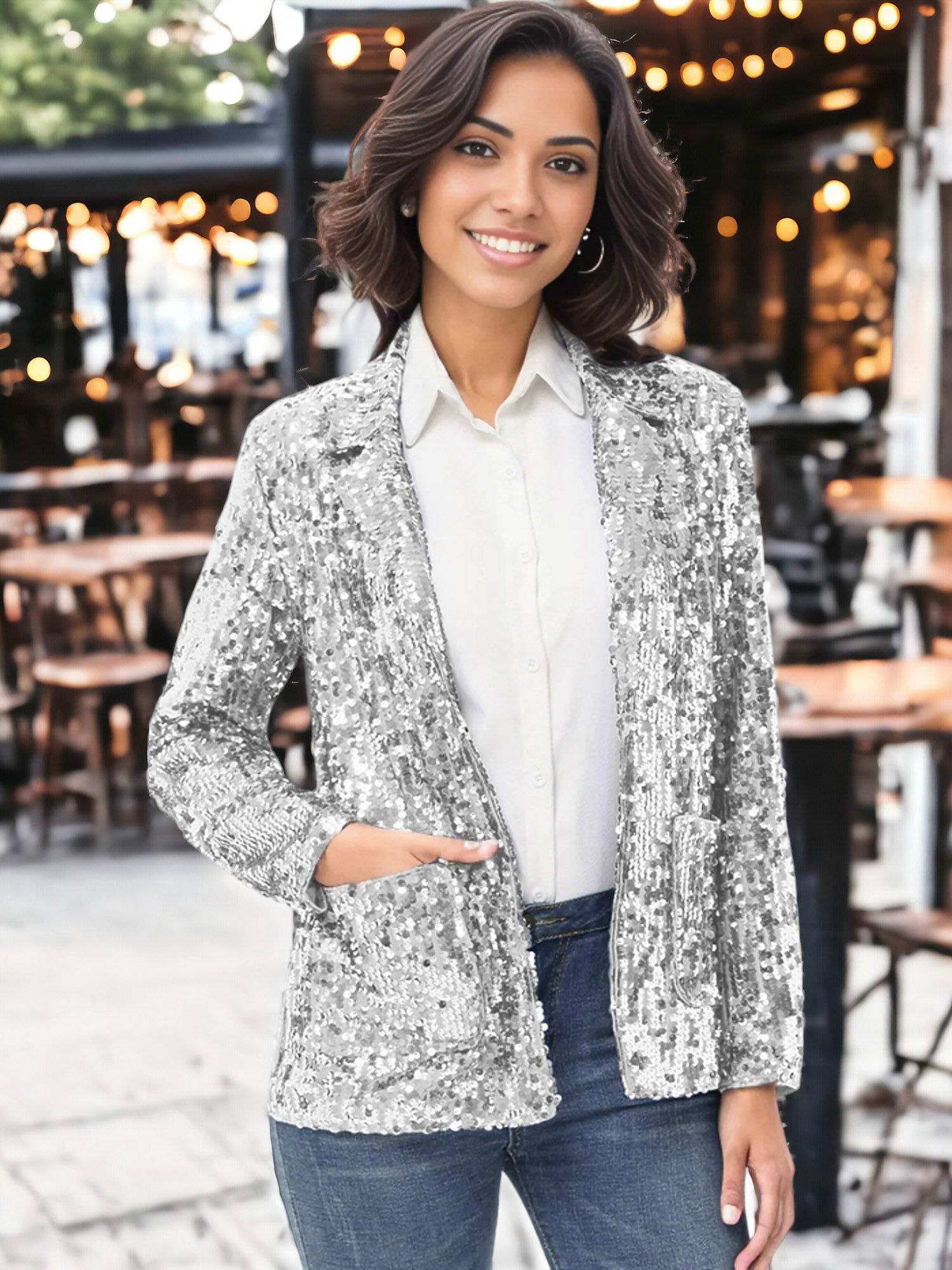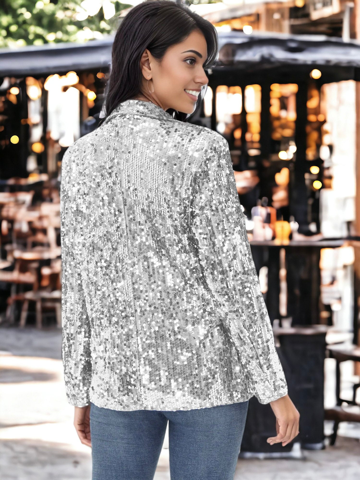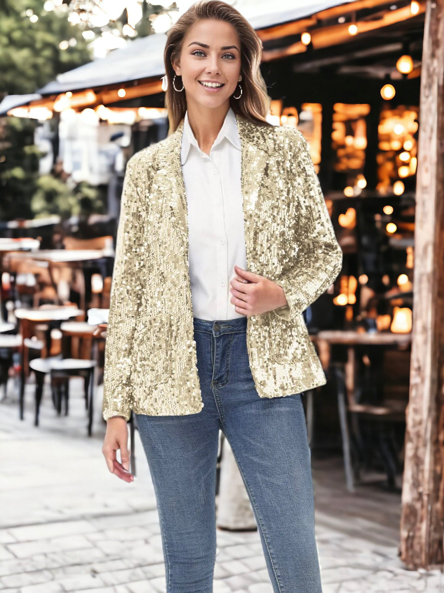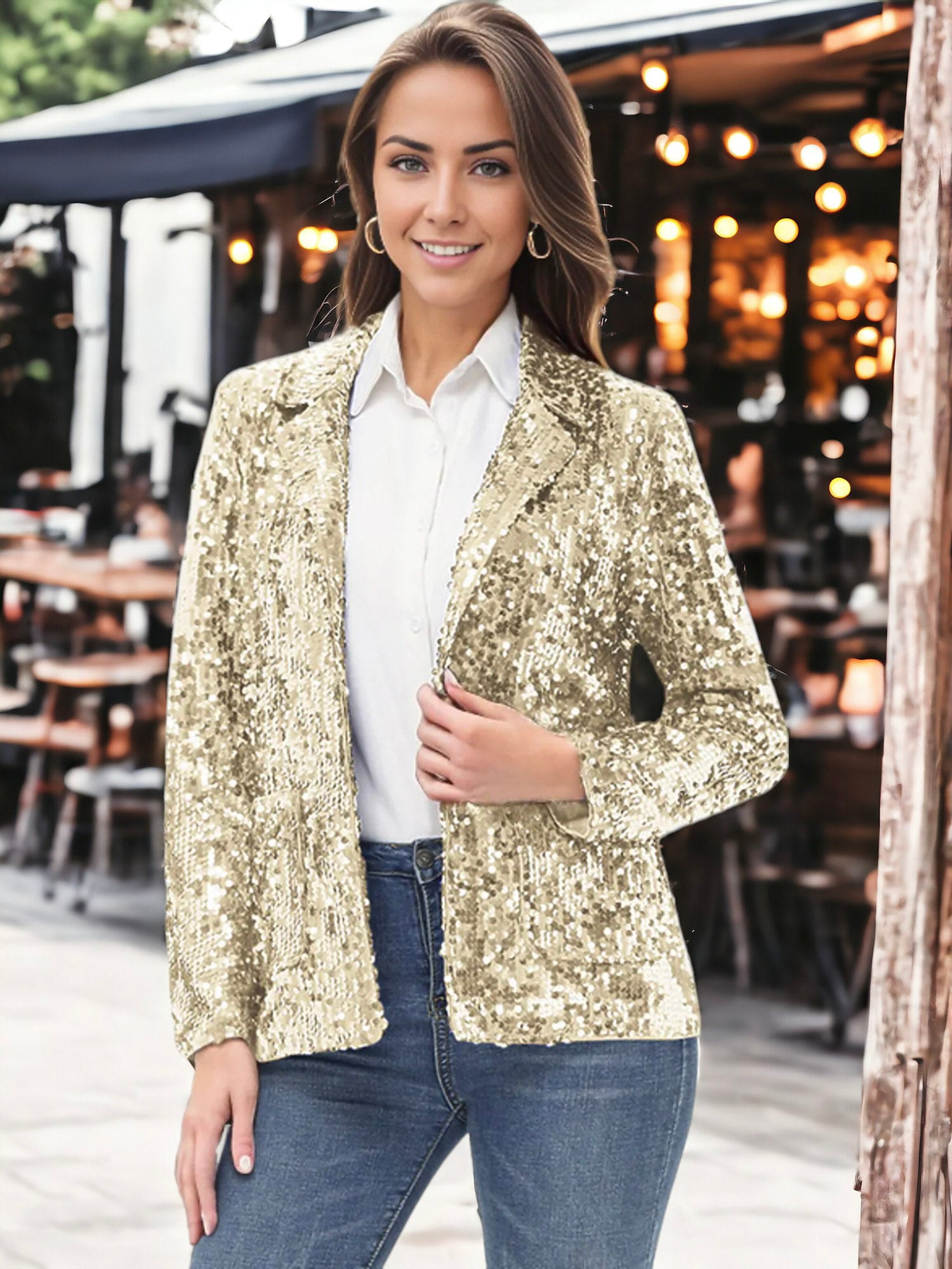 Shine bright in our Glitter Long Sleeve Open Front Sparkle Party Blazer Jacket. This jacket is a perfect blend of sophistication and glamour, designed to elevate your party ensemble. The long sleeves and open front, adorned with sparkling glitter, make it a statement piece for any special occasion. Whether it's a night out on the town or a festive celebration, this blazer adds a touch of dazzle to your outfit. Embrace the sparkle and turn heads with this glamorous and chic party blazer that's ready to make you the star of the event.