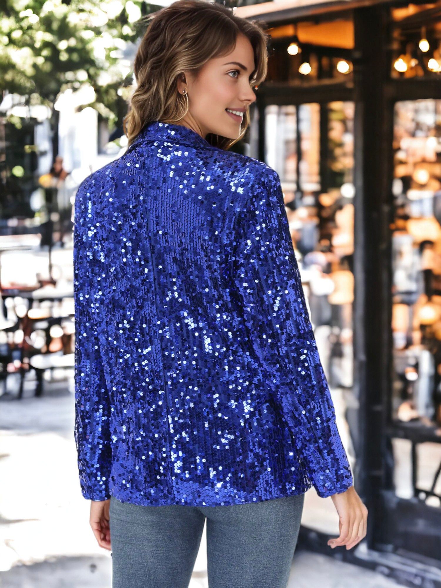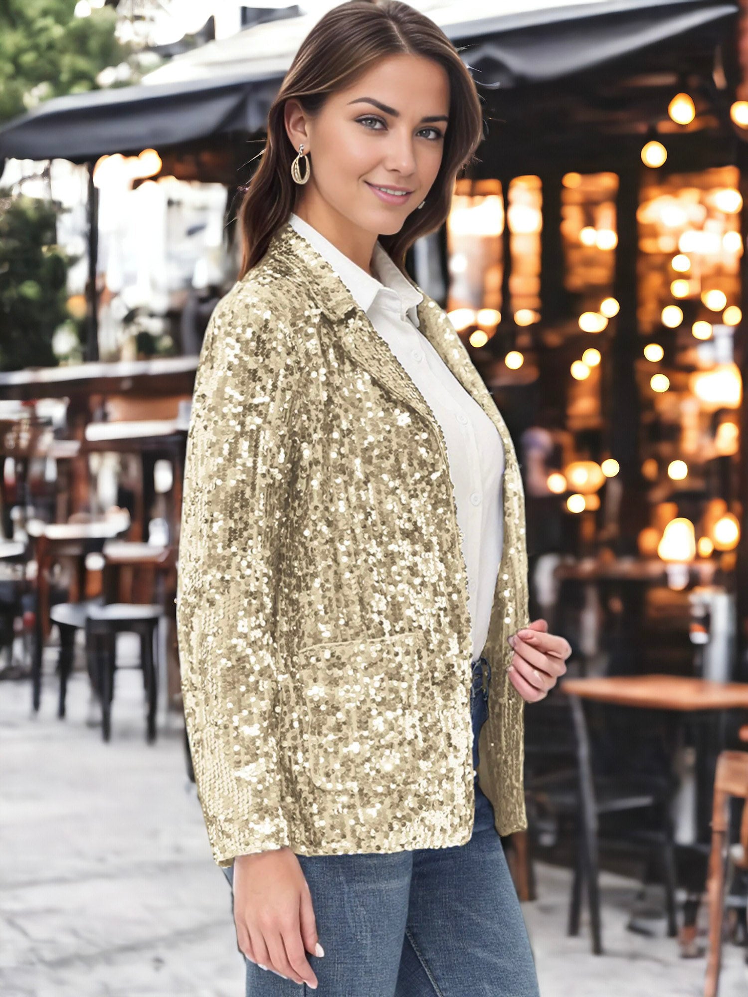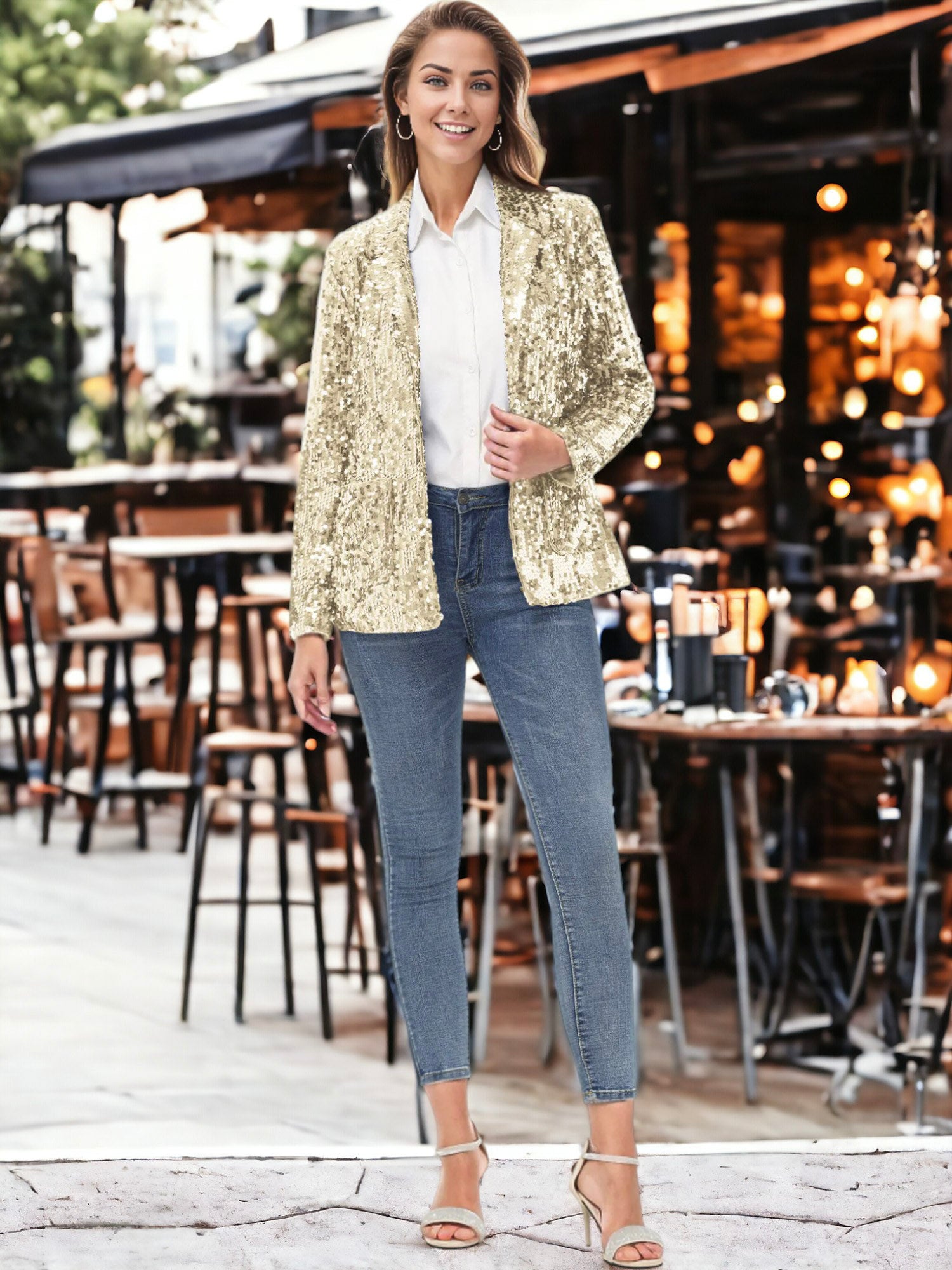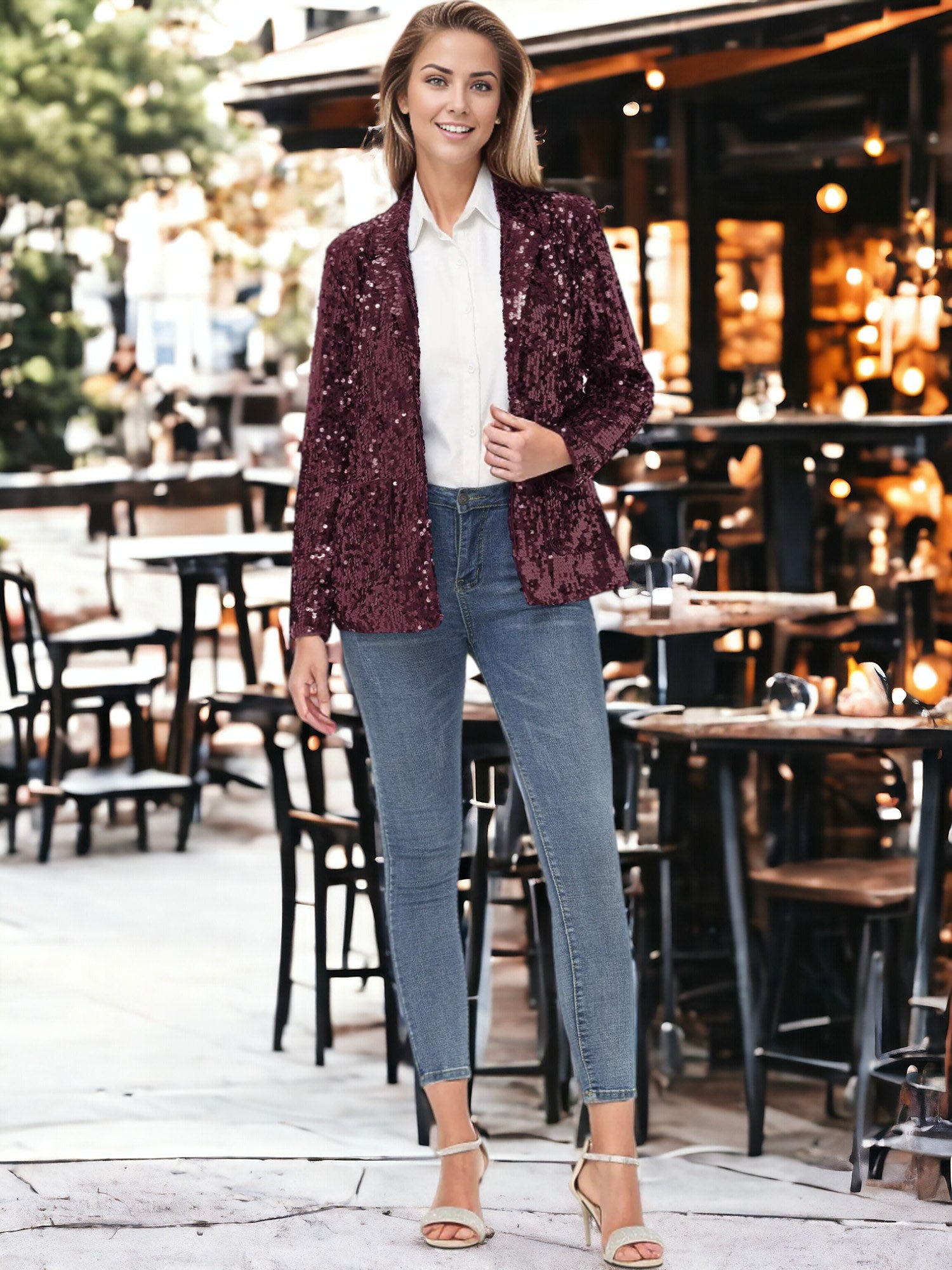 Shine bright in our Glitter Long Sleeve Open Front Sparkle Party Blazer Jacket. This jacket is a perfect blend of sophistication and glamour, designed to elevate your party ensemble. The long sleeves and open front, adorned with sparkling glitter, make it a statement piece for any special occasion. Whether it's a night out on the town or a festive celebration, this blazer adds a touch of dazzle to your outfit. Embrace the sparkle and turn heads with this glamorous and chic party blazer that's ready to make you the star of the event.