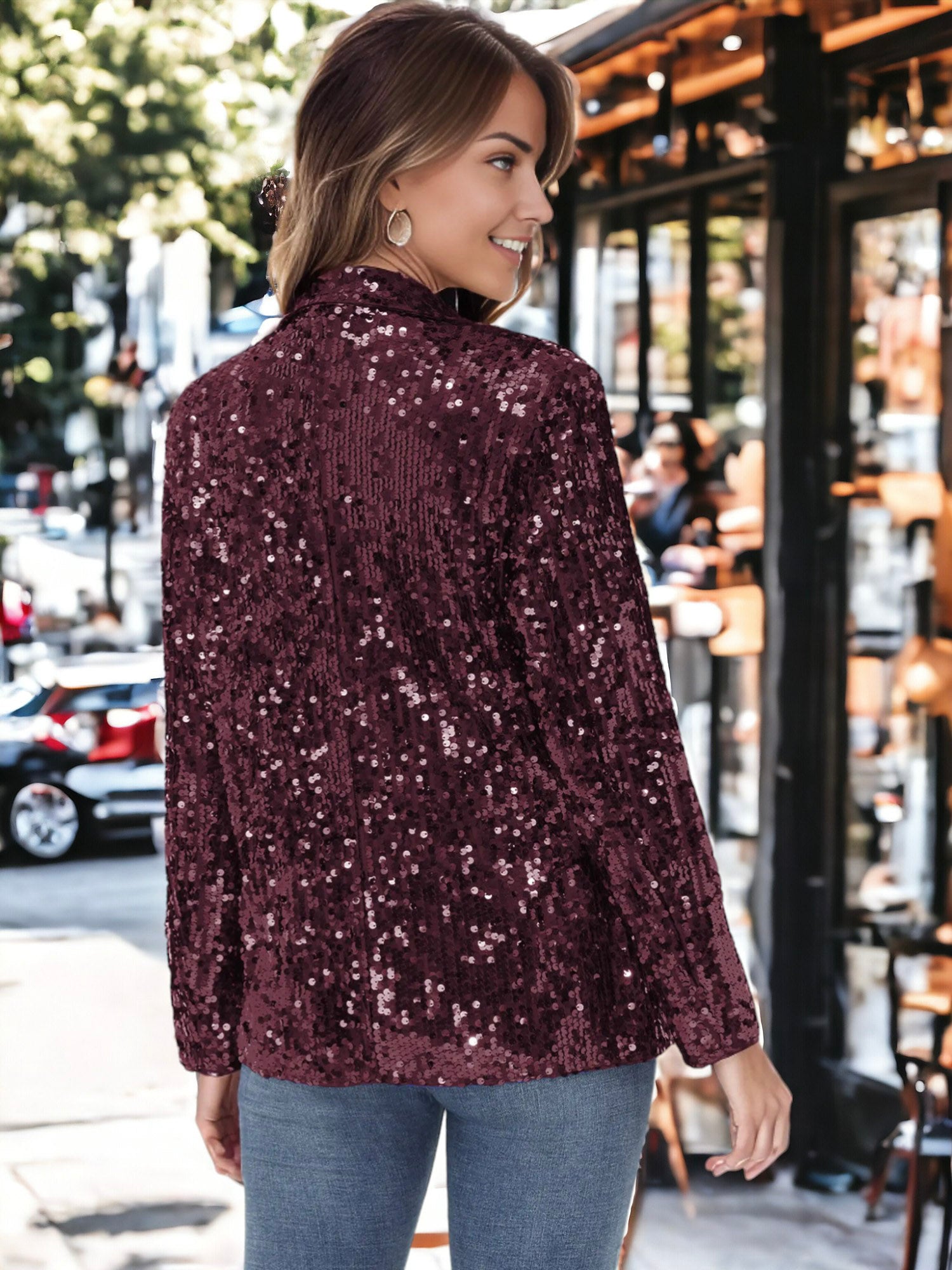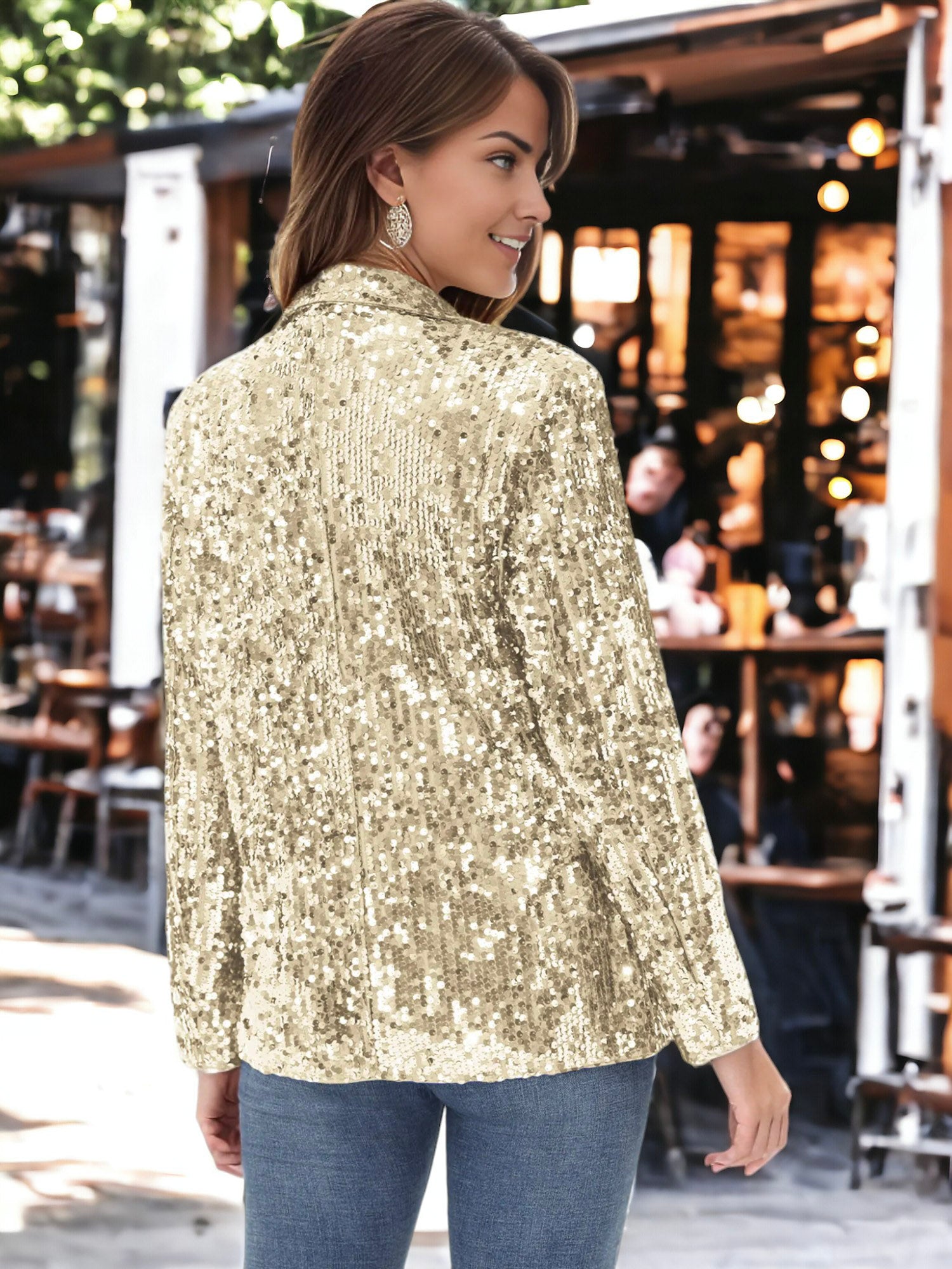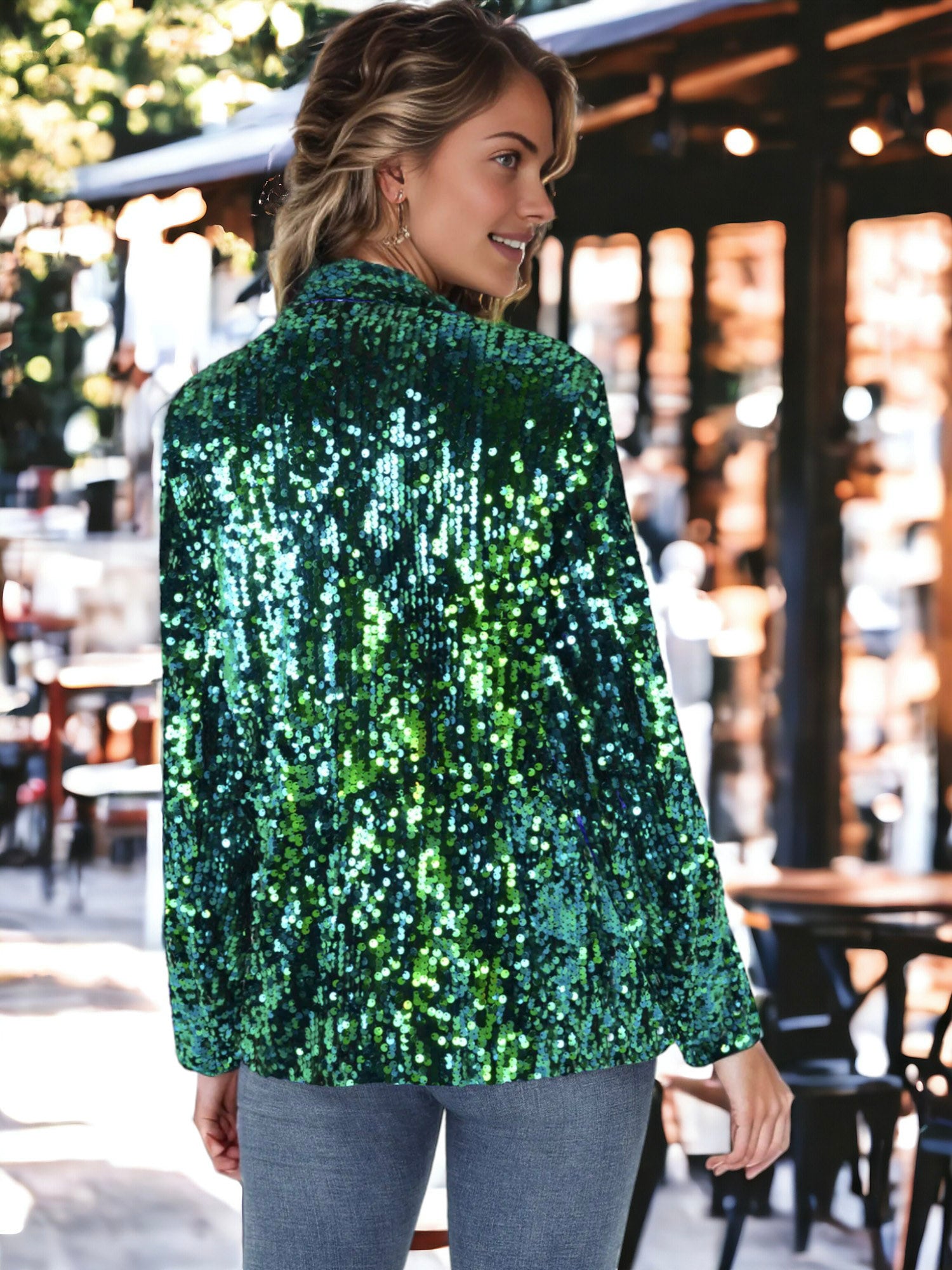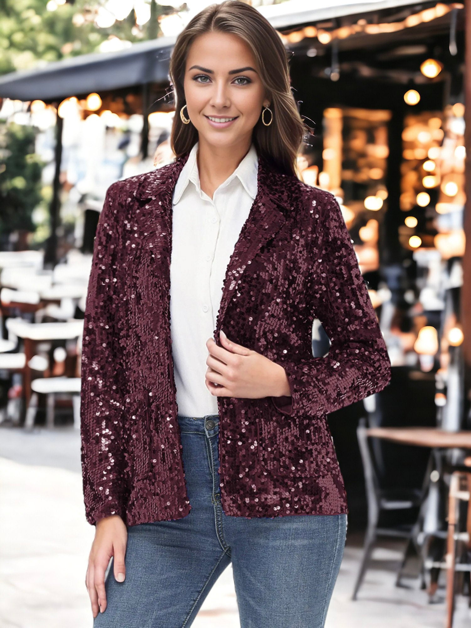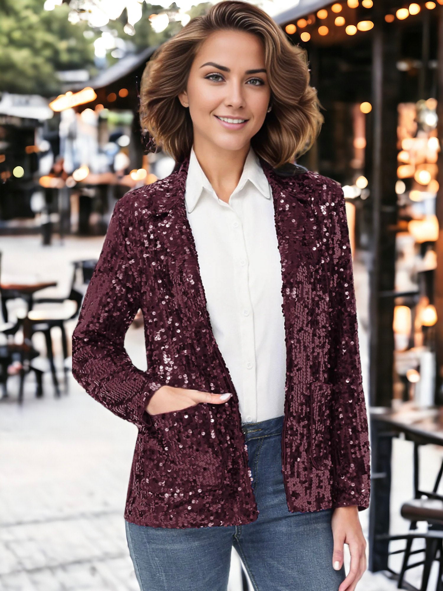 Shine bright in our Glitter Long Sleeve Open Front Sparkle Party Blazer Jacket. This jacket is a perfect blend of sophistication and glamour, designed to elevate your party ensemble. The long sleeves and open front, adorned with sparkling glitter, make it a statement piece for any special occasion. Whether it's a night out on the town or a festive celebration, this blazer adds a touch of dazzle to your outfit. Embrace the sparkle and turn heads with this glamorous and chic party blazer that's ready to make you the star of the event.