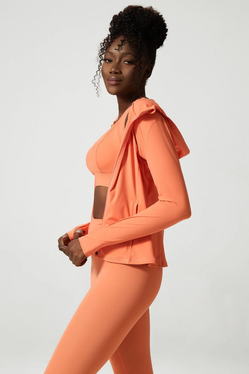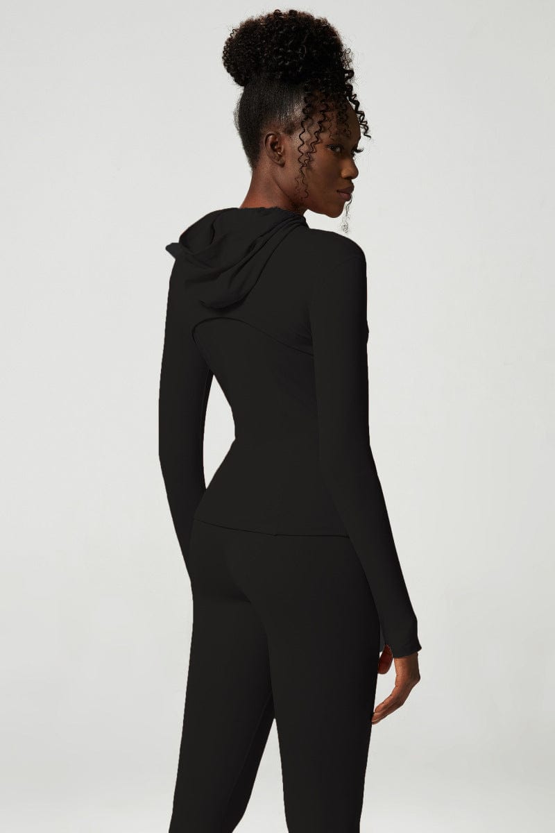 The Anna-Kaci jacket is detailed with defining body contour seams, full length sleeves, and two front pockets. Features a full zipper closure, hood, thumbholes, hip length, and a vented upper back panel for breathability. This buttery soft, light-weight, quick-drying, flattering jacket is perfect for every day wear, or to throw on before your morning hike or run for extra warmth.