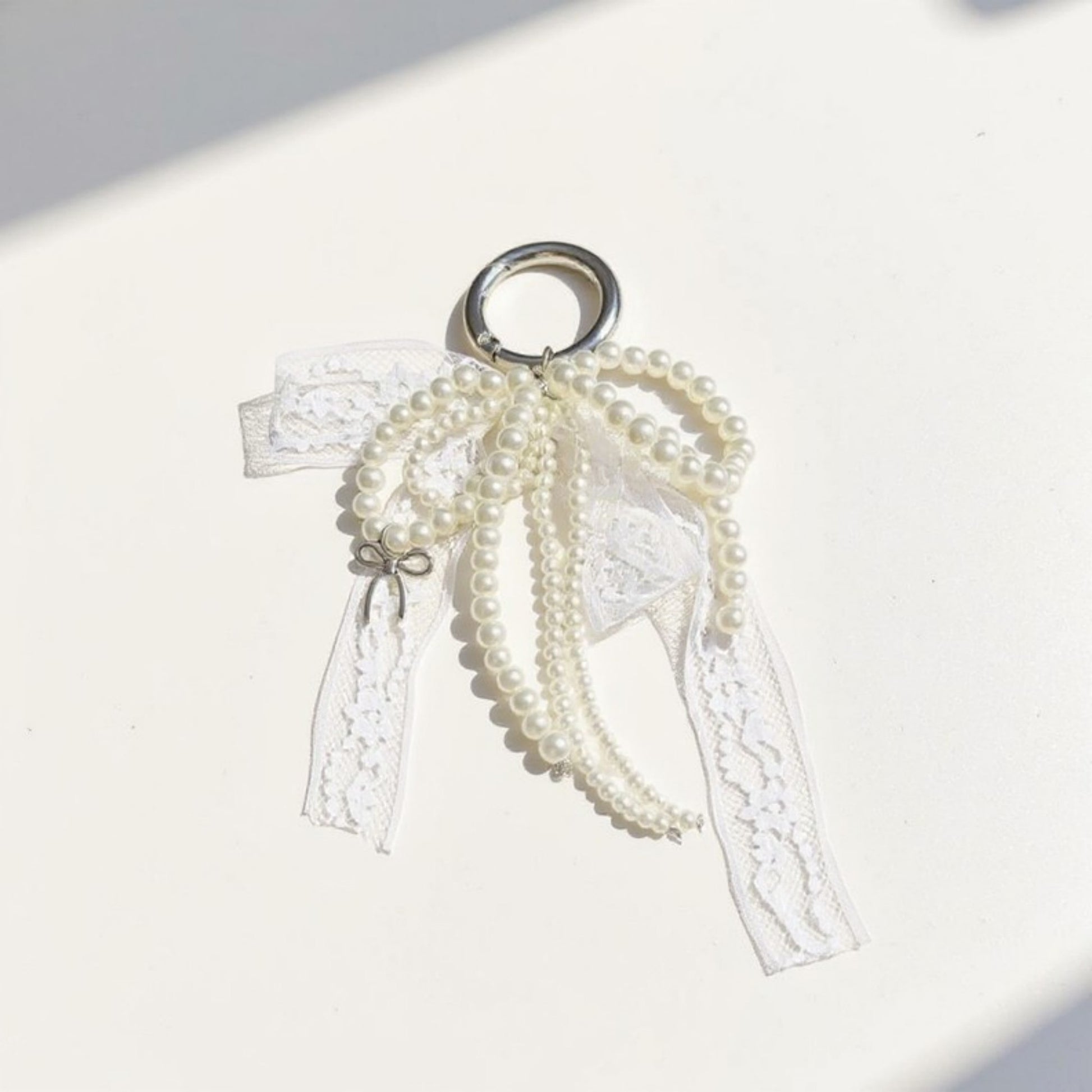 Anna-Kaci Pearl and Lace Bow Keychain with Silver Ring and Charm Accent