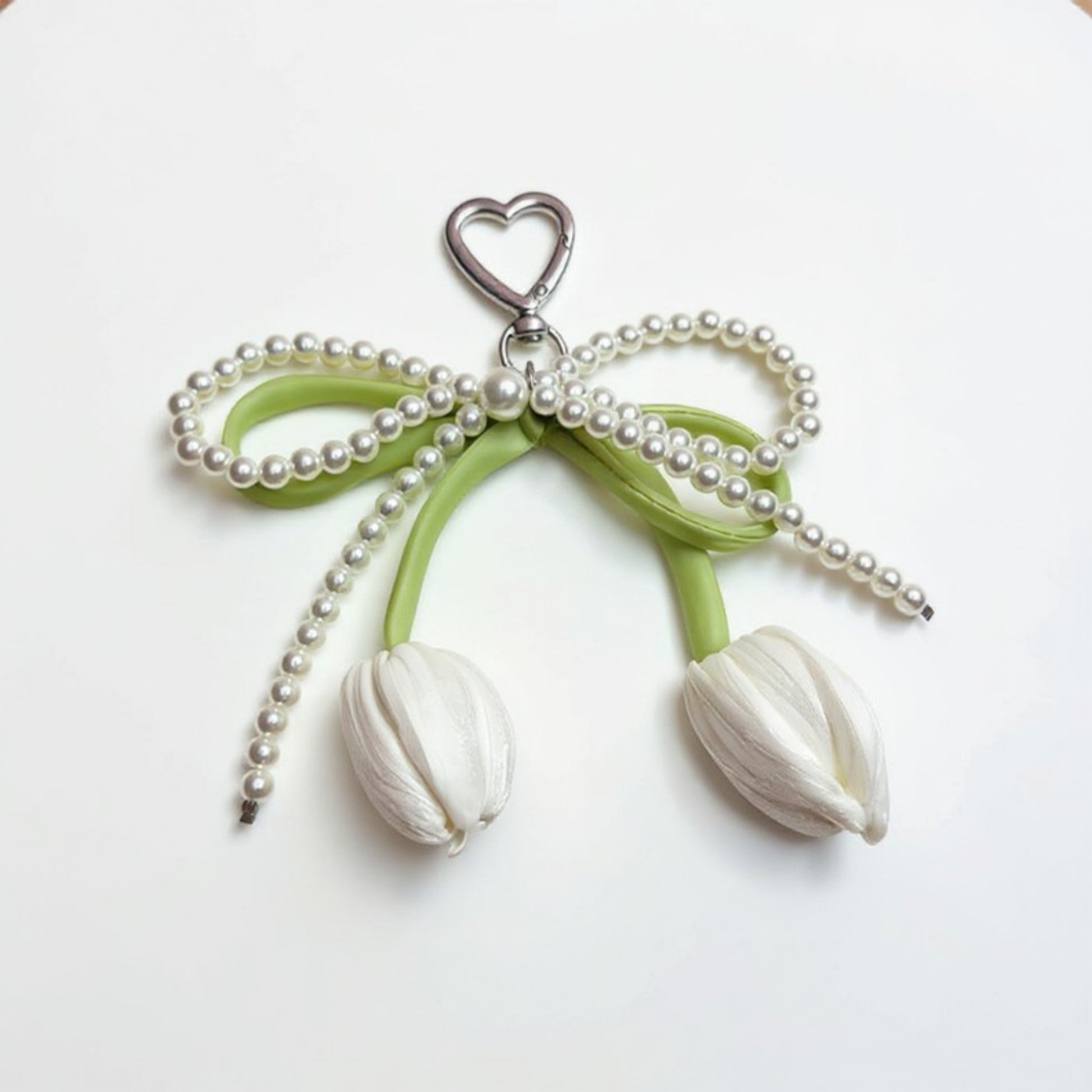 Anna-Kaci Pearl Bow Keychain with Satin Tulip Charms and Ribbon Accent