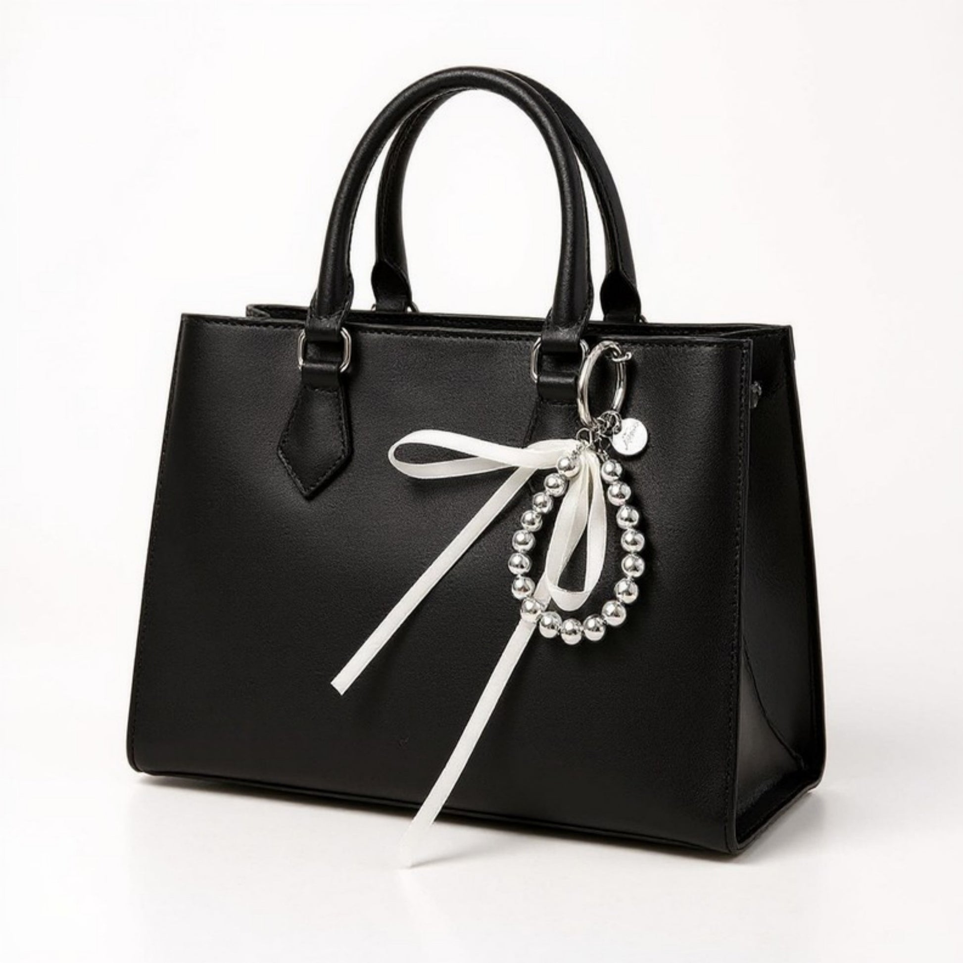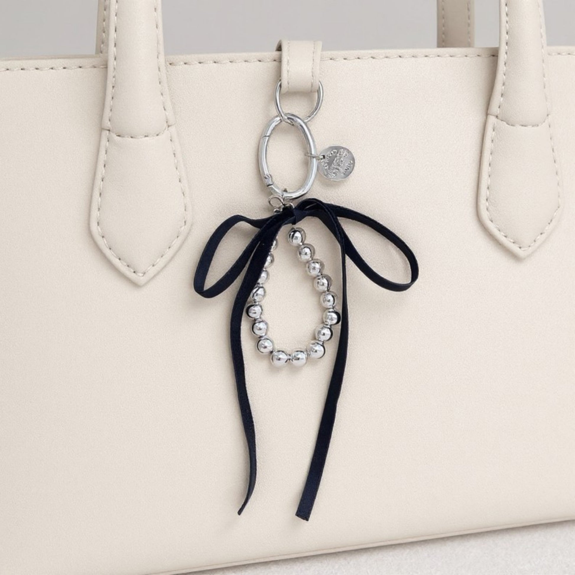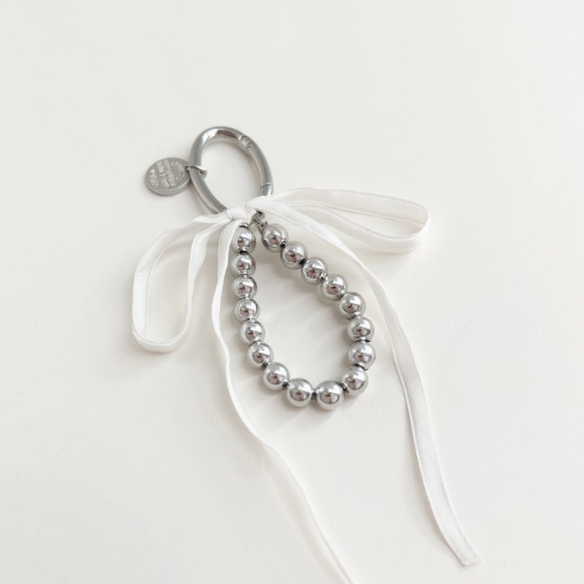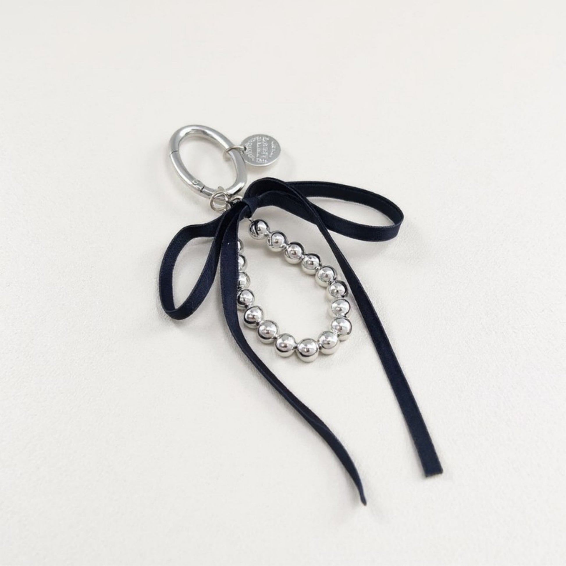 Anna-Kaci Silver Bead Charm Keychain with Velvet Ribbon Bow