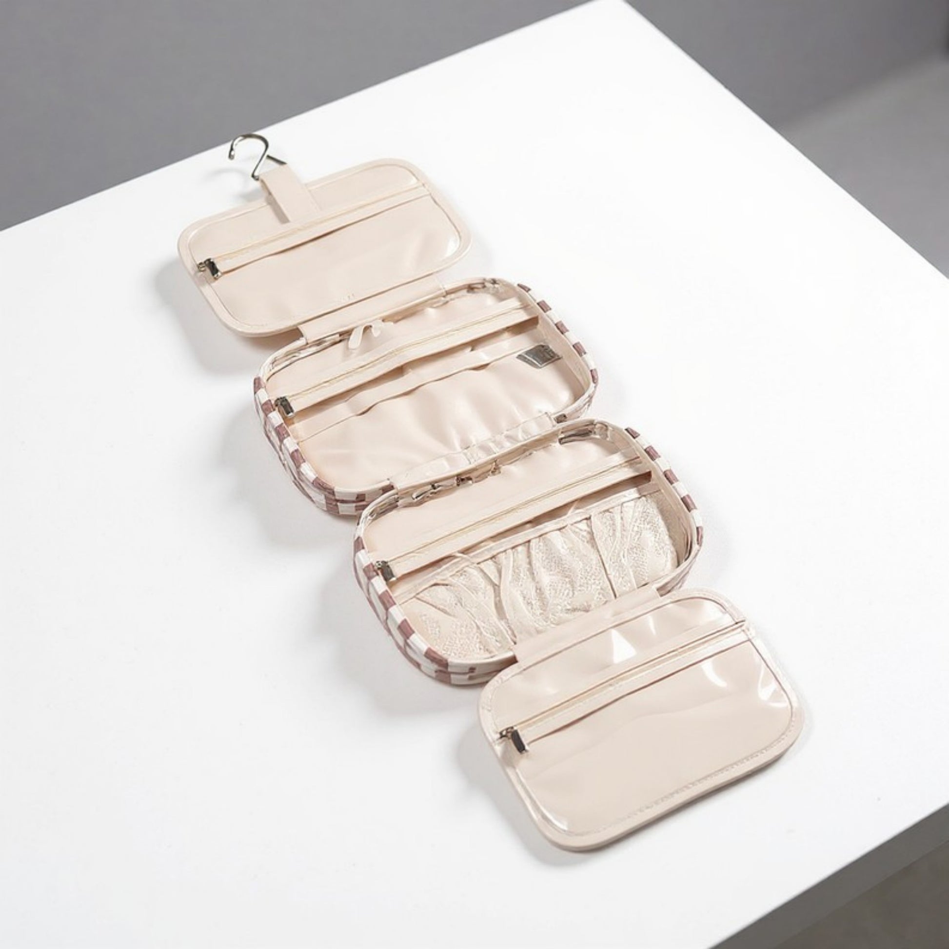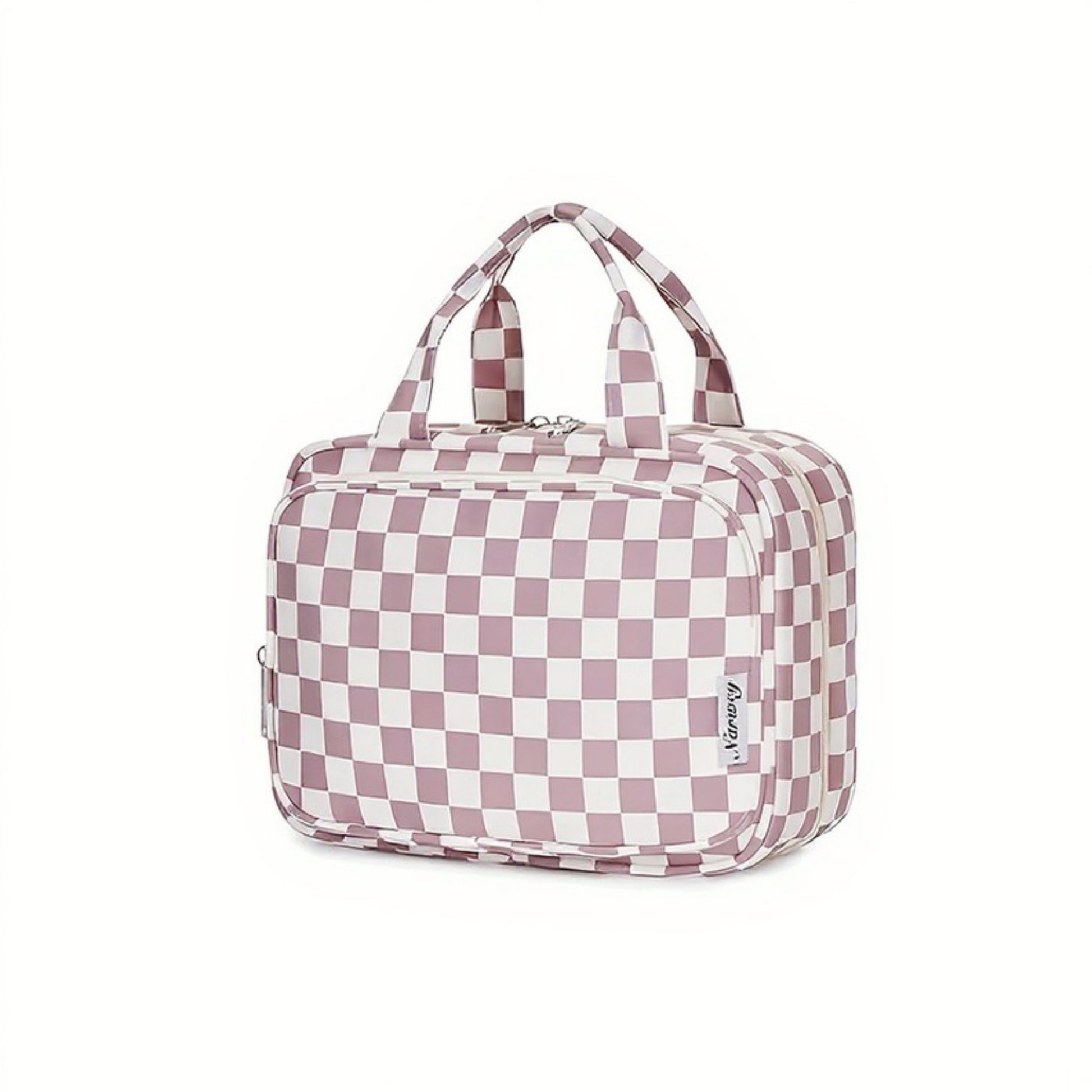 The Anna-Kaci Hanging Toiletry Bag combines practicality with modern style in a chic checkered design. Featuring multiple compartments with transparent zip pockets and mesh dividers, it keeps your toiletries, skincare, and cosmetics organized and easy to find. The built-in hook allows you to hang it conveniently in bathrooms or closets, while sturdy handles make it easy to carry. Crafted from durable, water-resistant material, this bag is perfect for travel, gym, or daily use.