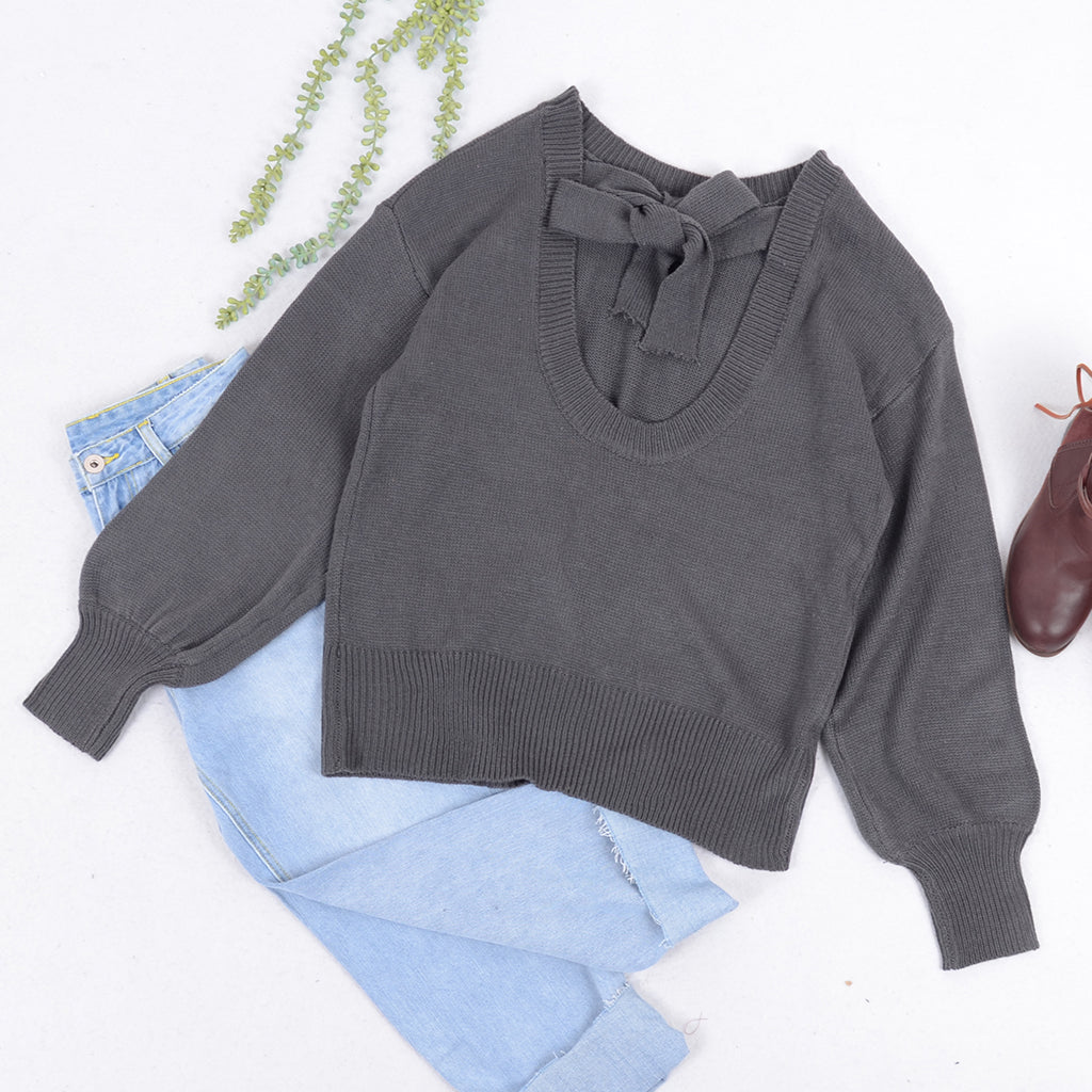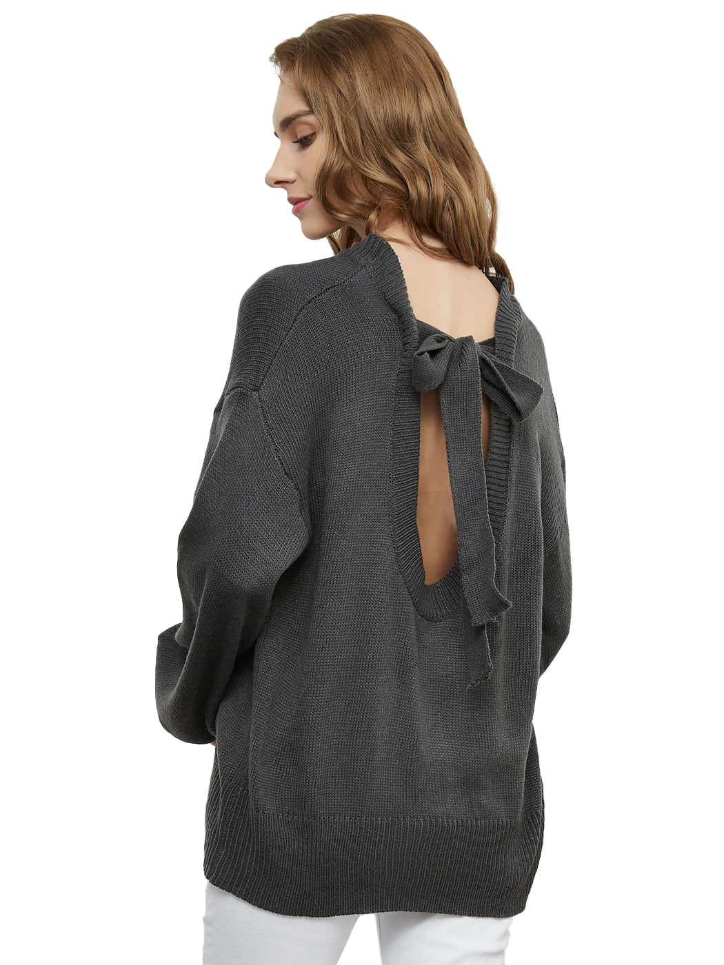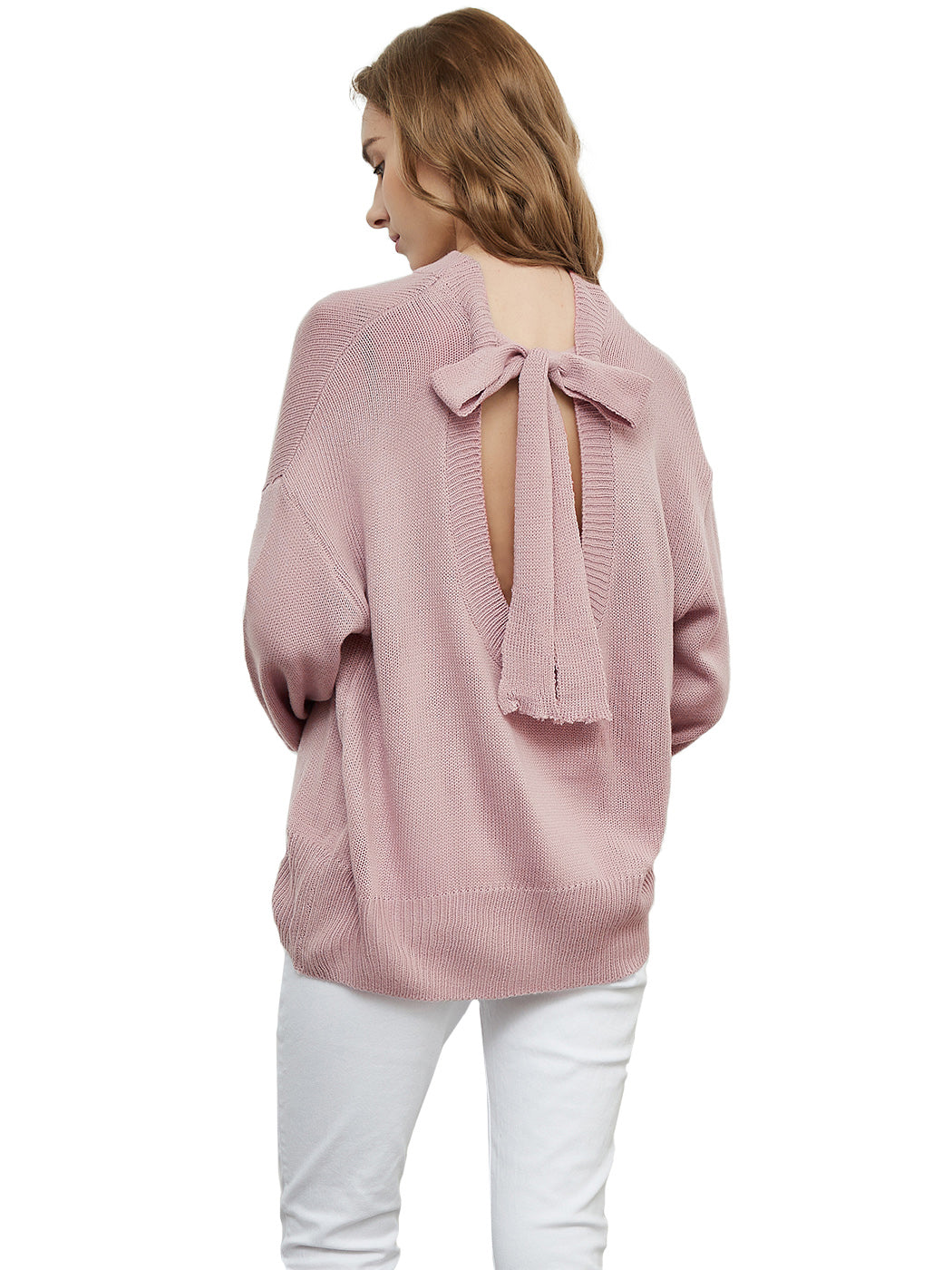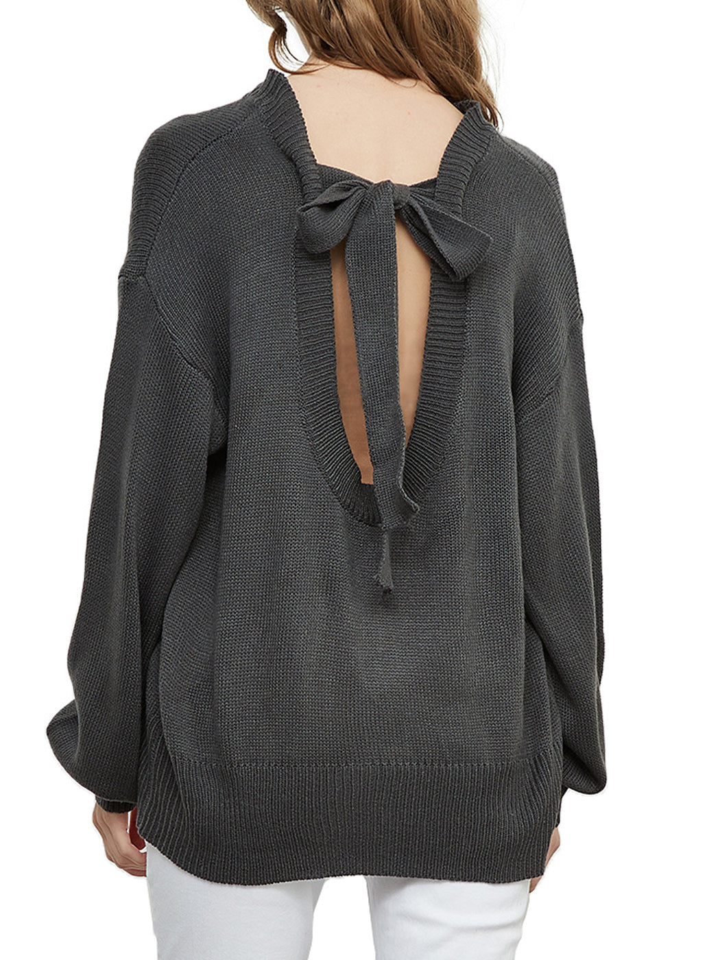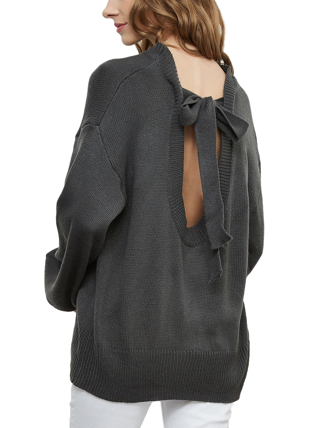 The Anna-Kaci long sleeve knitted sweater is detailed with an incredibly gorgeous tied bow open back design. Features knitted fibers to give it the chunky warm feel, relaxed fit silhouette, long sleeves, and round neckline. Warm yet lightweight for daily casual wear. Pair with your favorite jeans & boots for a complete fall or winter look.
