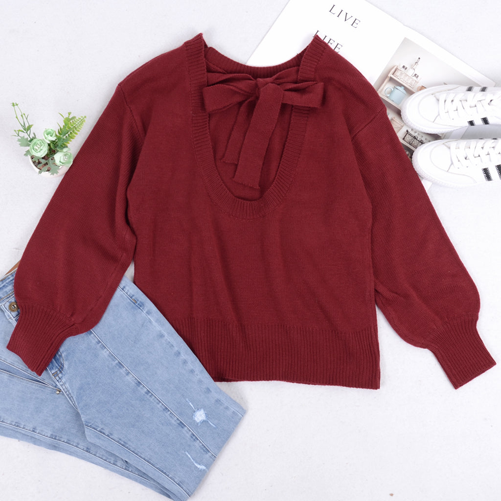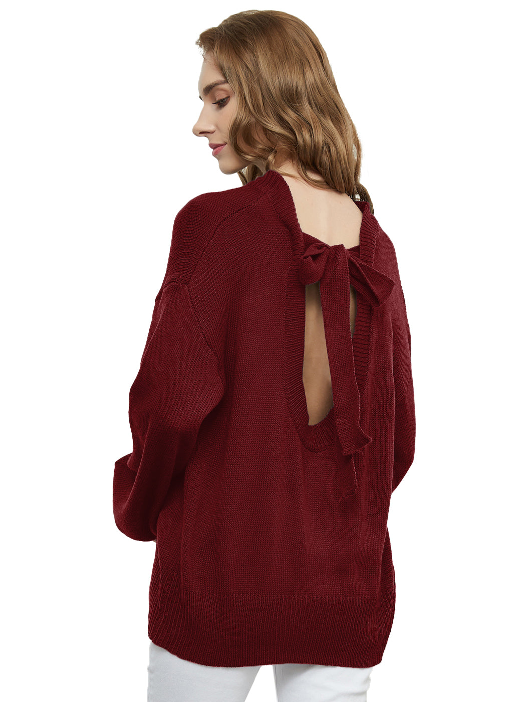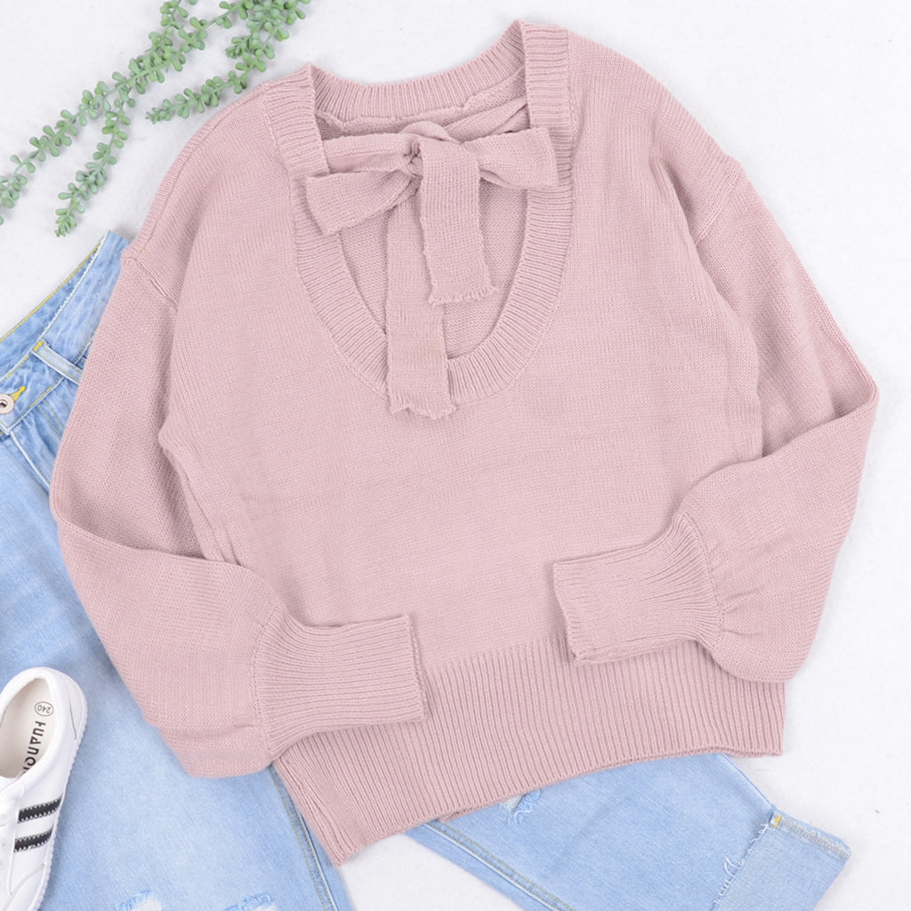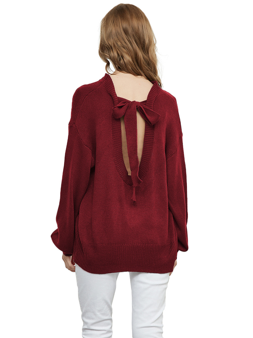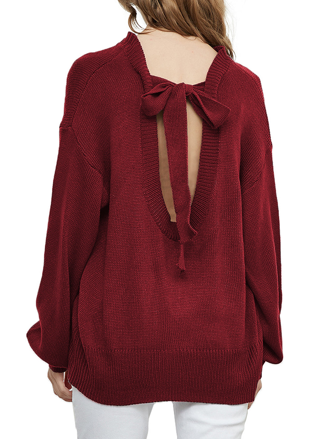 The Anna-Kaci long sleeve knitted sweater is detailed with an incredibly gorgeous tied bow open back design. Features knitted fibers to give it the chunky warm feel, relaxed fit silhouette, long sleeves, and round neckline. Warm yet lightweight for daily casual wear. Pair with your favorite jeans & boots for a complete fall or winter look.