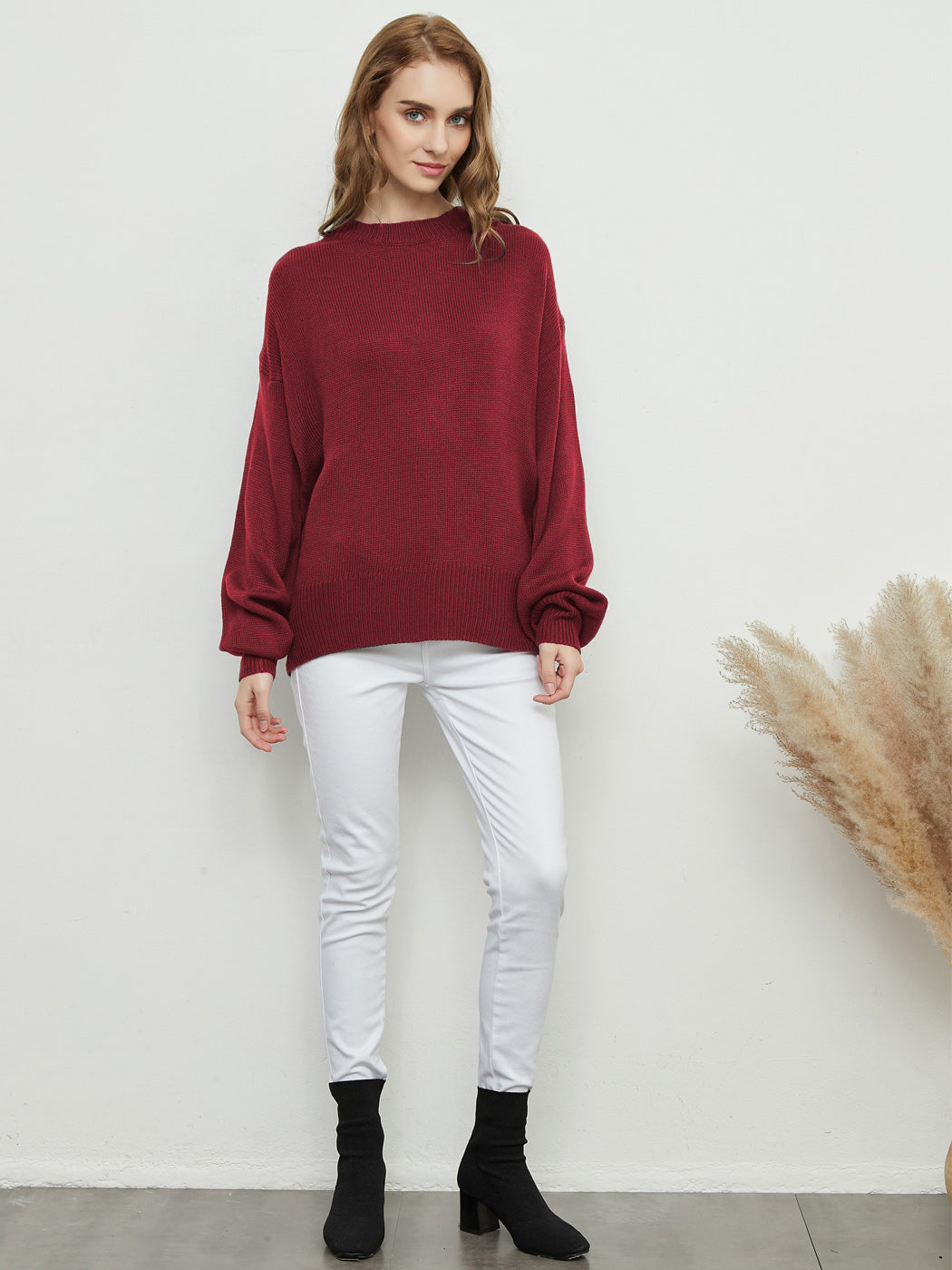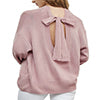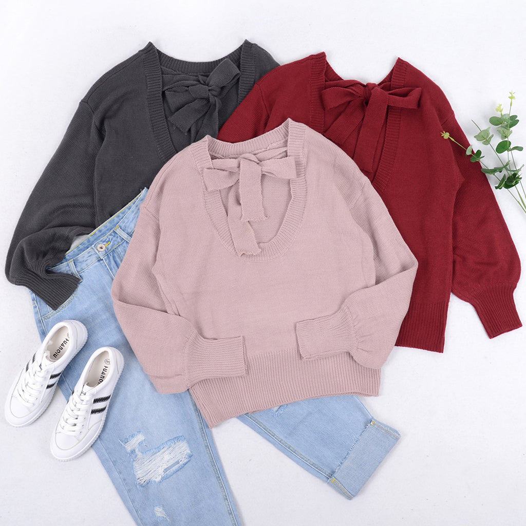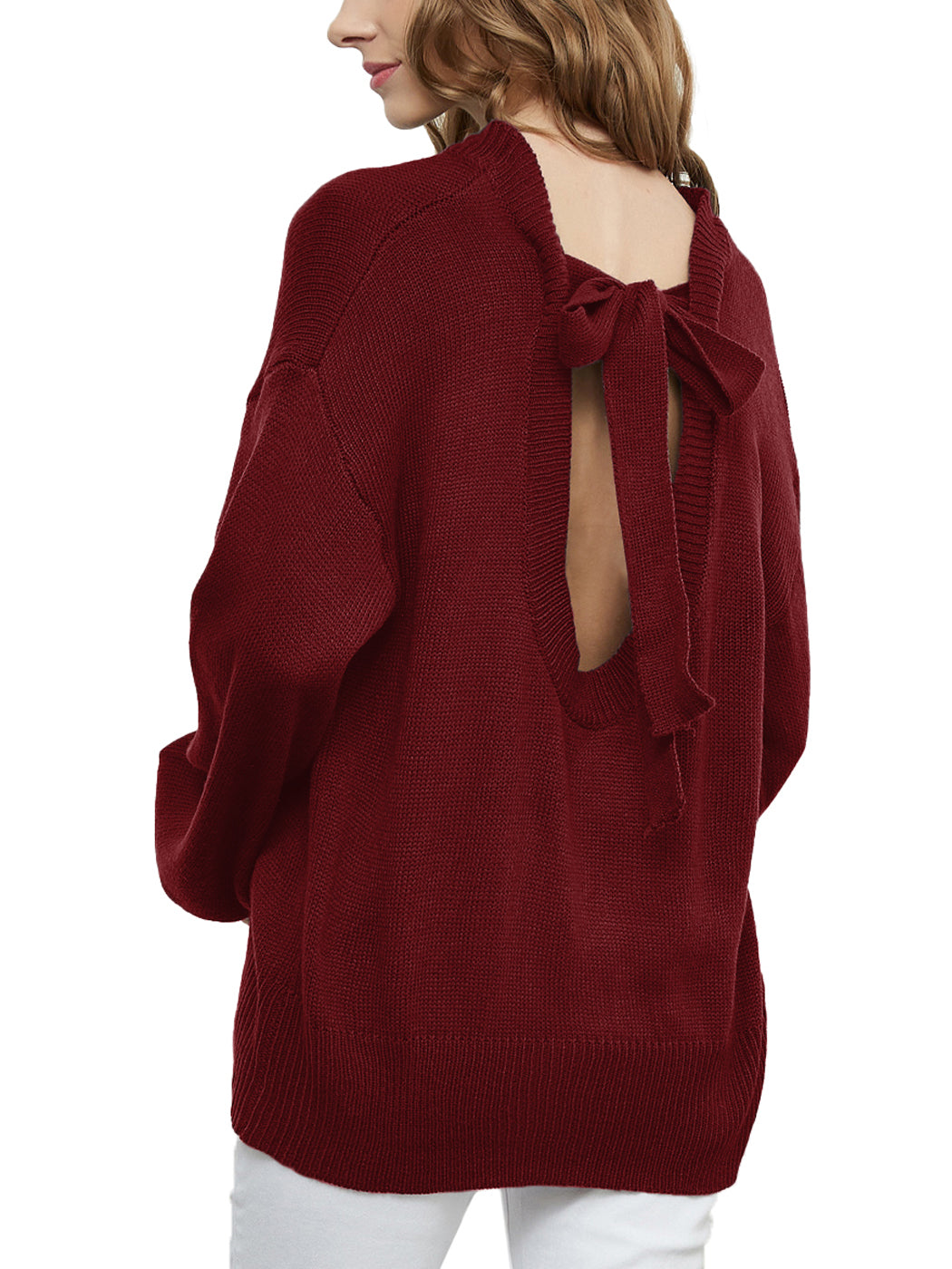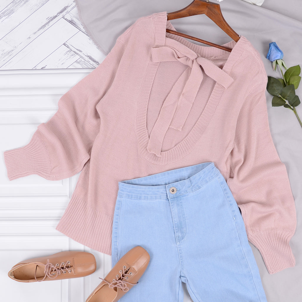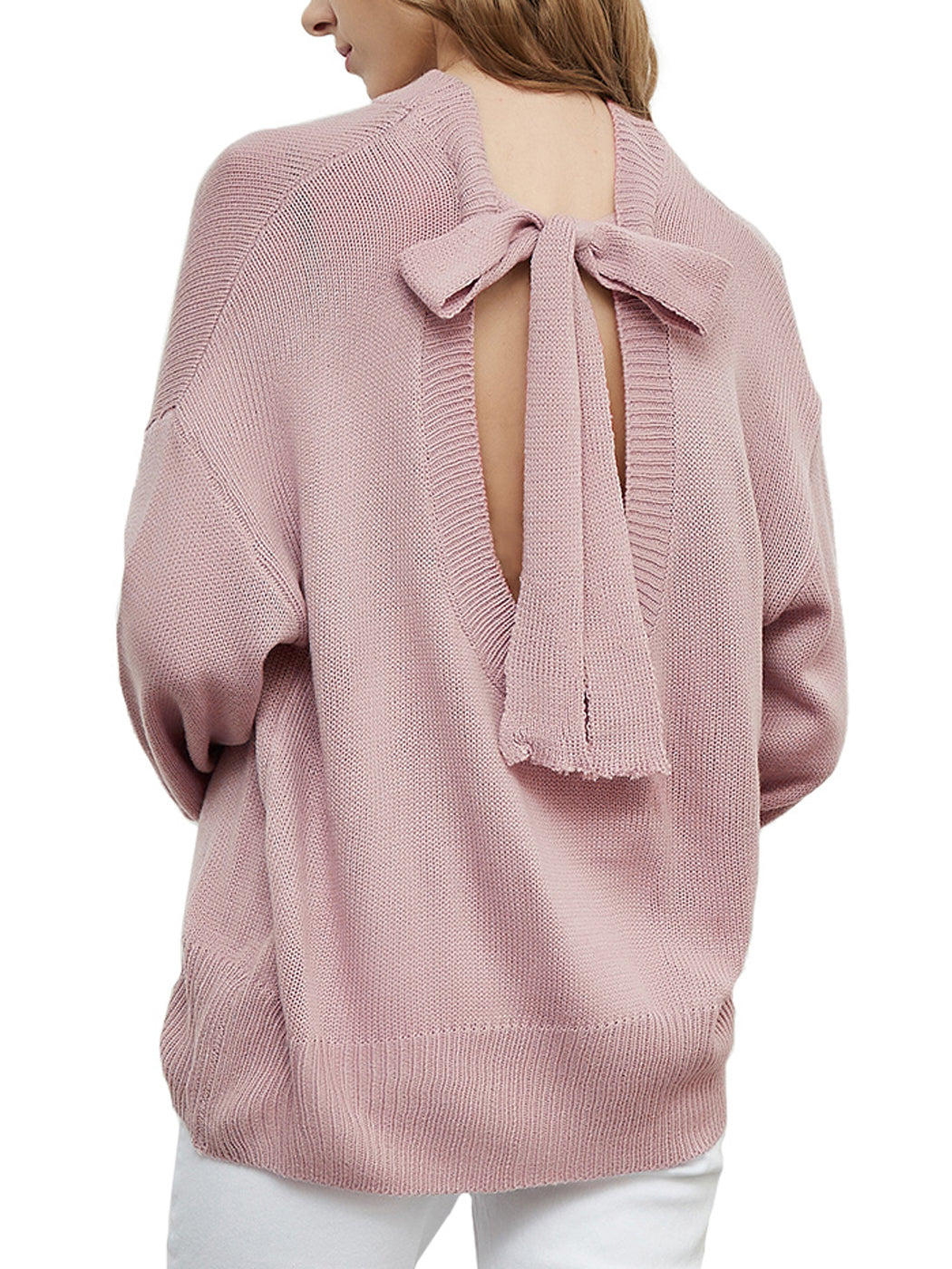 The Anna-Kaci long sleeve knitted sweater is detailed with an incredibly gorgeous tied bow open back design. Features knitted fibers to give it the chunky warm feel, relaxed fit silhouette, long sleeves, and round neckline. Warm yet lightweight for daily casual wear. Pair with your favorite jeans & boots for a complete fall or winter look.