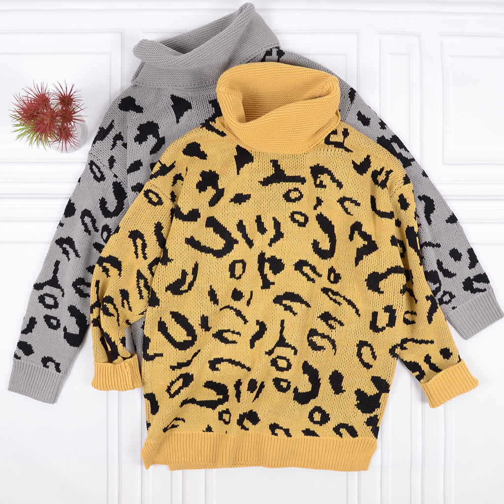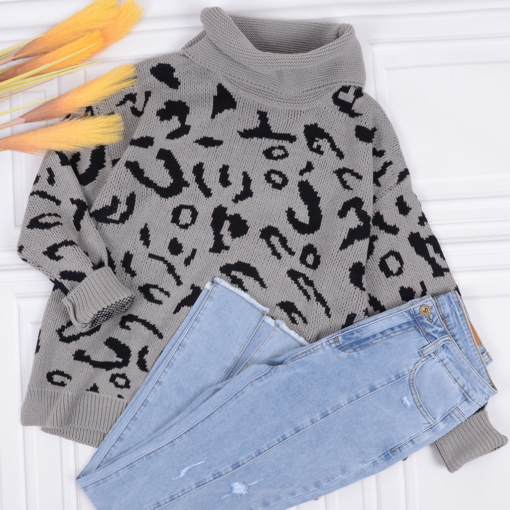 The Anna-Kaci sweater is detailed with a bold leopard print that will be a talking piece all day long. Features a loose high neck, drop shoulder, long sleeves, knitted texture, and an oversized fit. Style it with a black leather skirt and knee-high boots for a dazzling look this season.