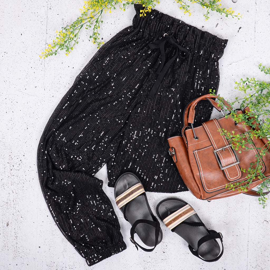 The Anna-Kaci sweatpants are detailed with a dazzling full sequin design. Features a garterized waist and hem, drawstring ribbon detail, loose fit, and above ankle length. Pair it with an oversized sweater and sneakers for a balanced yet glittery fun look.