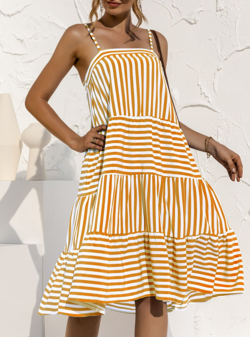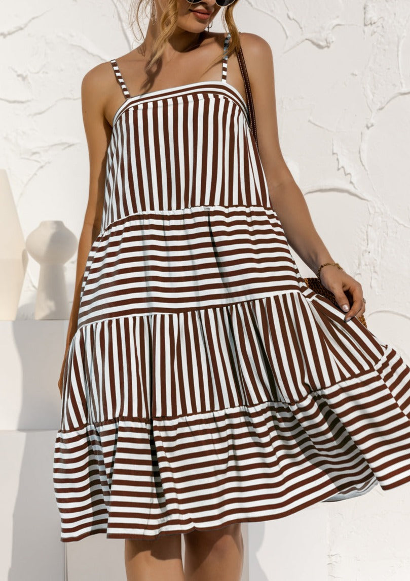 Easily pair this swing dress with your heels or sandals and your best summer accessories. The stripe pattern makes it easy to pair with many accessories and the different directional stripes offer a slimming look.