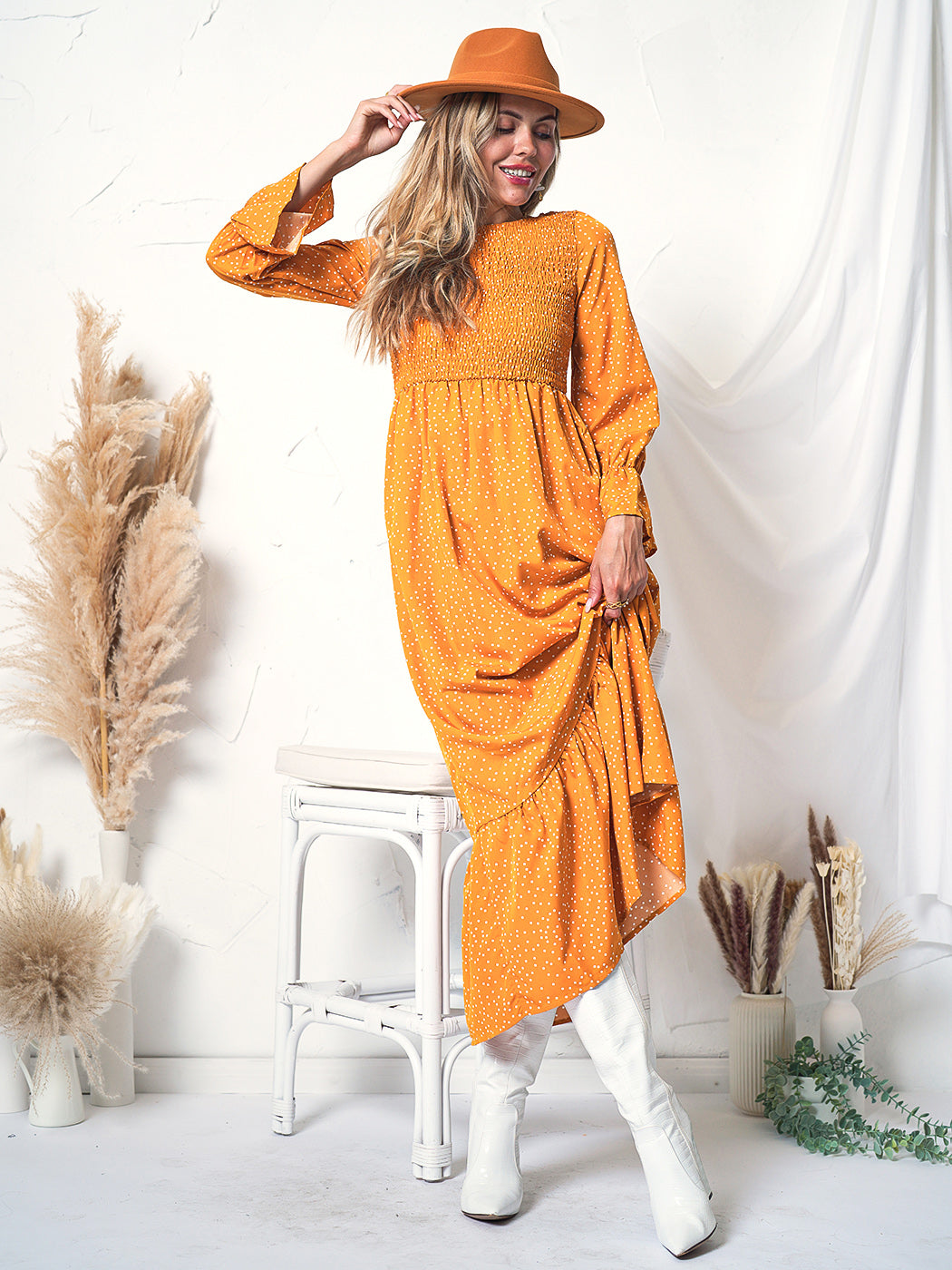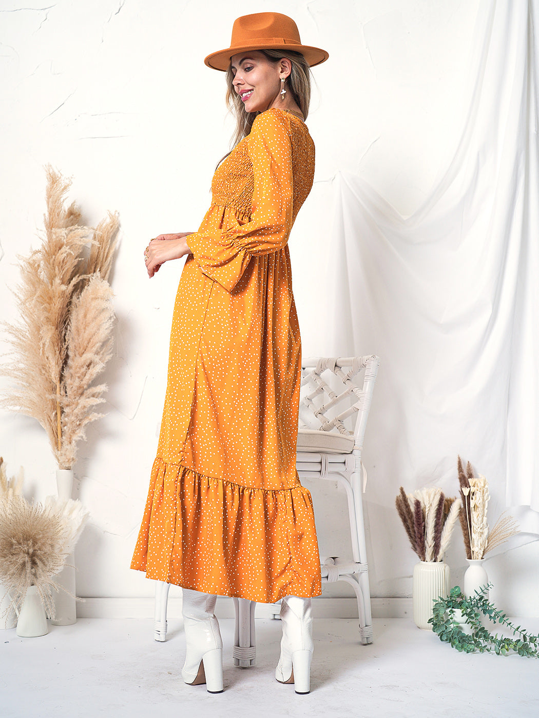 The Anna-Kaci maxi dress is detailed with mini dots or a mixed pattern of floral prints across the entire dress. Features long ruffle sleeves, a smocked chest, round neckline, and ankle-length hem. A perfect casual or semi-formal dinner date dress with the right touch of chic contemporary style. Light and breathable for all day wear as well. Easily pair this dress with your favorite heels, a matching belt, and a clutch.