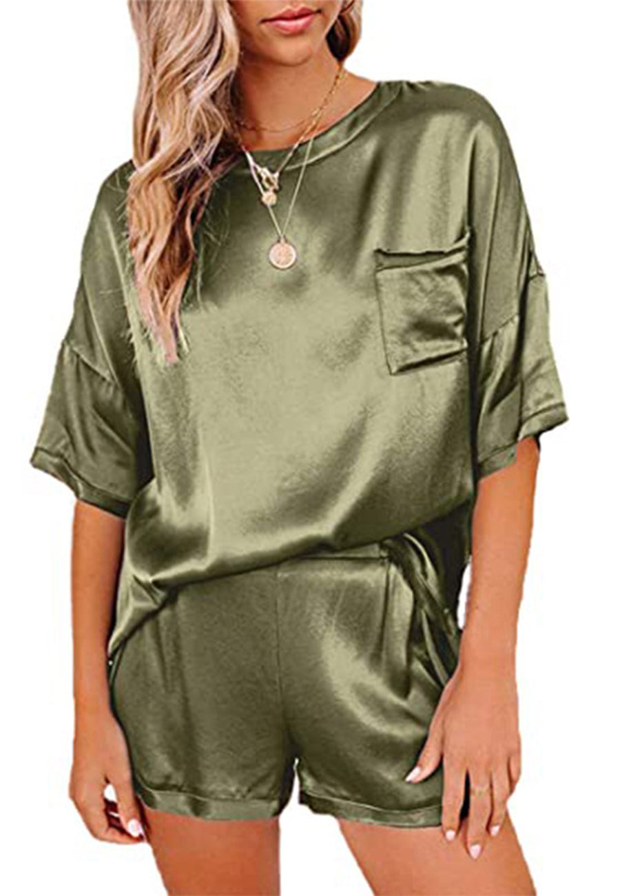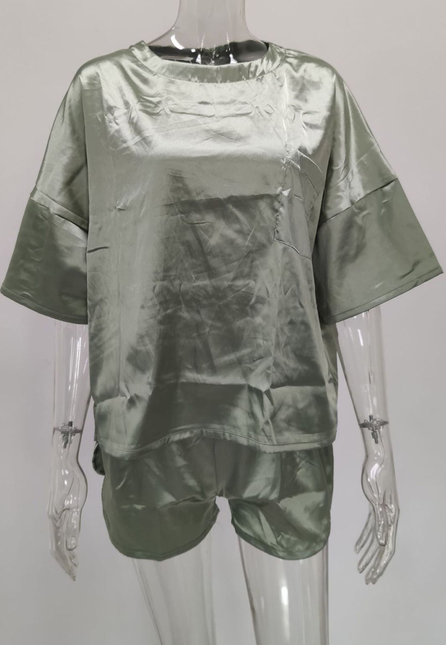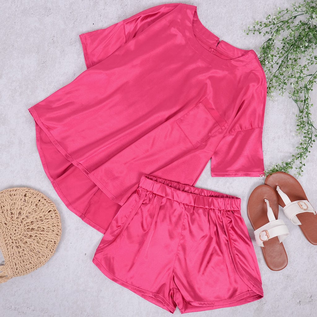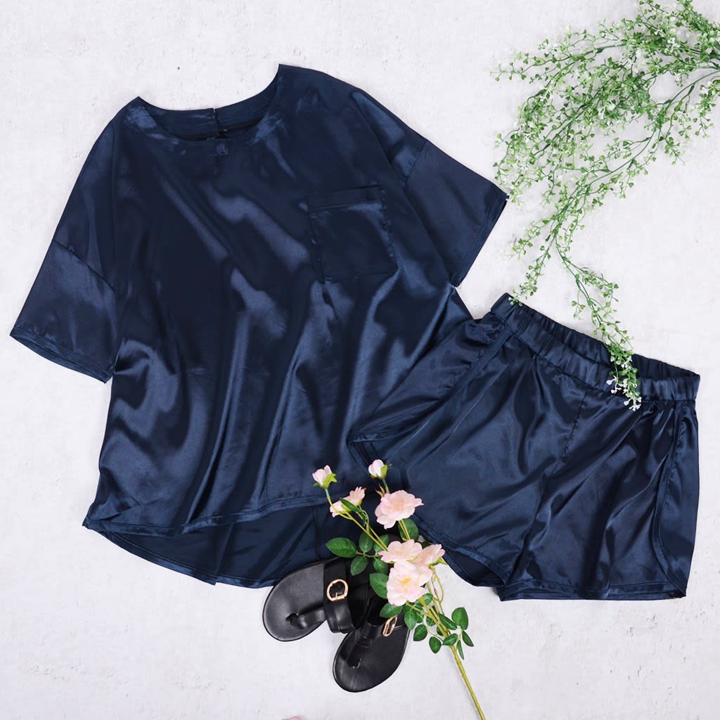 The Anna-Kaci lounge set is detailed with a luxe satin finish. Features a round neck line, short sleeves, and loose fit tee and gartered shorts. Pair it together with fuzzy socks for a comfortable lounge look.