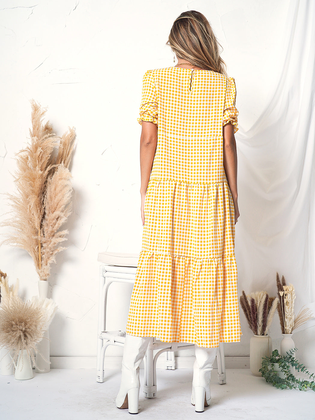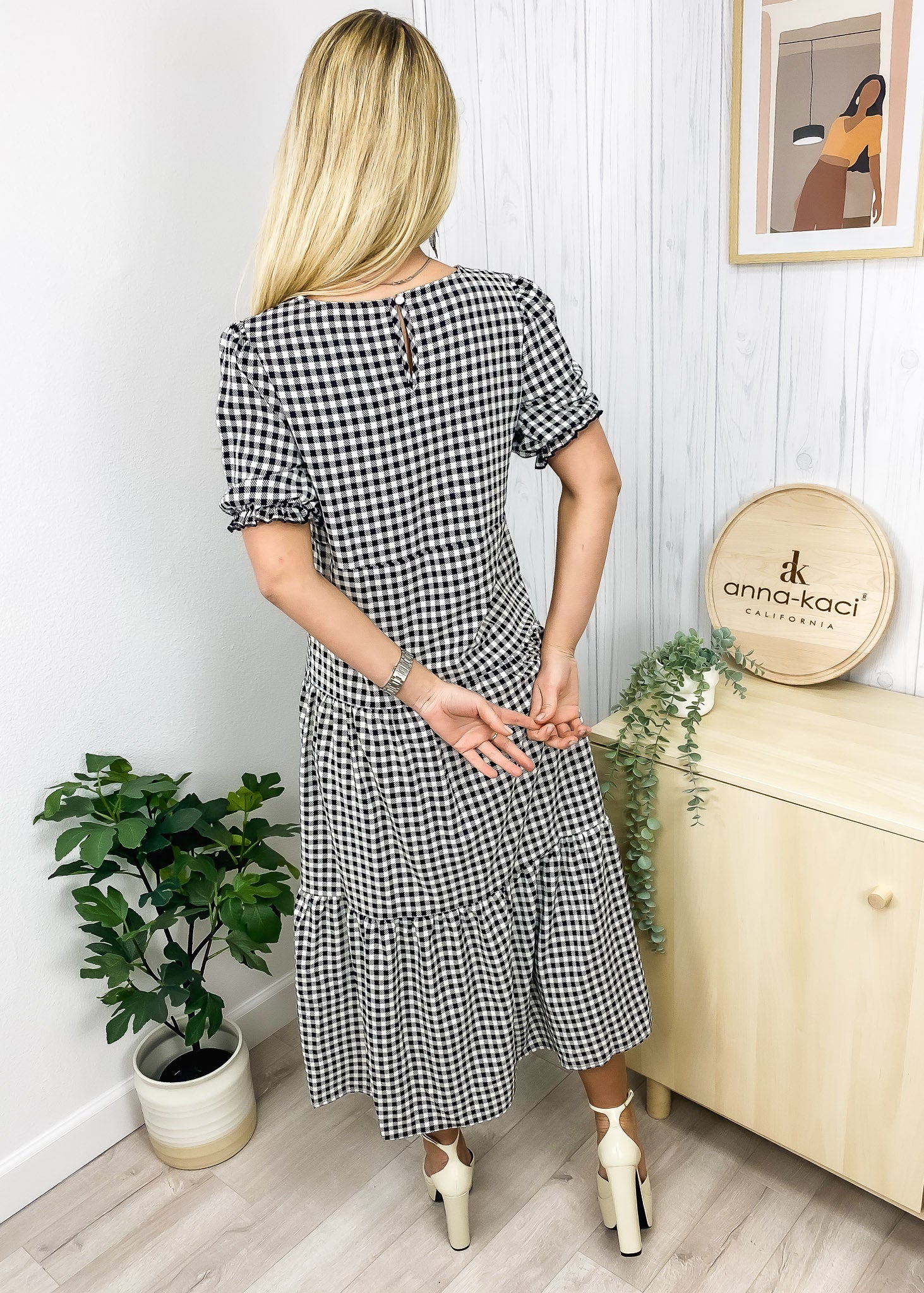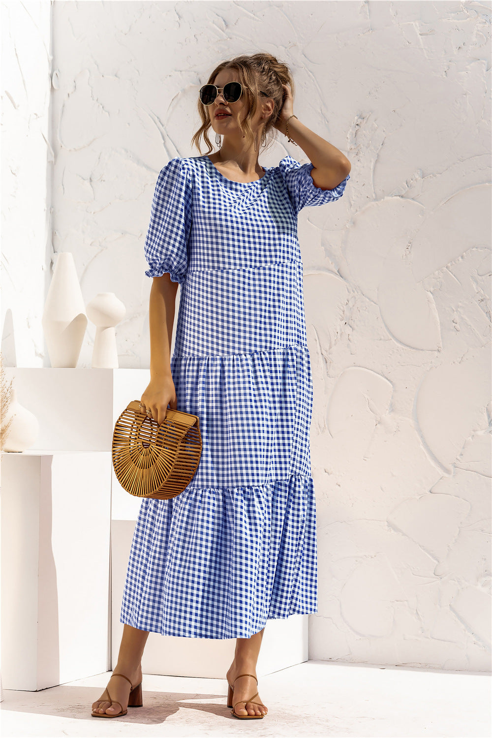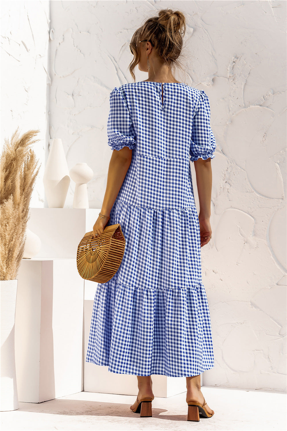 The Anna-Kaci maxi dress is detailed with a unique plaid patterns. Features a round neckline, short sleeves, ankle length hem, and ruffle layered details from top to bottom. Made with 100% soft poly that's light and breathable for casual wear at home or outside on sunny days. Easily pair this dress with your favorite heels, a matching belt, and a summer clutch.