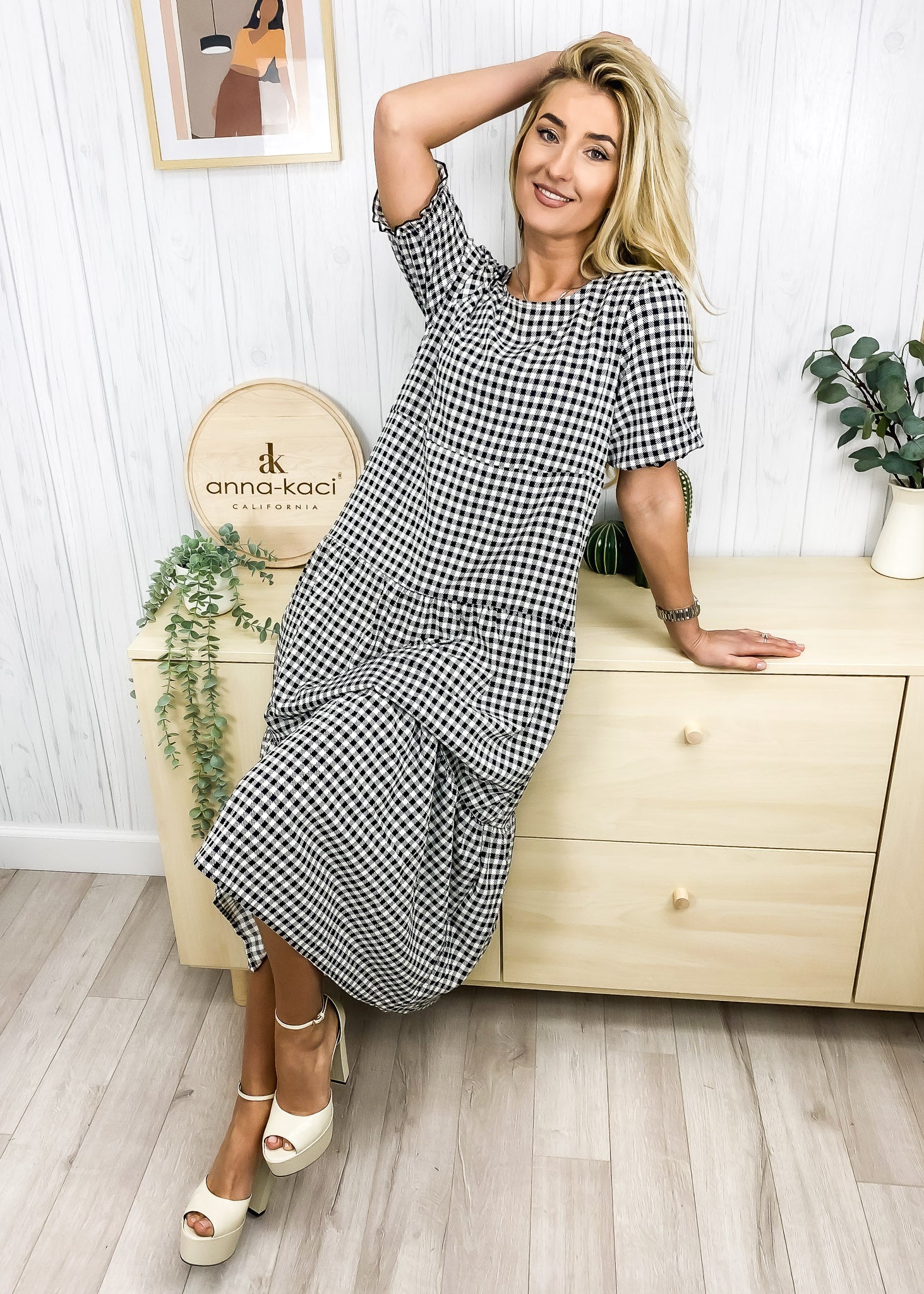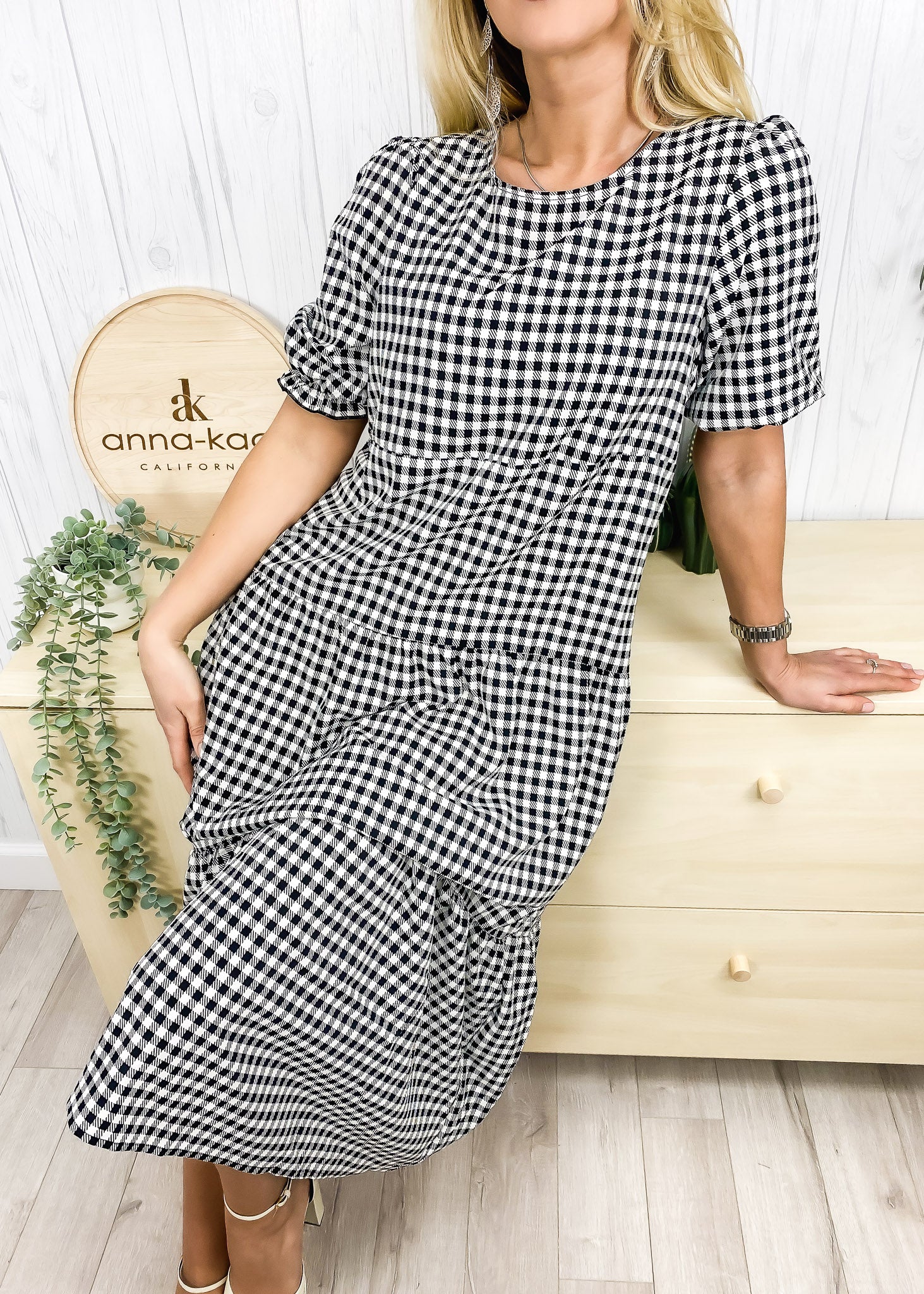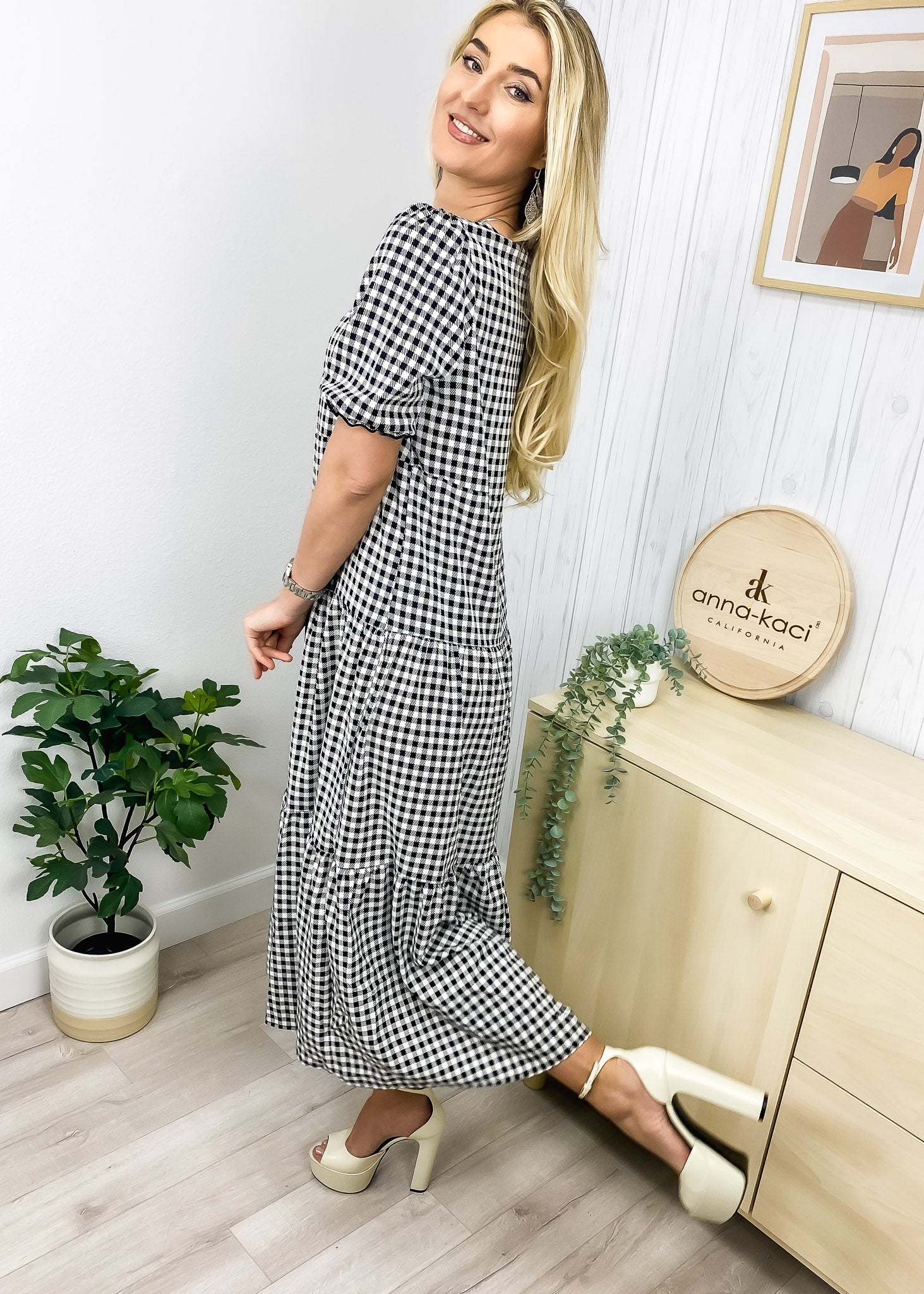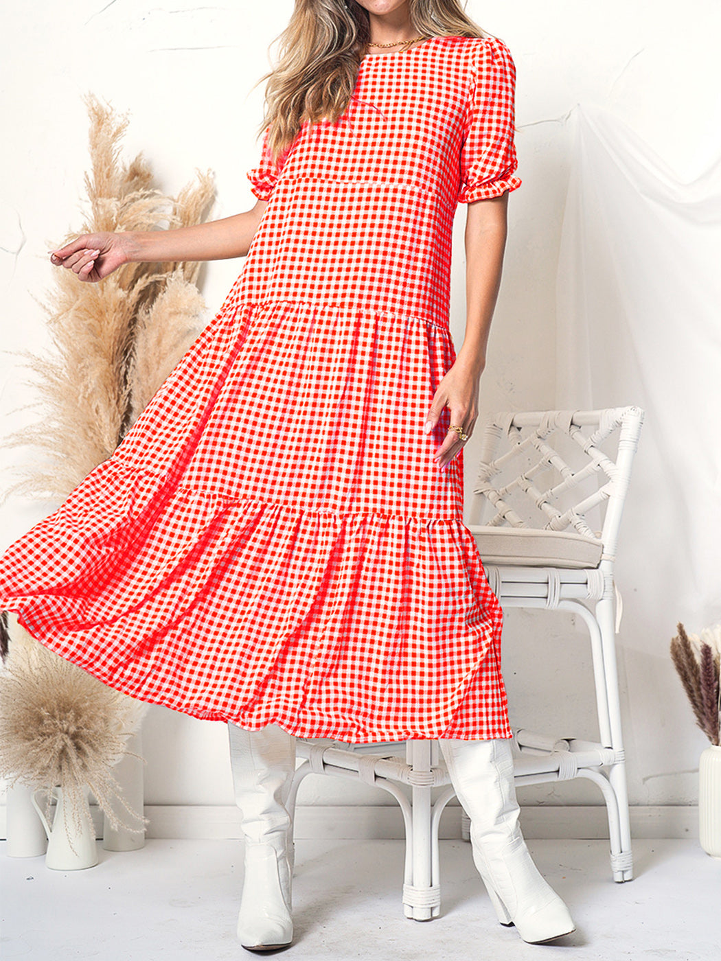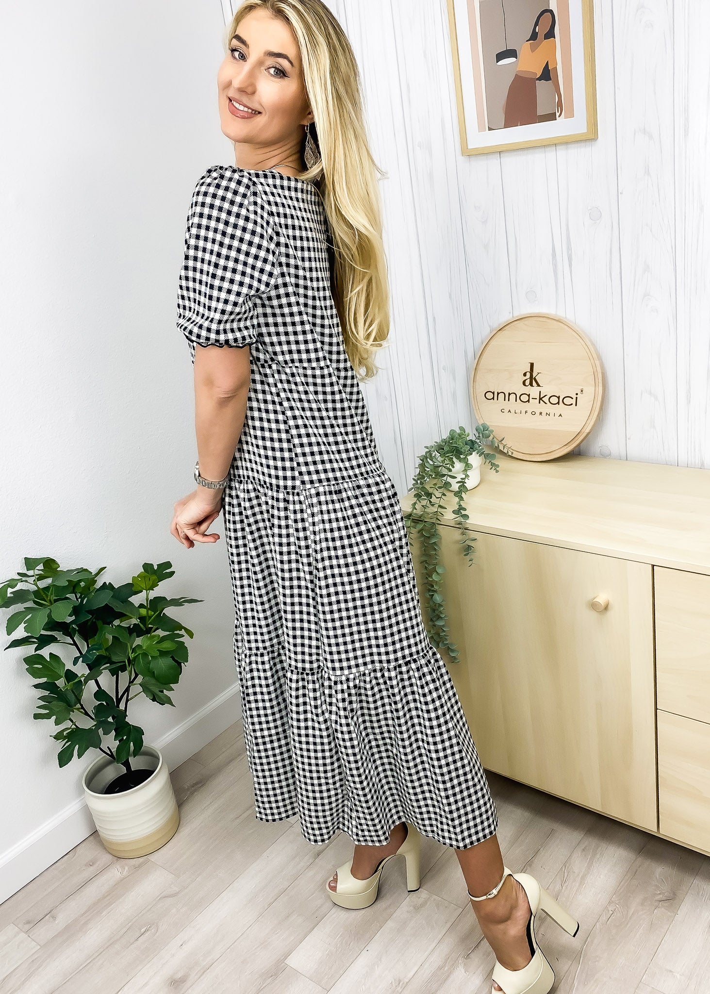 The Anna-Kaci maxi dress is detailed with a unique plaid patterns. Features a round neckline, short sleeves, ankle length hem, and ruffle layered details from top to bottom. Made with 100% soft poly that's light and breathable for casual wear at home or outside on sunny days. Easily pair this dress with your favorite heels, a matching belt, and a summer clutch.
