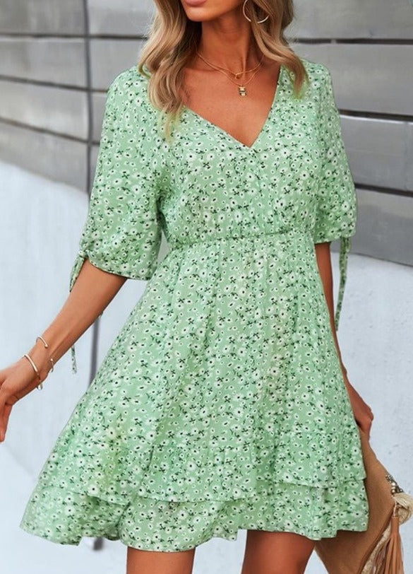 The Anna-Kaci dress is detailed with a unique open sleeve with tie detail. Features a surplice neck line, floral prints, ruffle hem skirt, and above knee length. Pair it with sunnies and sandals for a beautiful look.