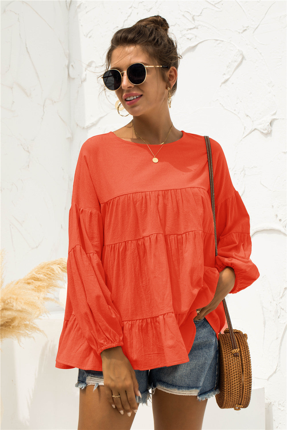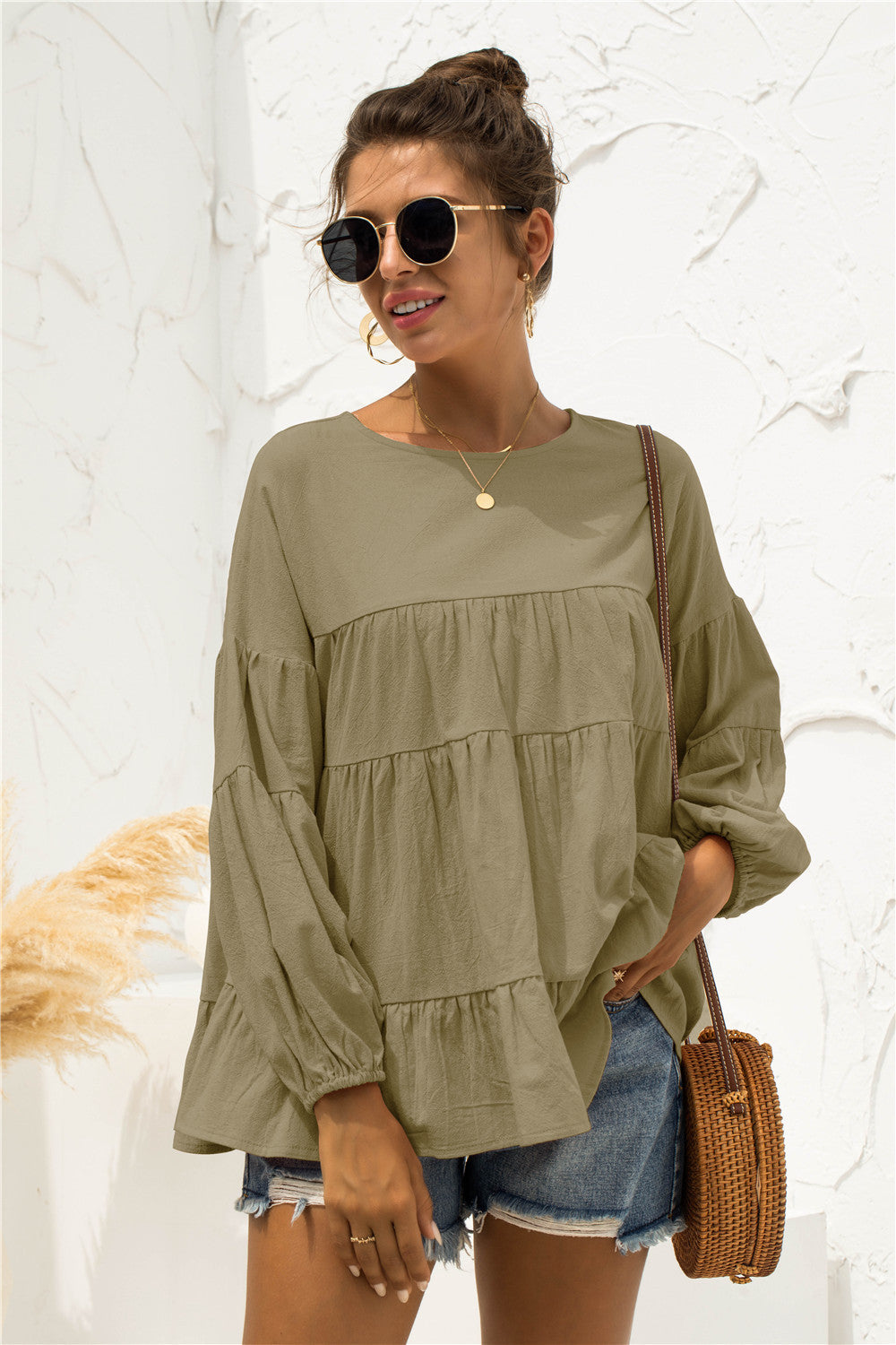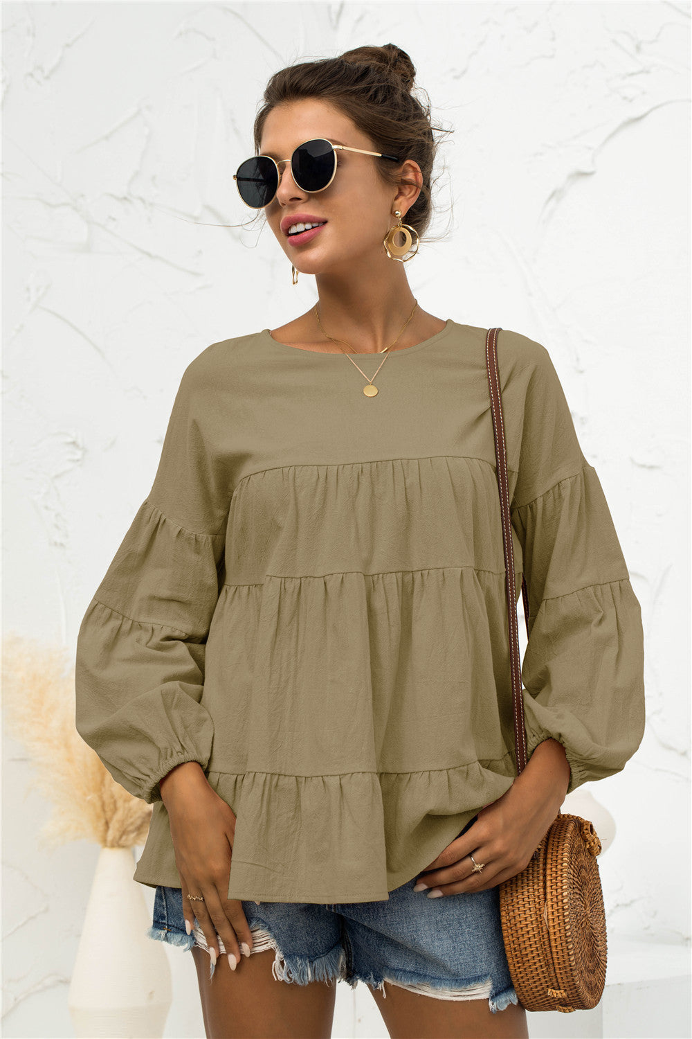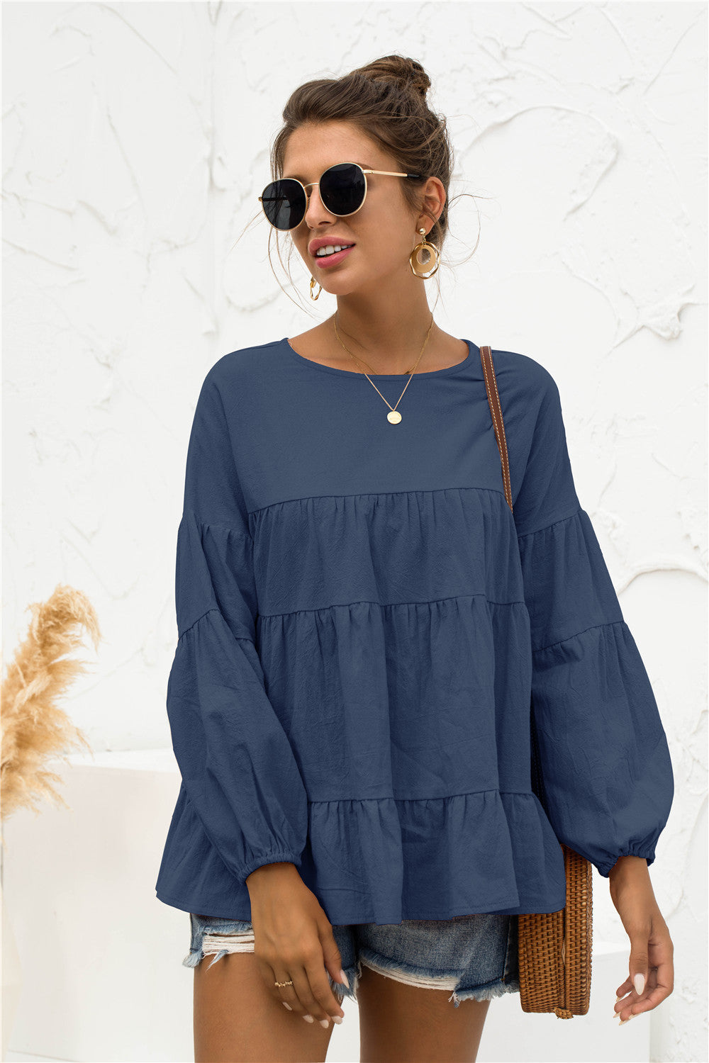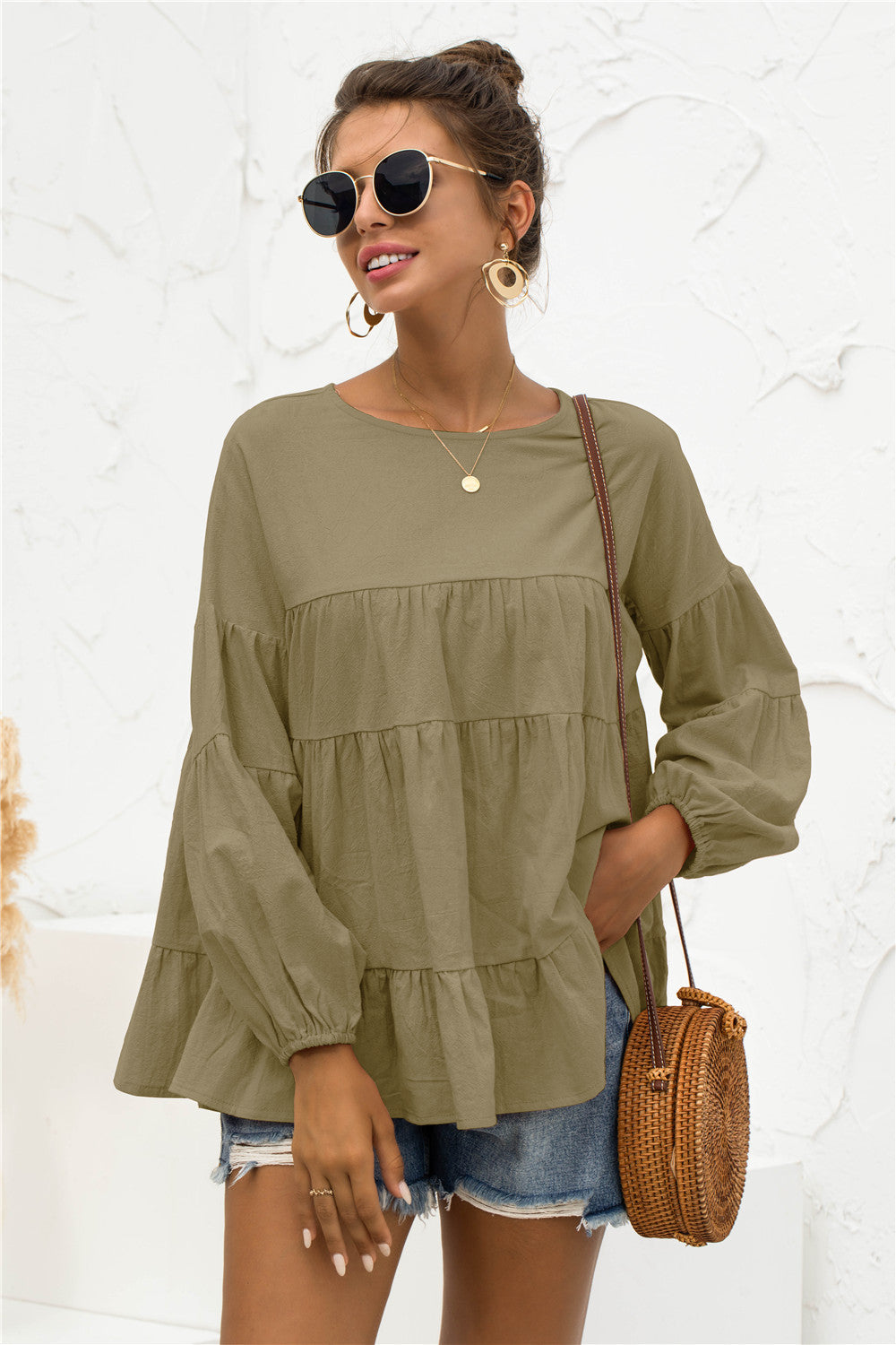 The Anna-Kaci long sleeve blouse is detailed with chic ruffle tiered layers from the top to bottom. Features relaxed fit long sleeves, a round neckline and a flowy overall silhouette. Pair it with your favorite denim jeans and accessories for an easy fall look.