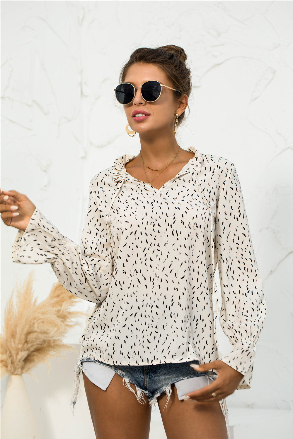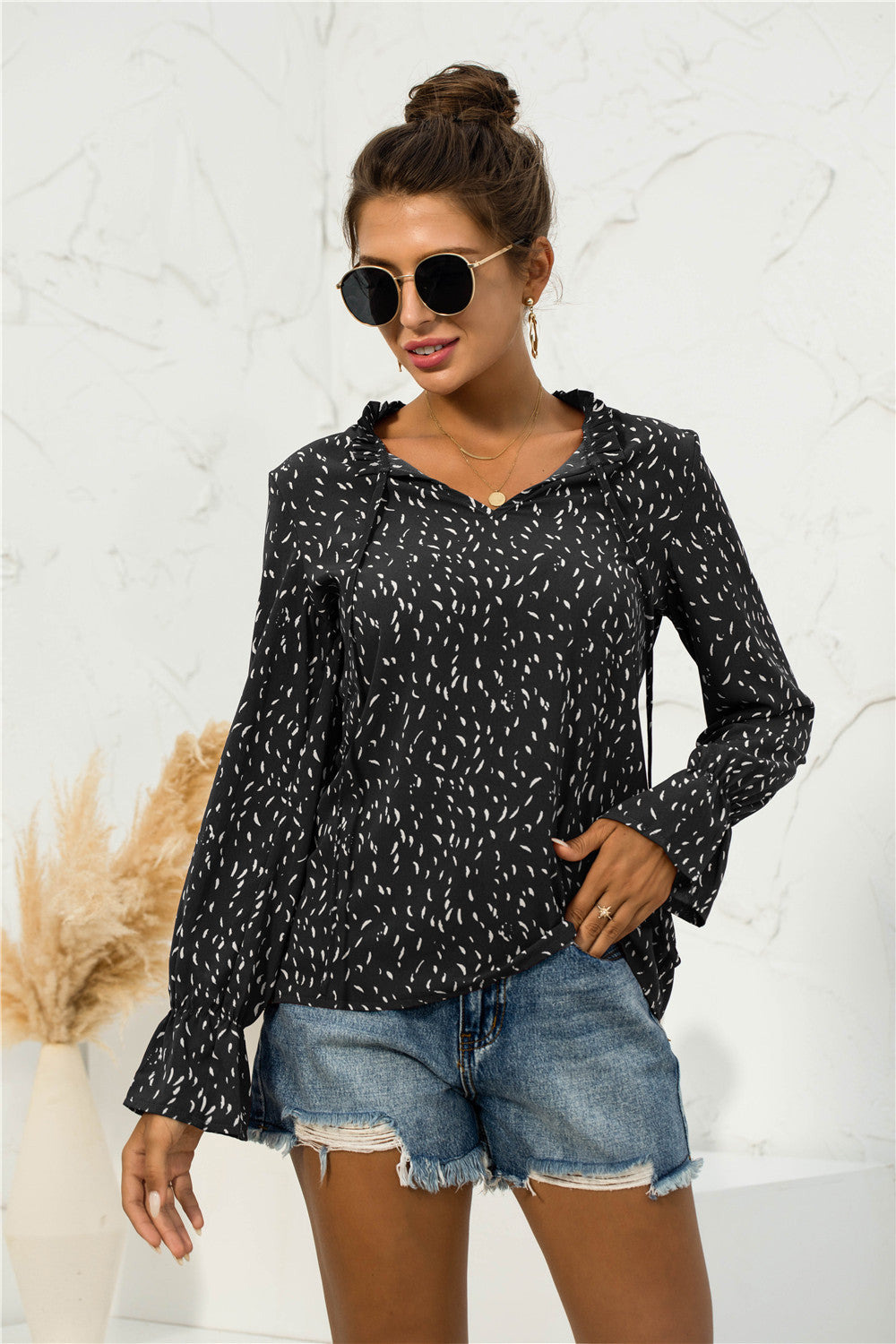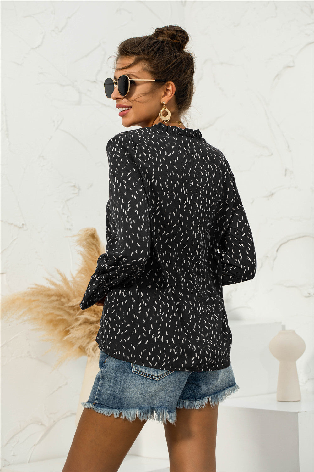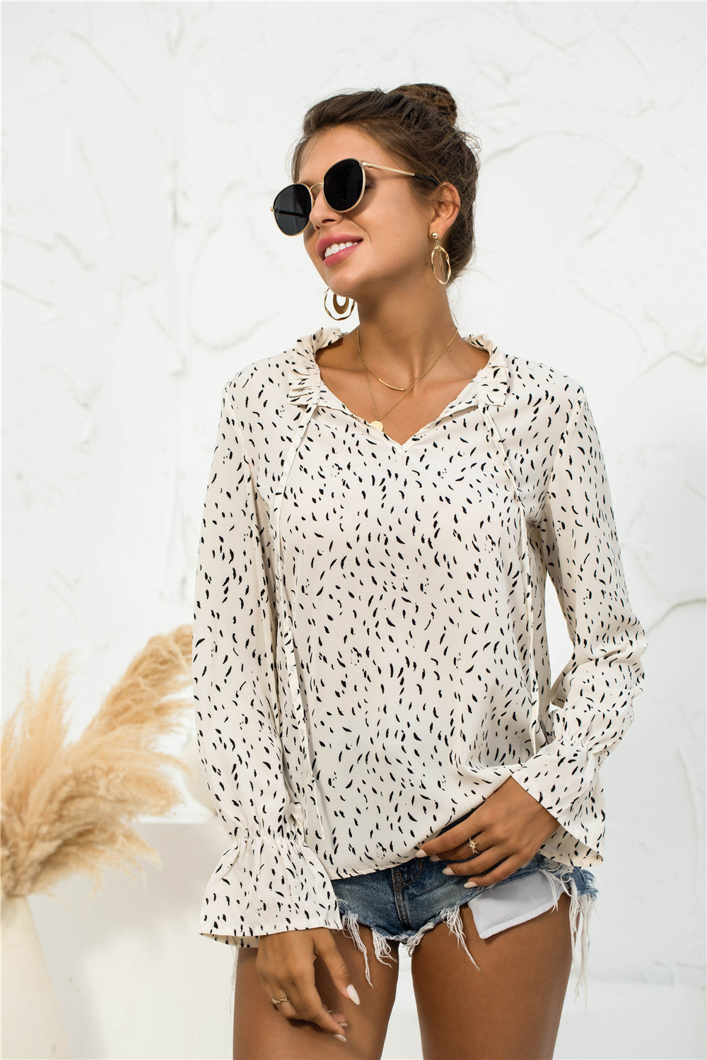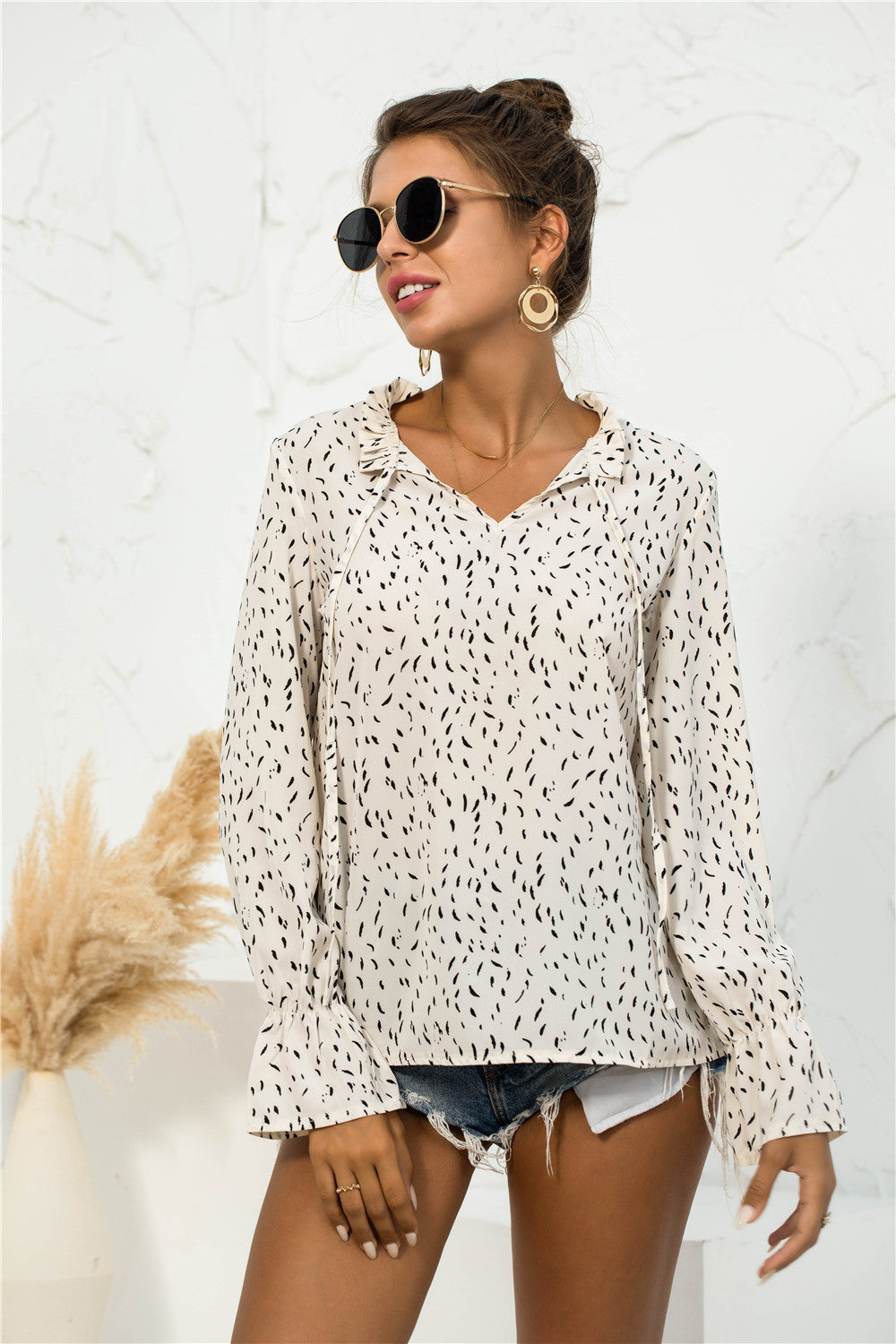 The Anna-Kaci long sleeve top is detailed with a chic notched flat collar, tied string neck front, and dot print patterns across the entirety of the top. Features ruffle hem long sleeves and a casual relaxed fit. Pair it with your favorite denim jeans for an effortless elevated fall or winter look.