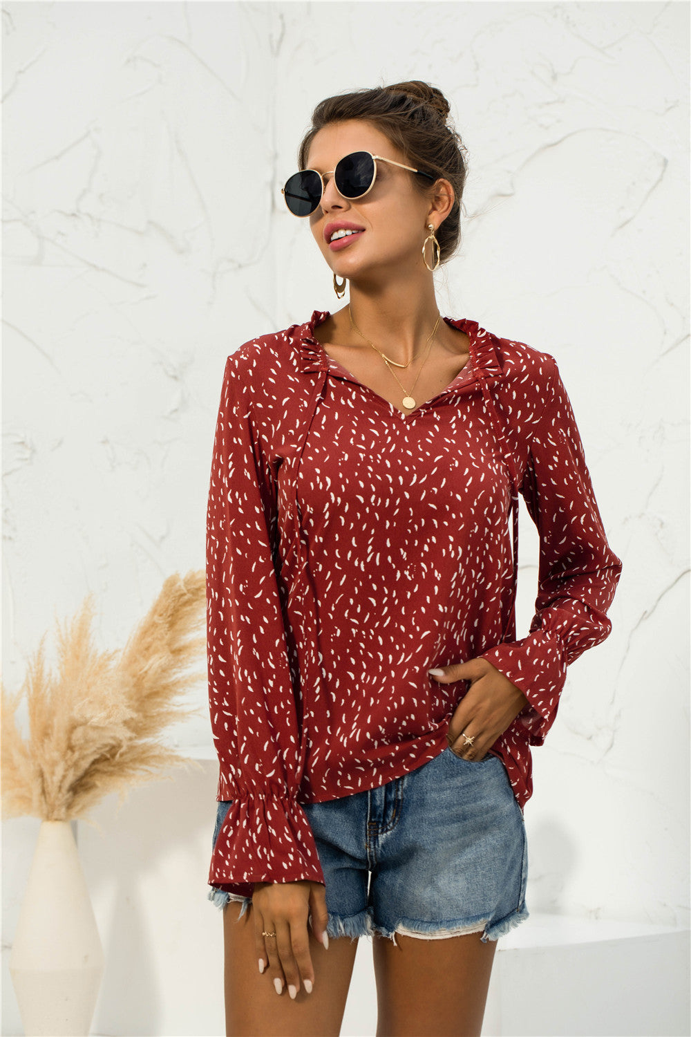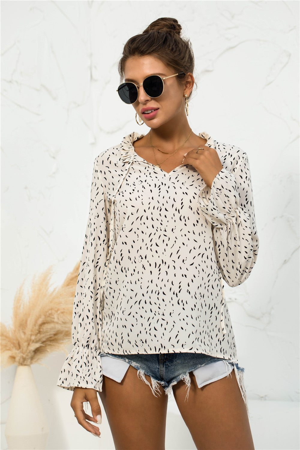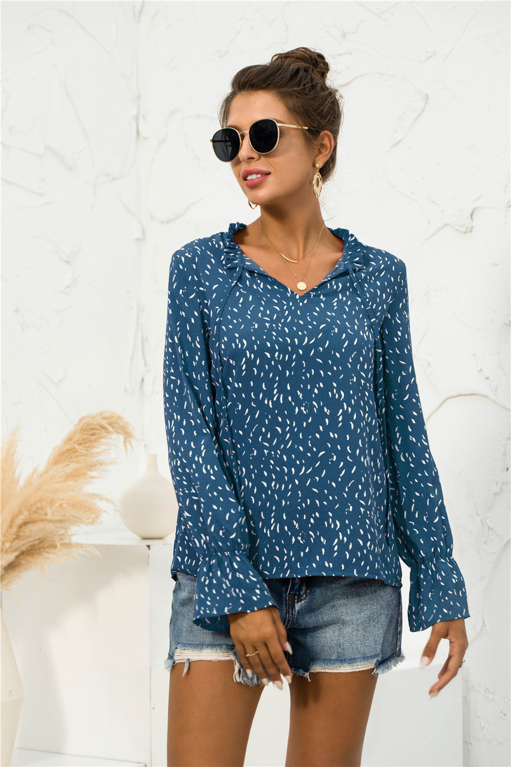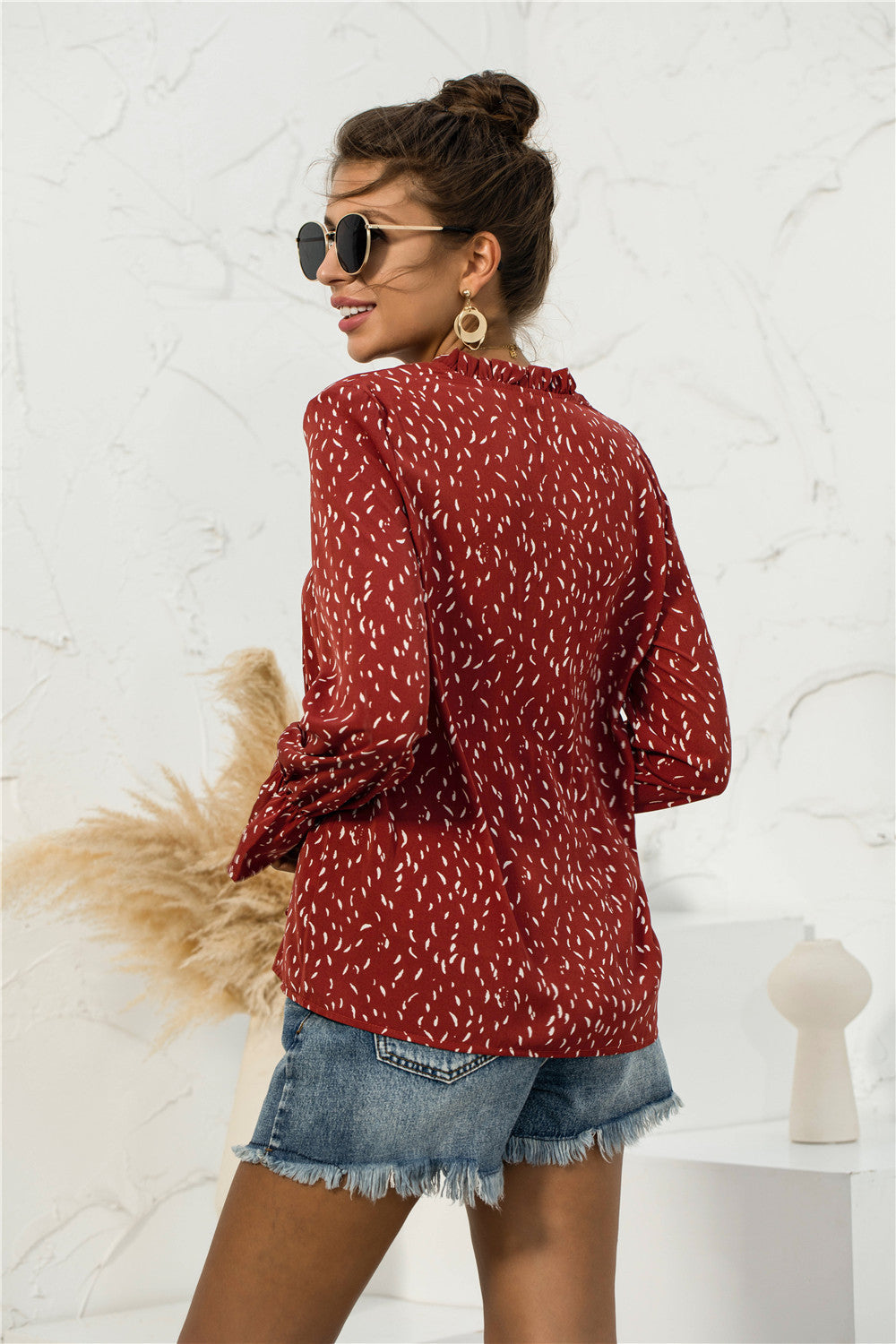 The Anna-Kaci long sleeve top is detailed with a chic notched flat collar, tied string neck front, and dot print patterns across the entirety of the top. Features ruffle hem long sleeves and a casual relaxed fit. Pair it with your favorite denim jeans for an effortless elevated fall or winter look.
