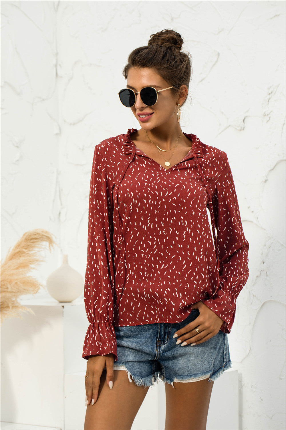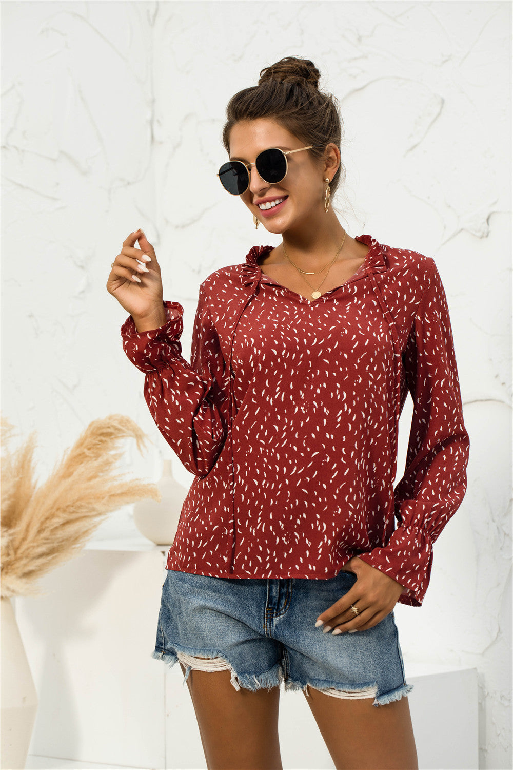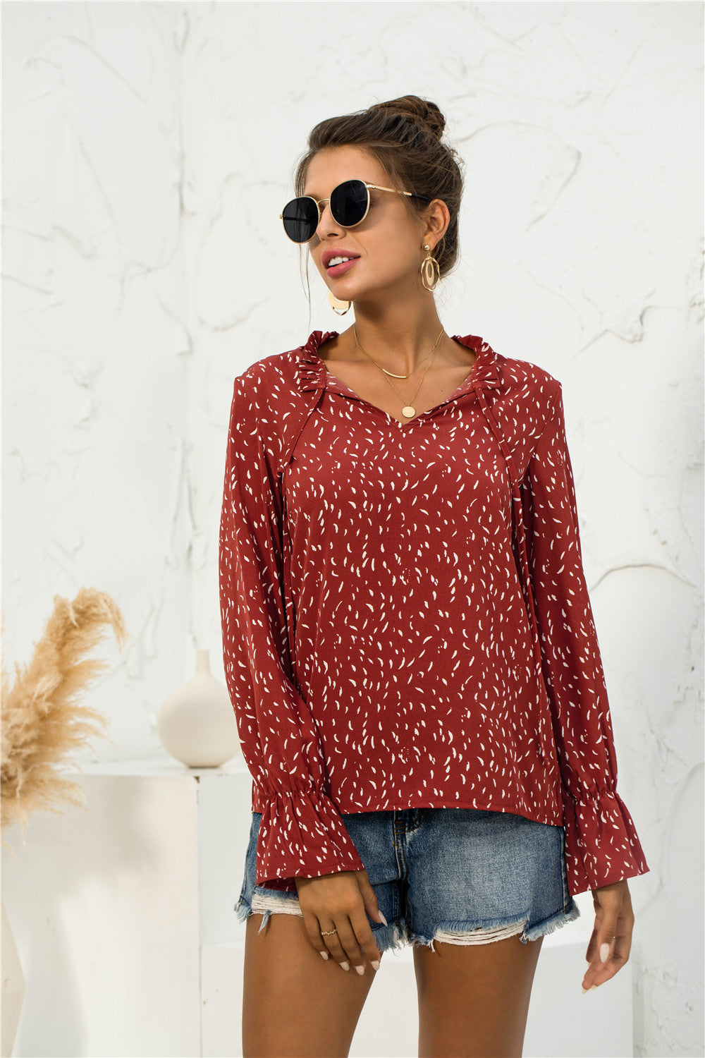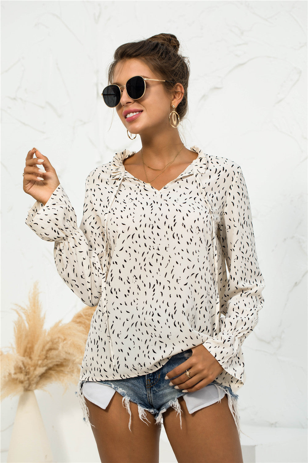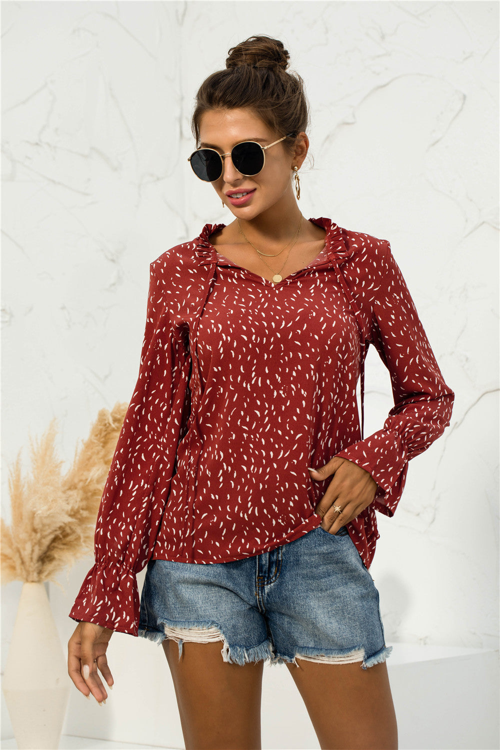 The Anna-Kaci long sleeve top is detailed with a chic notched flat collar, tied string neck front, and dot print patterns across the entirety of the top. Features ruffle hem long sleeves and a casual relaxed fit. Pair it with your favorite denim jeans for an effortless elevated fall or winter look.