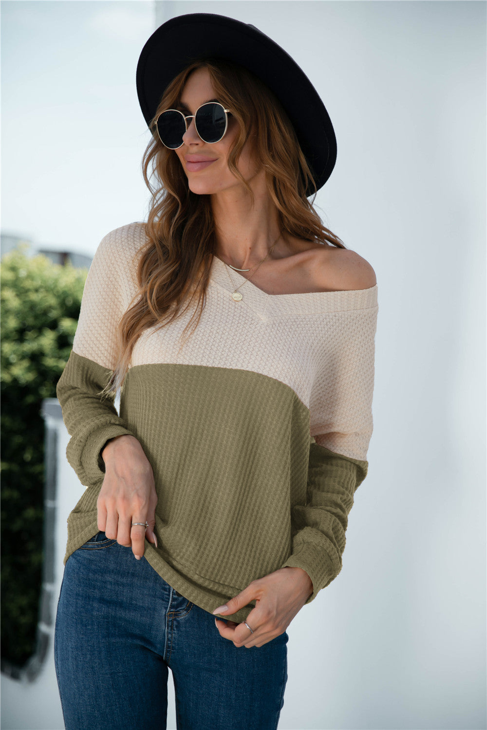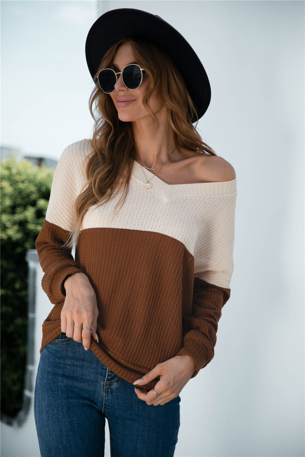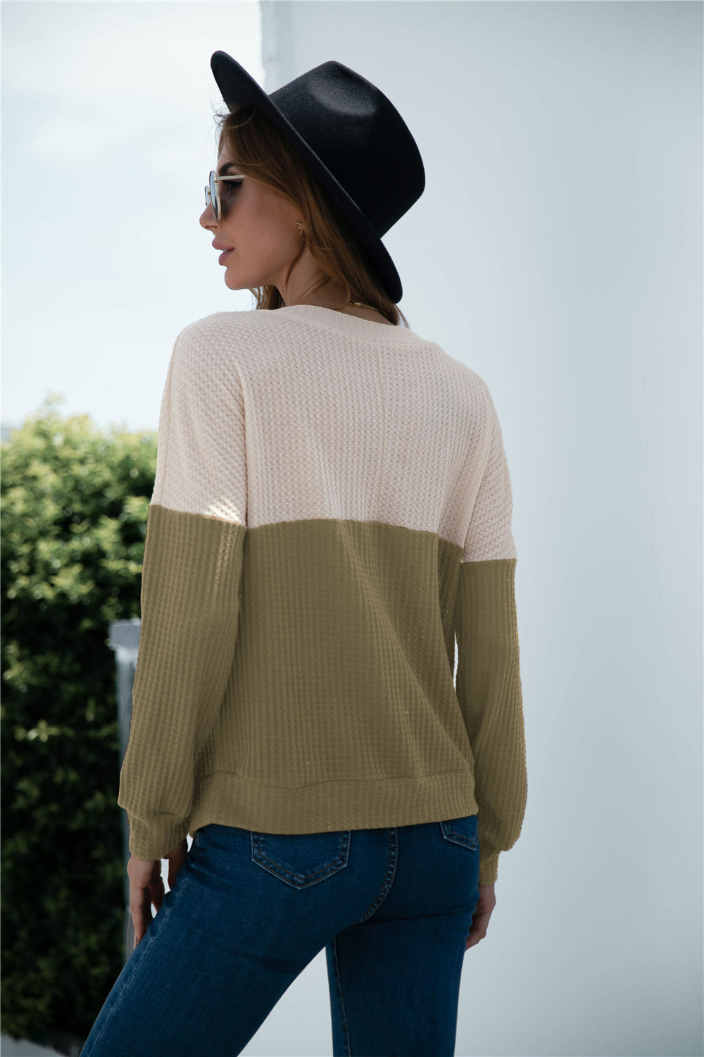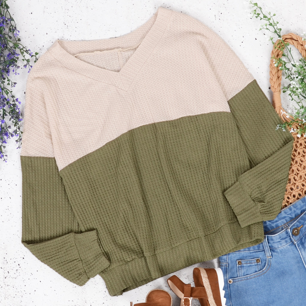 The Anna-Kaci sweater is detailed with a two tone color block design that divides at the center. Features a semi v neck line, long sleeves, soft knitted textures, and cuffed hemlines. Easily wear it alone with your favorite denim jeans for an easy fall and winter time look.