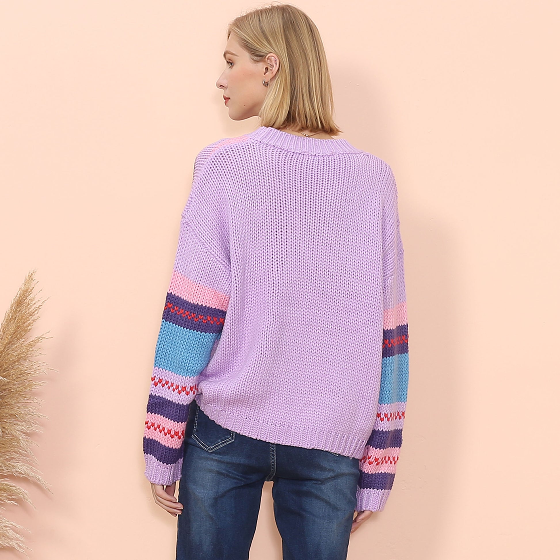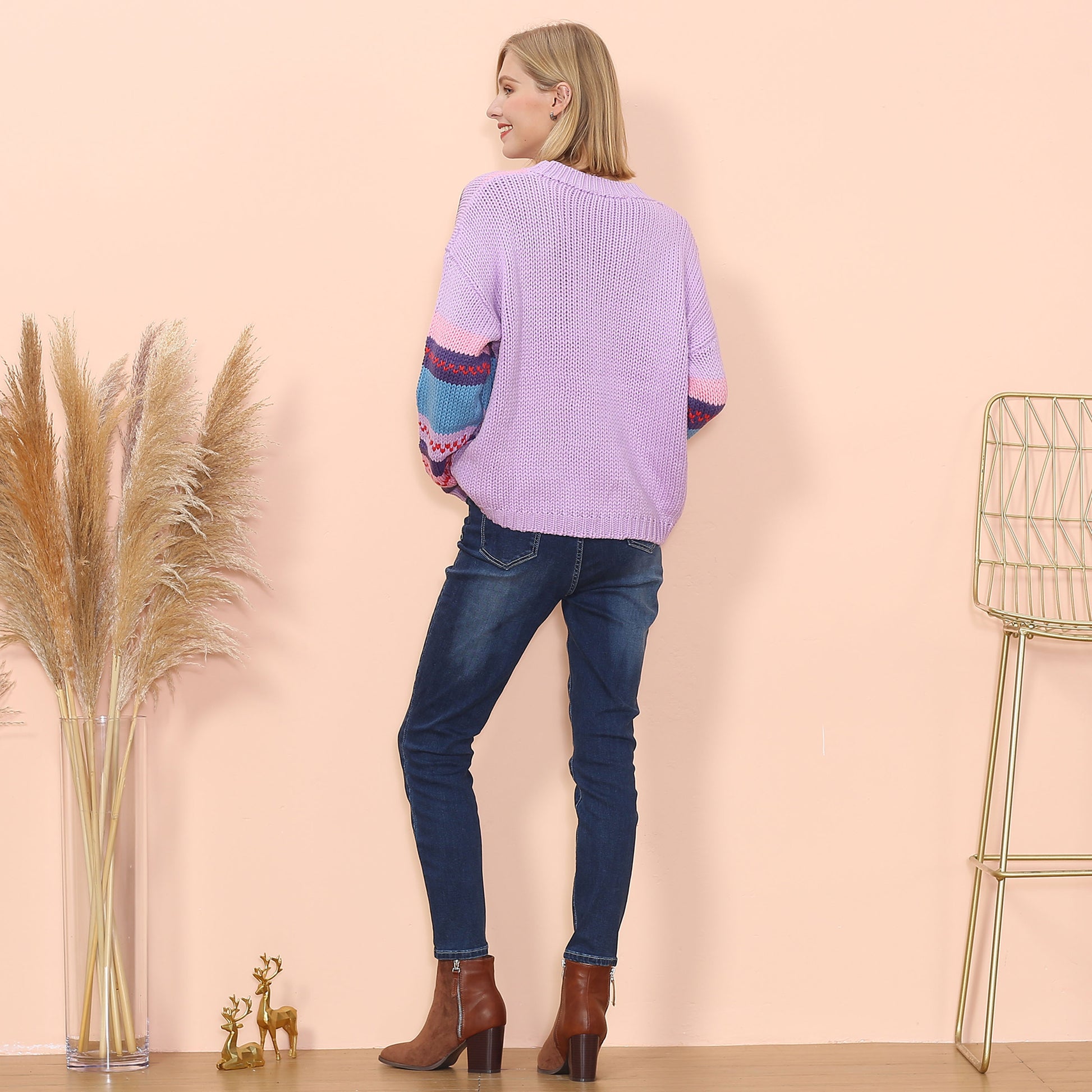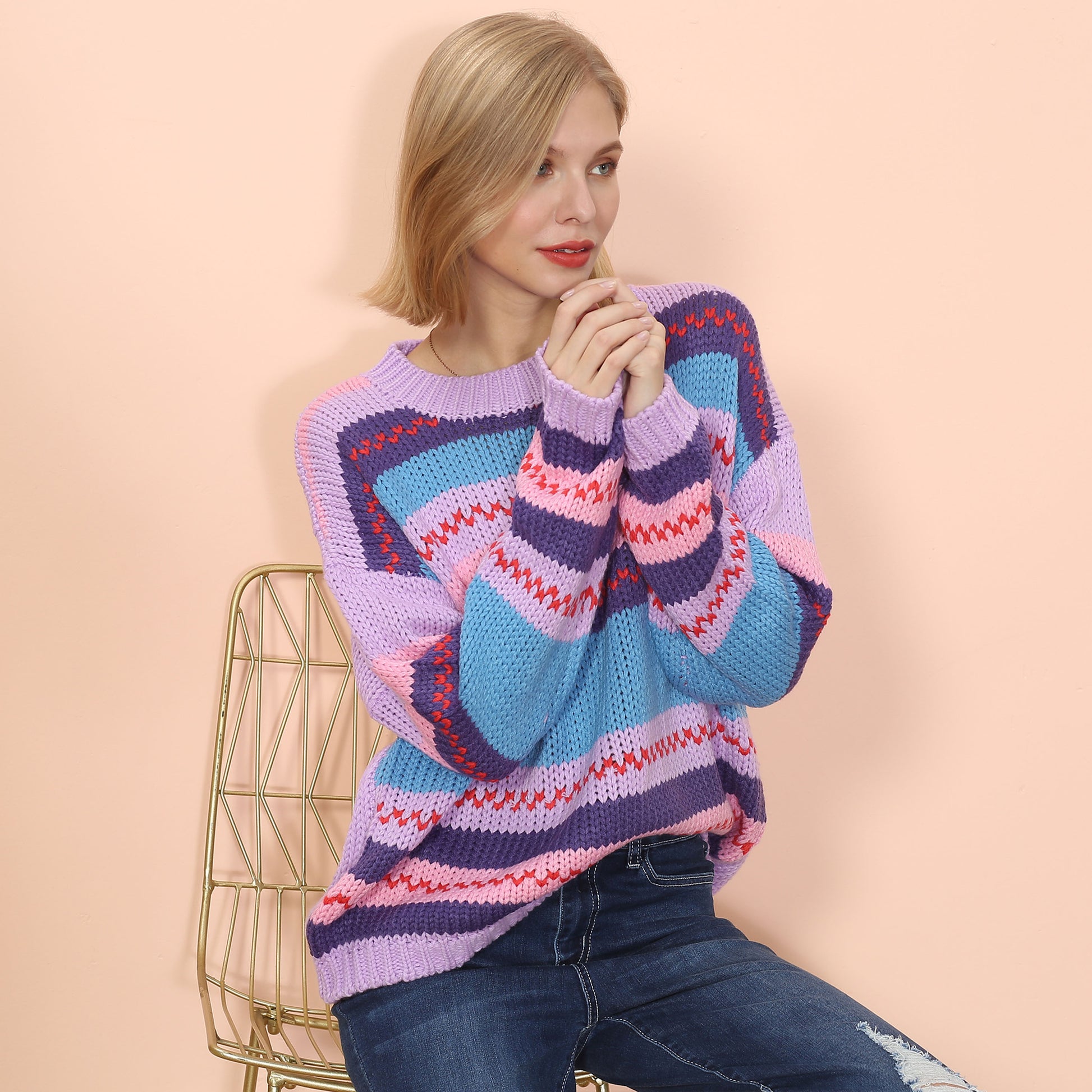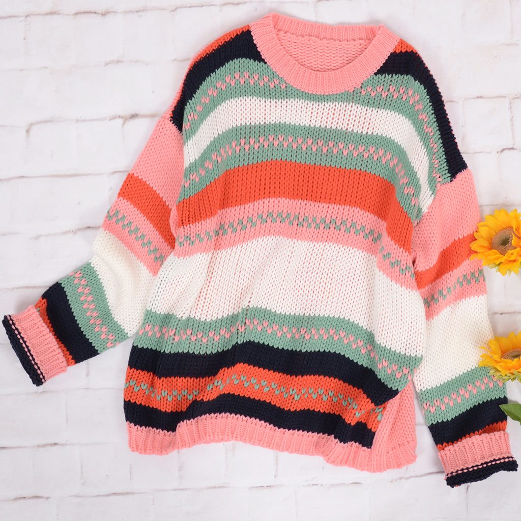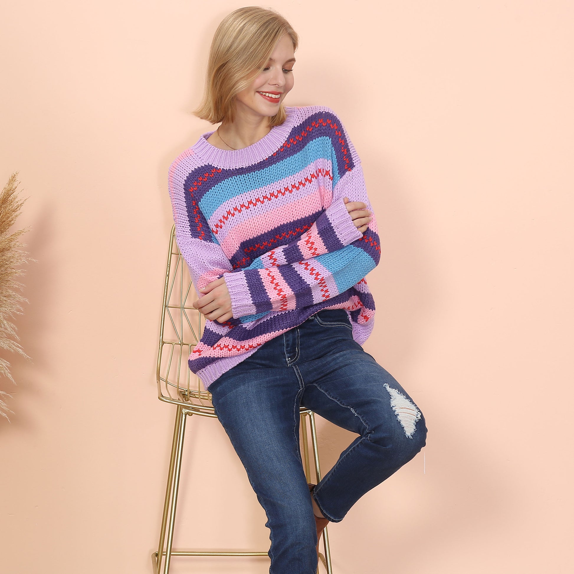 The Anna-Kaci long sleeve is detailed with a flattering striped patterns from top to bottom. Features a round neckline, relaxed long sleeves, knitted textures, and an easy loose fit. Pair it with your favorite jeans for an easy go to look in the fall and winter season.