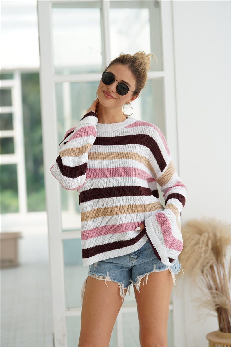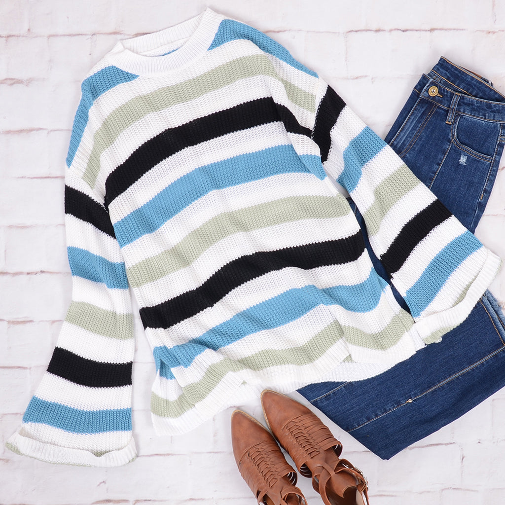 The Anna-Kaci light long sleeve is detailed with soft knitted textures on a relaxed fit sweater. Features cute striped soft colored patterns, a round neckline and long bell sleeves. Layer the long sleeve with your favorite coat or jacket until you get indoors where you can truly turn heads.