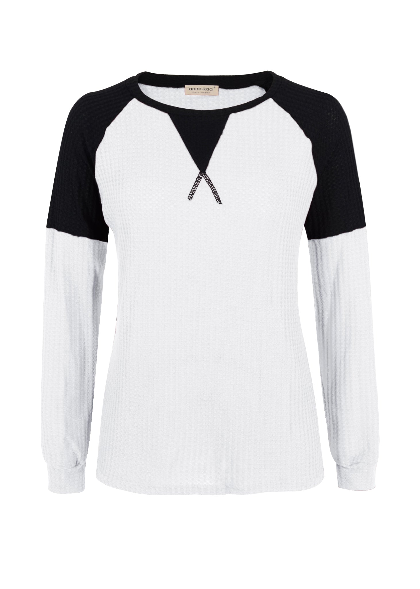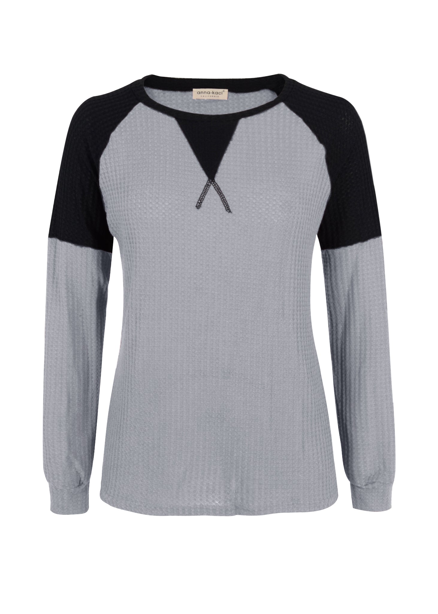 The Anna-Kaci waffle knit sweater is detailed with a fun two tone design on the shoulders and neck line. Features a round neck, long sleeves, and a loose fit. Layer it over a tank top and denim jeans for a casual fall look.