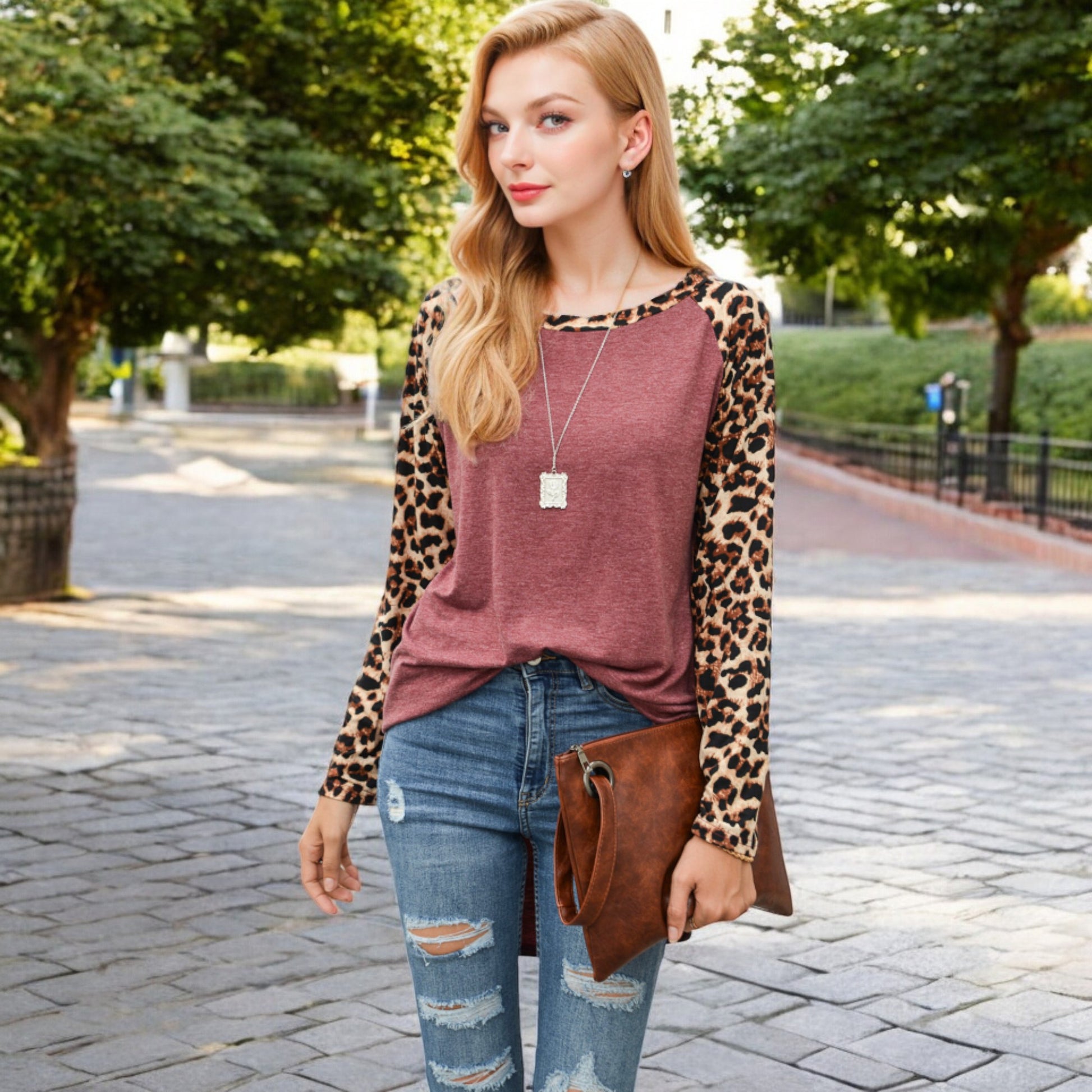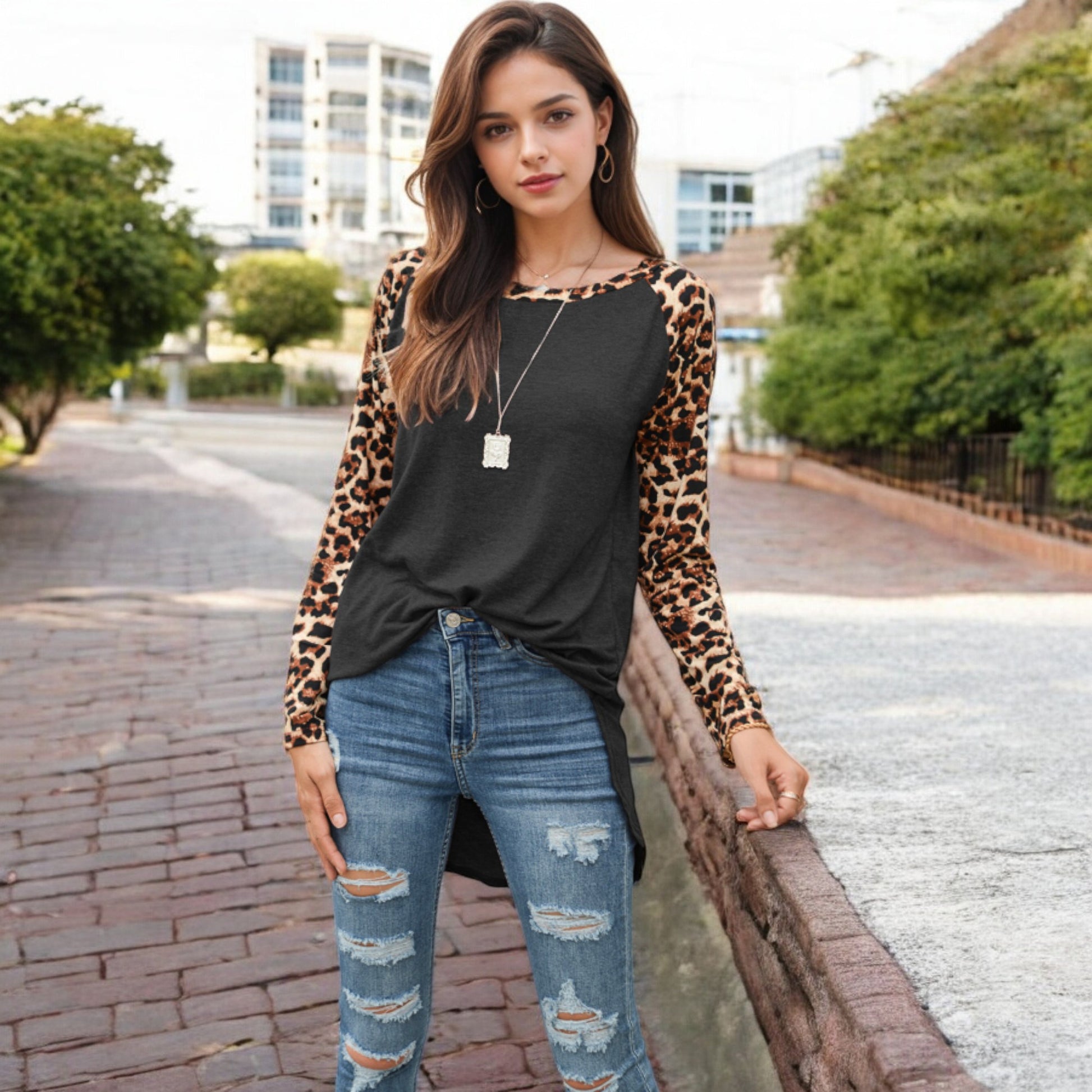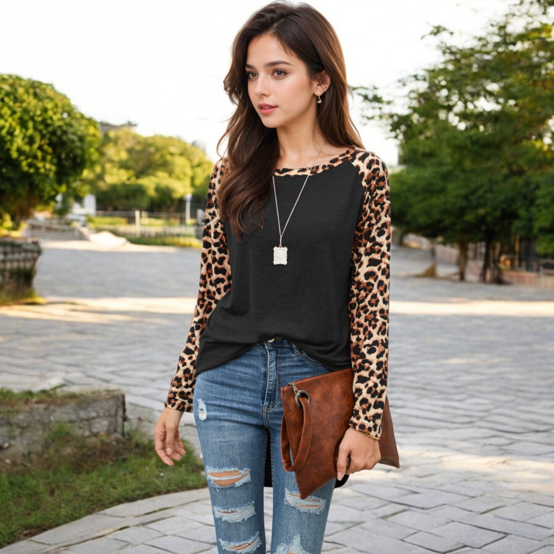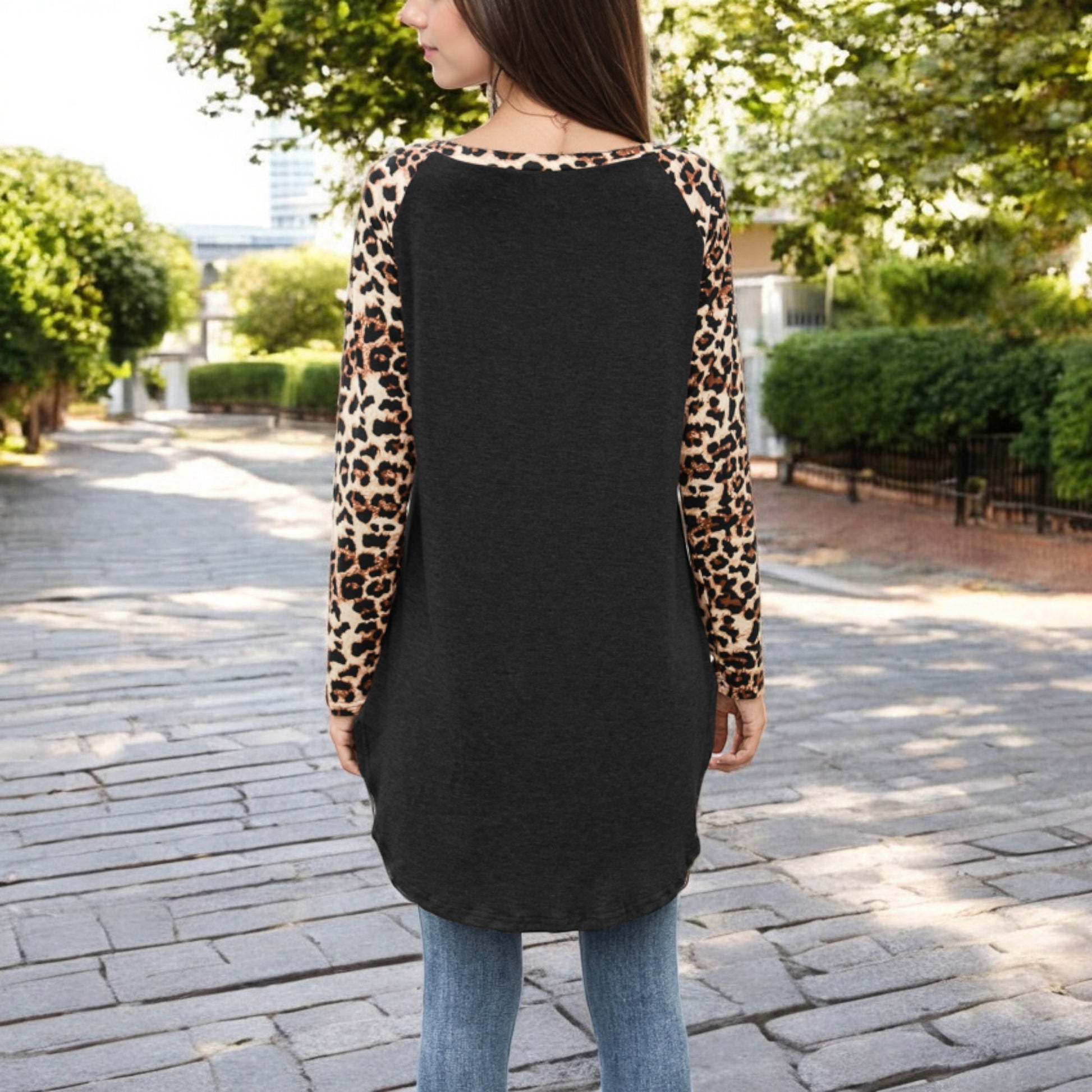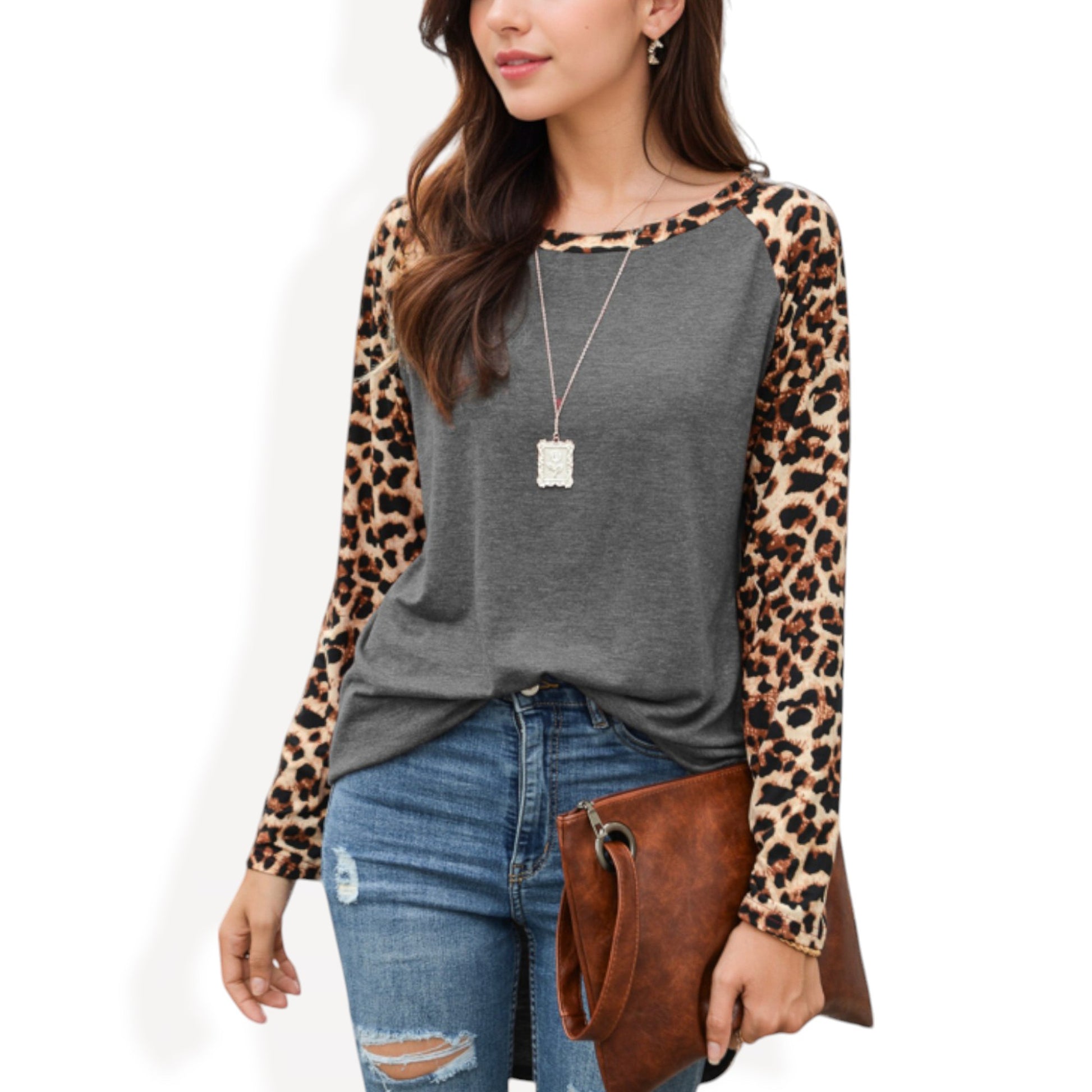 Anna-Kaci Women's Long Sleeve Pullover Shirt with Leopard Print Contrast Panels and Crew Neck