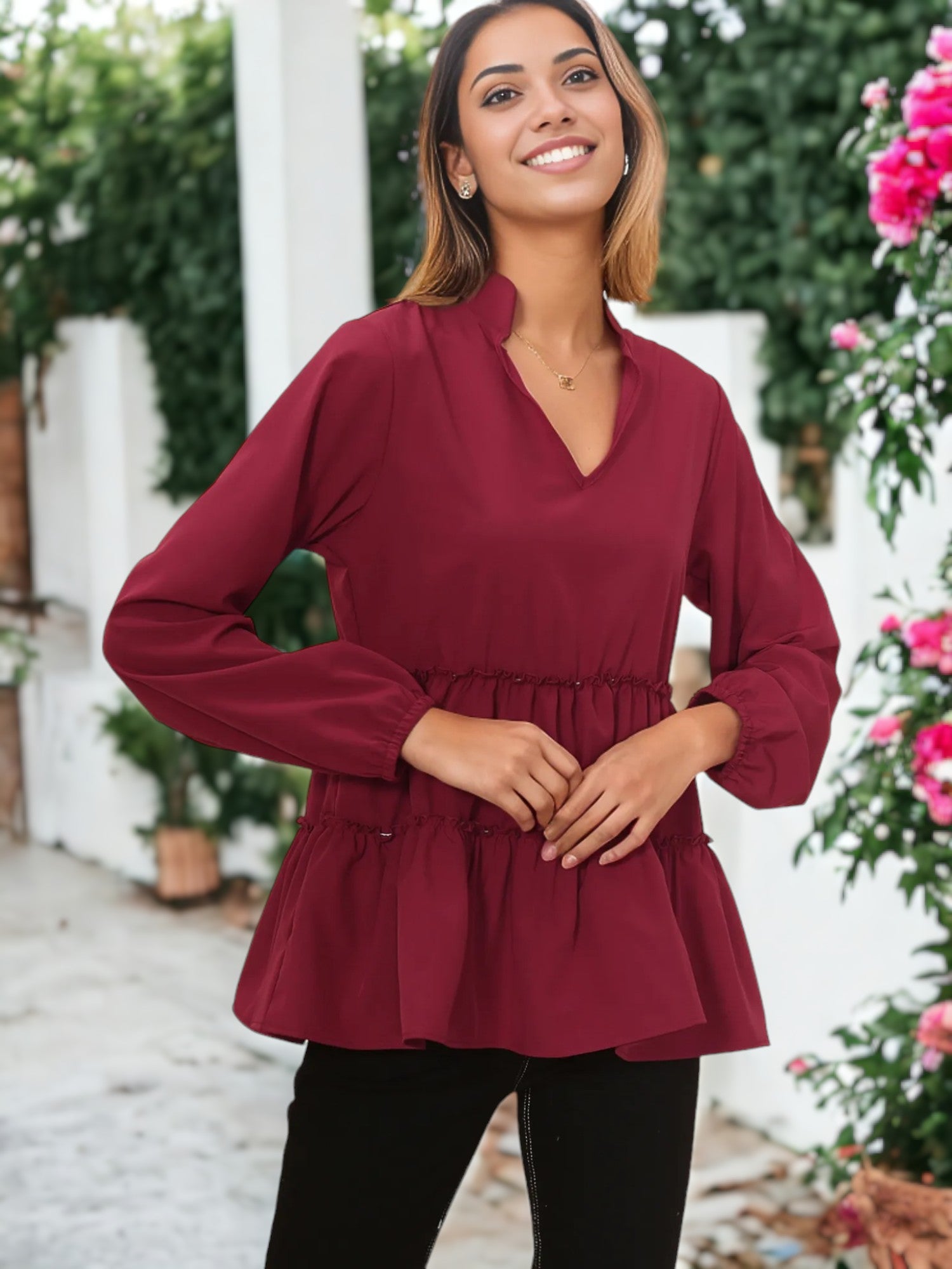Elevate your wardrobe with our Mandarin Collar Ruffle Hem Blouse. Designed to exude elegance and sophistication, this blouse combines traditional Mandarin collar detailing with a modern ruffle hem for a chic twist. Crafted with premium materials and tailored for a flattering fit, it's perfect for both formal occasions and casual outings. Shop now and make a stylish statement wherever you go!