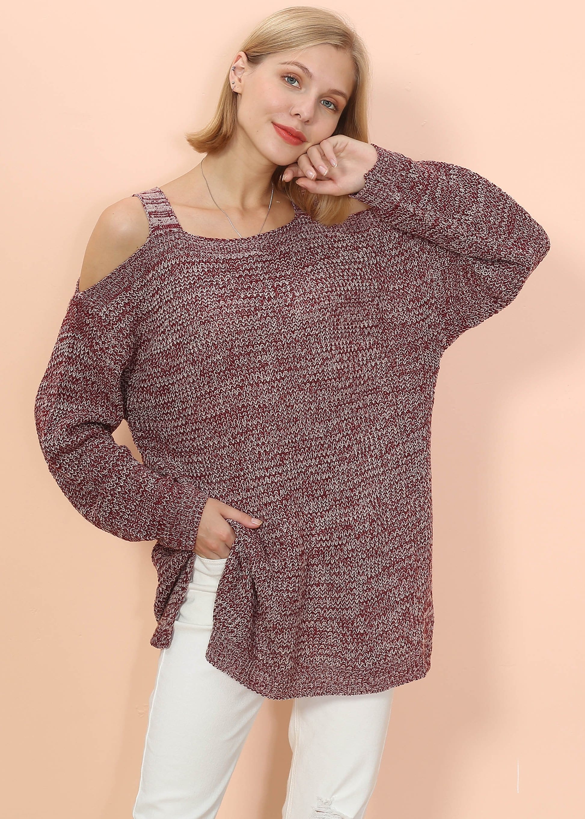 The Anna-Kaci sweater is detailed with a sexy cold shoulder design. Features a round neck line, long sleeves, side slit, and oversized fit. Pair it with distressed denim jeans and pointed boots for a beautiful look.
