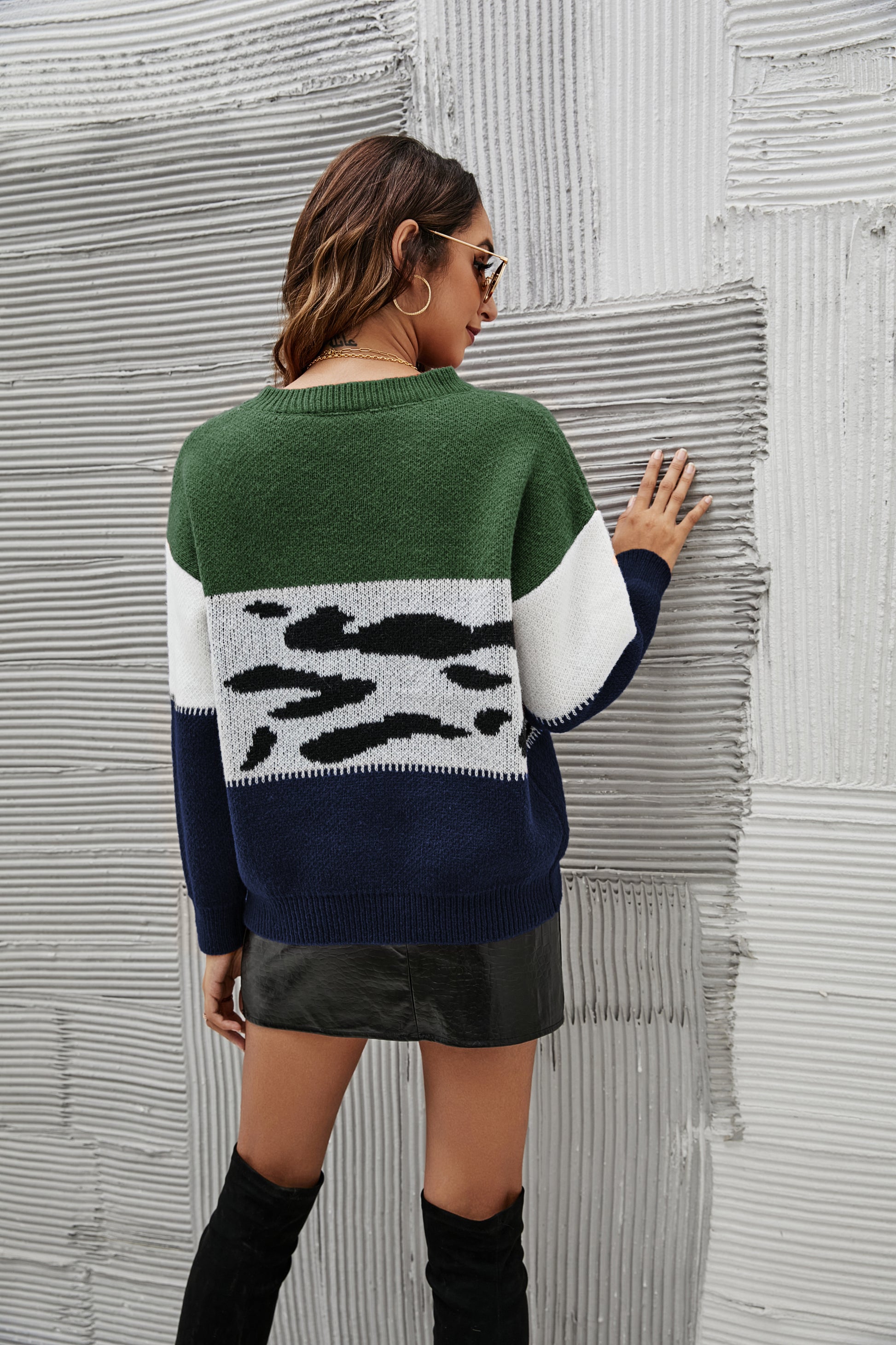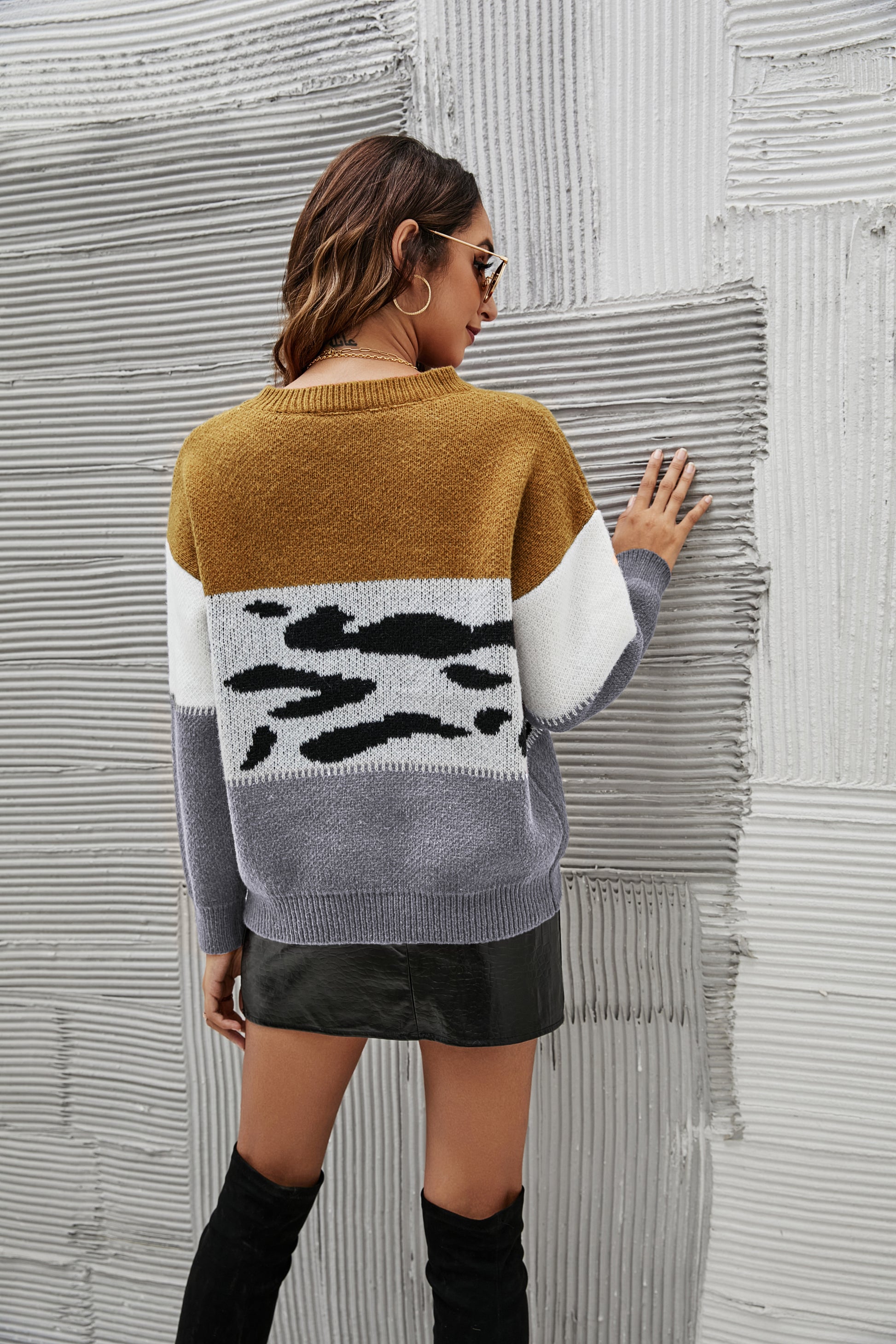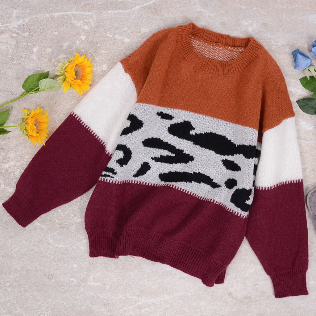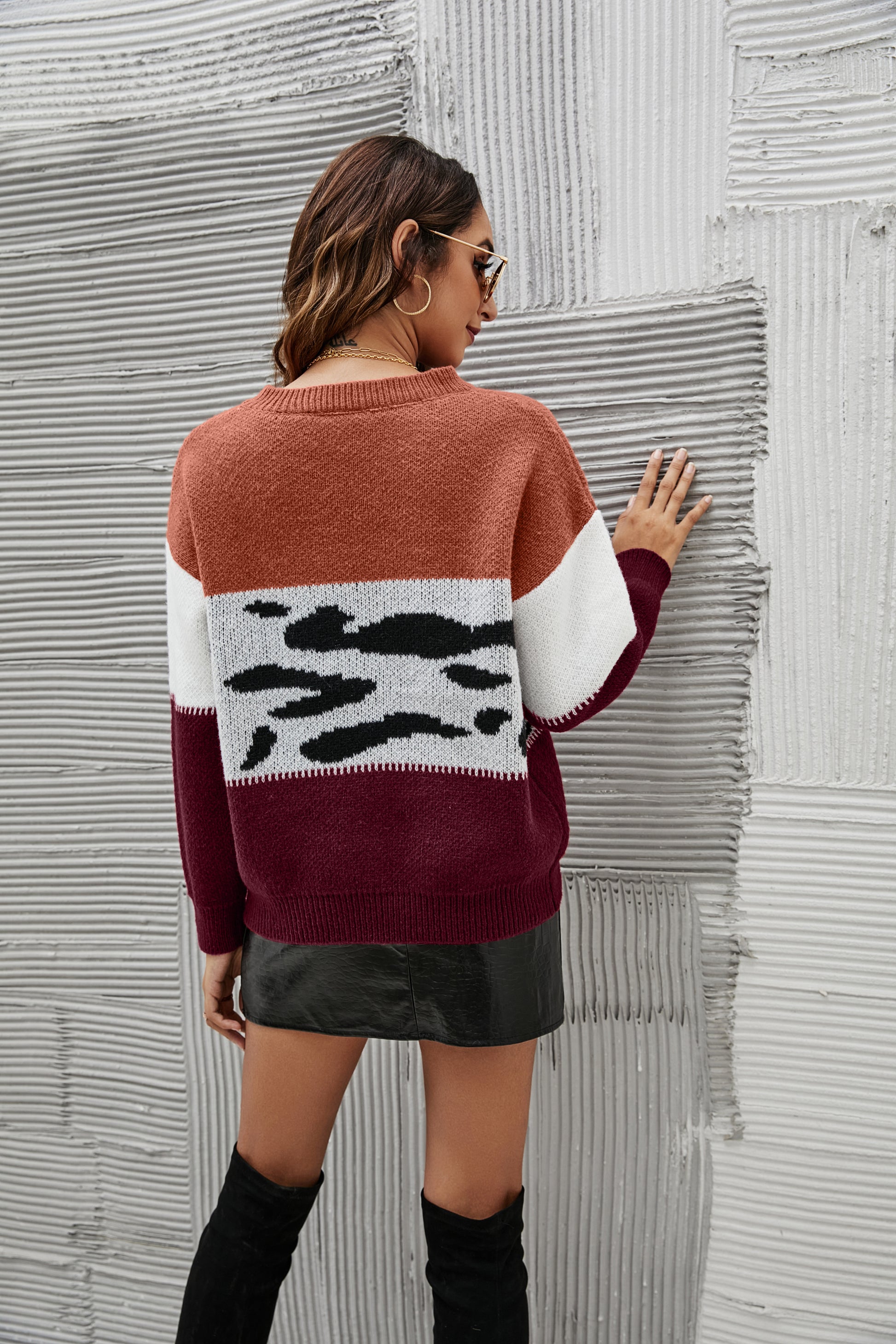 The Anna-Kaci sweater is detailed with bold color block details with animal prints on the middle. Features a round neck line, long sleeves, knit material, and relaxed fit. Pair it with denim shorts and sneakers for a fun look this season.