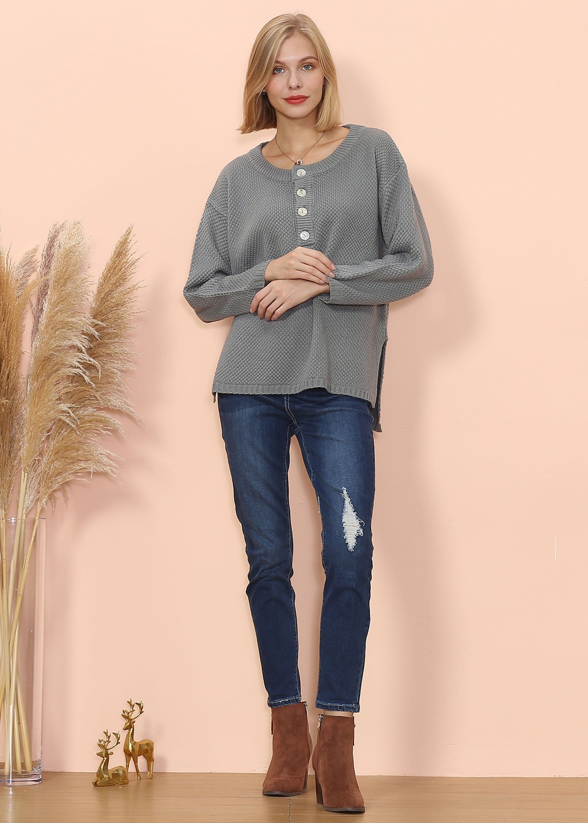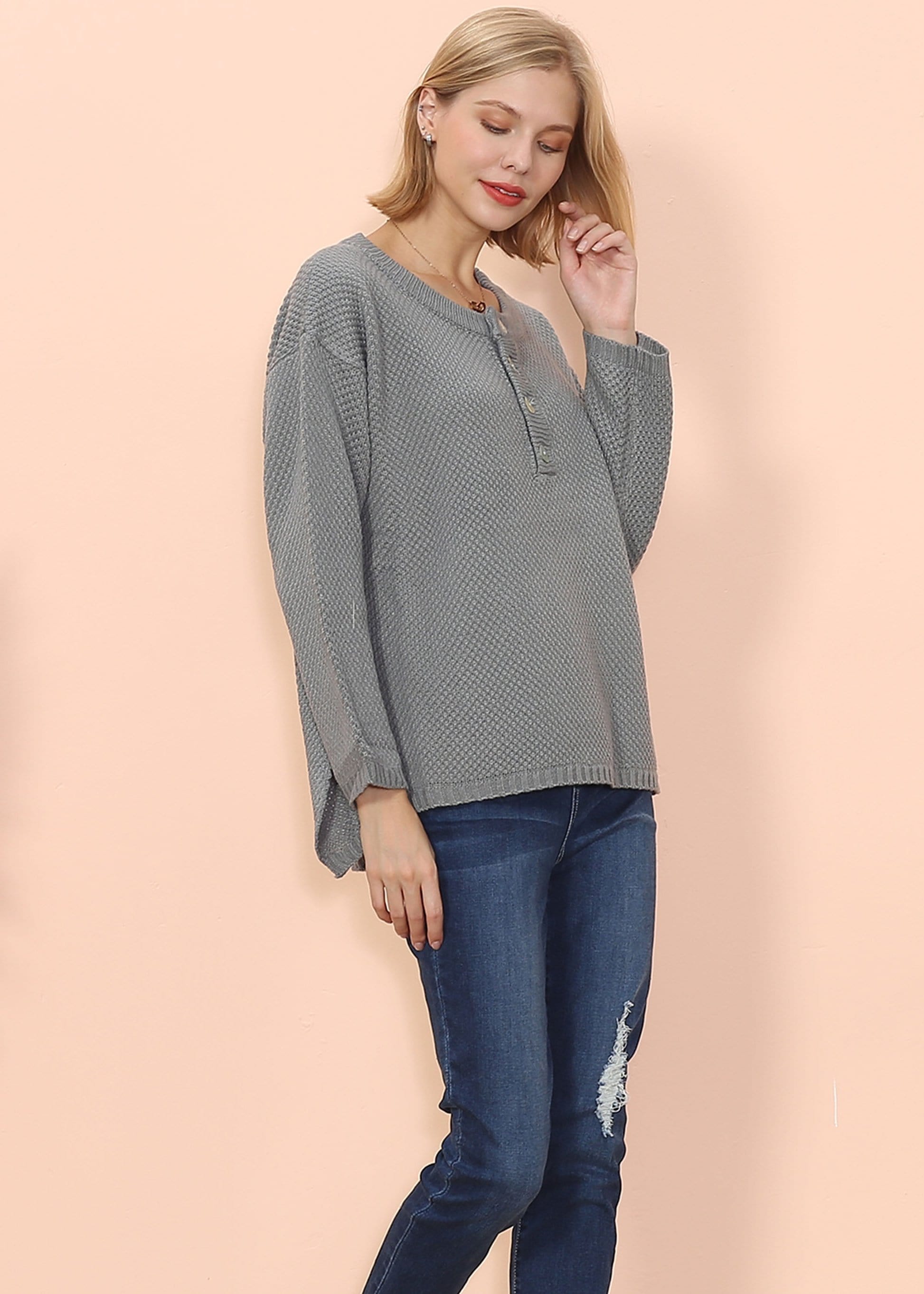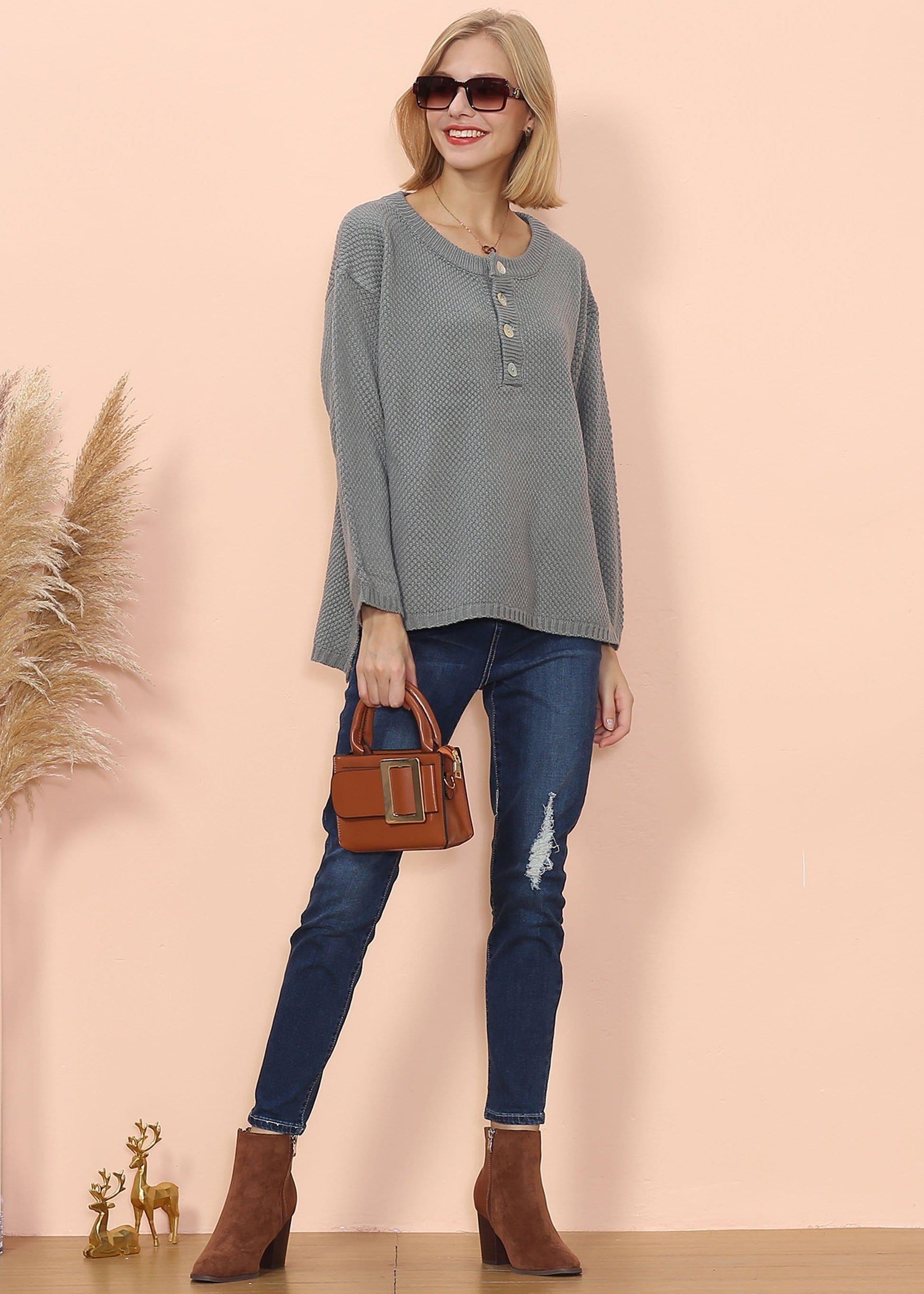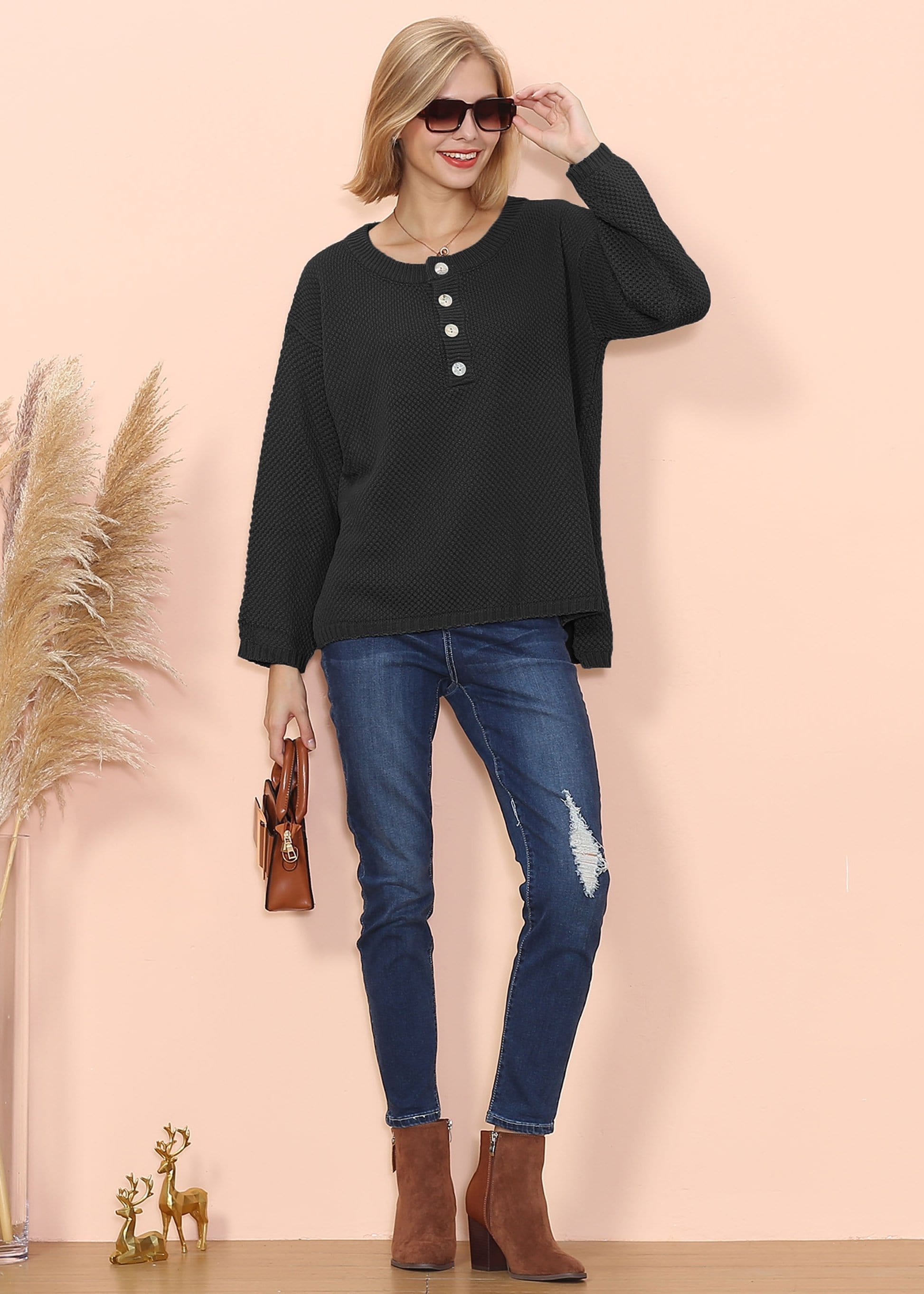 The Anna-Kaci sweater is detailed with a cute contrast half button down front detail. Features a round neck line, long sleeves, textured knit, and oversized fit. Pair it with wide-leg jeans and sneakers for a casual outdoor look.