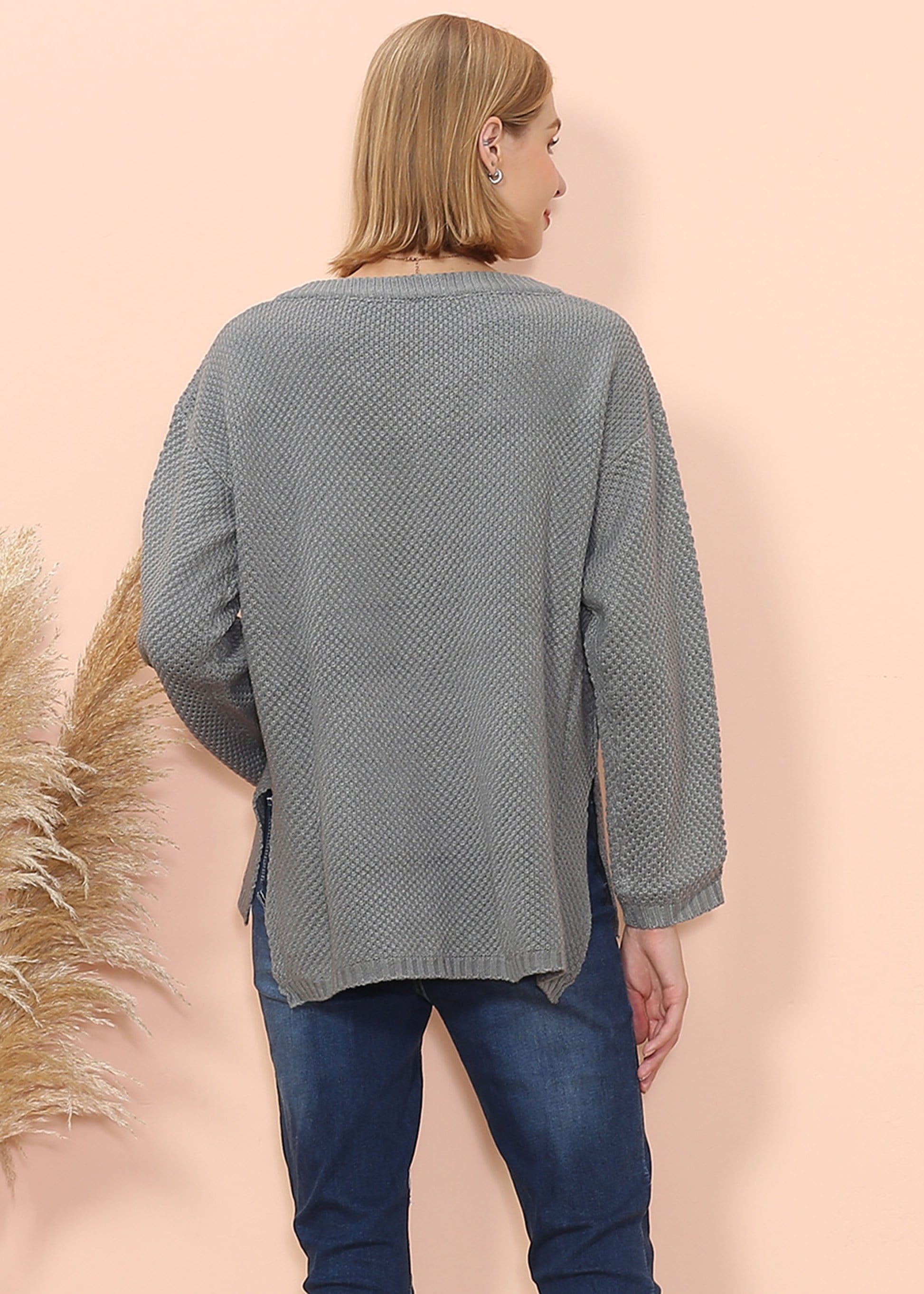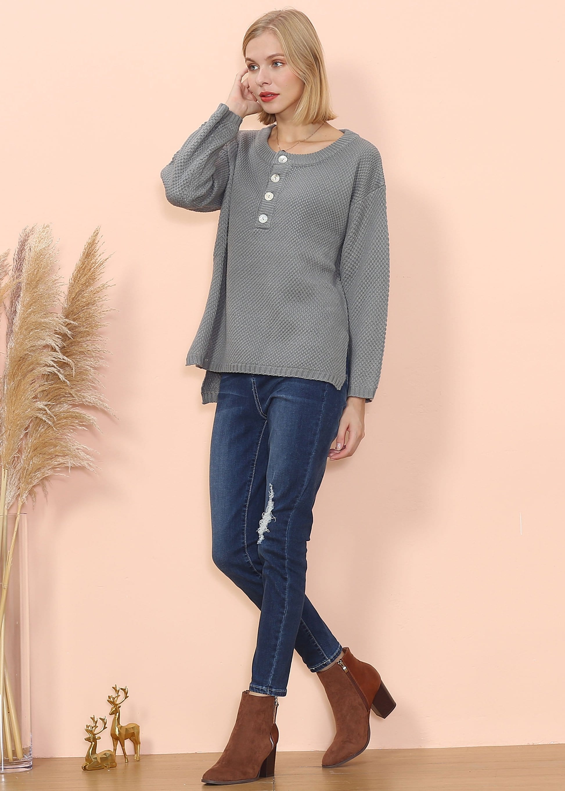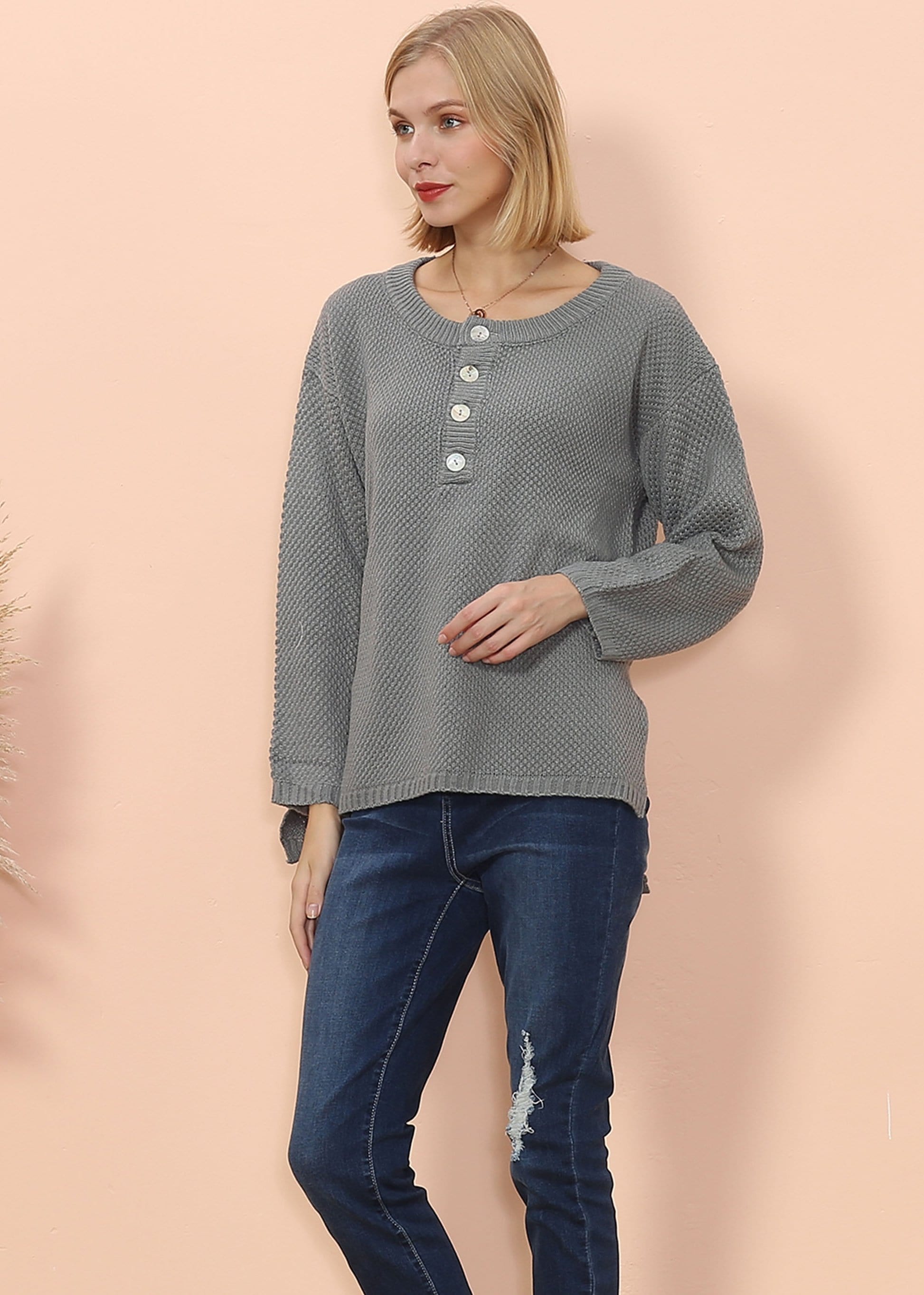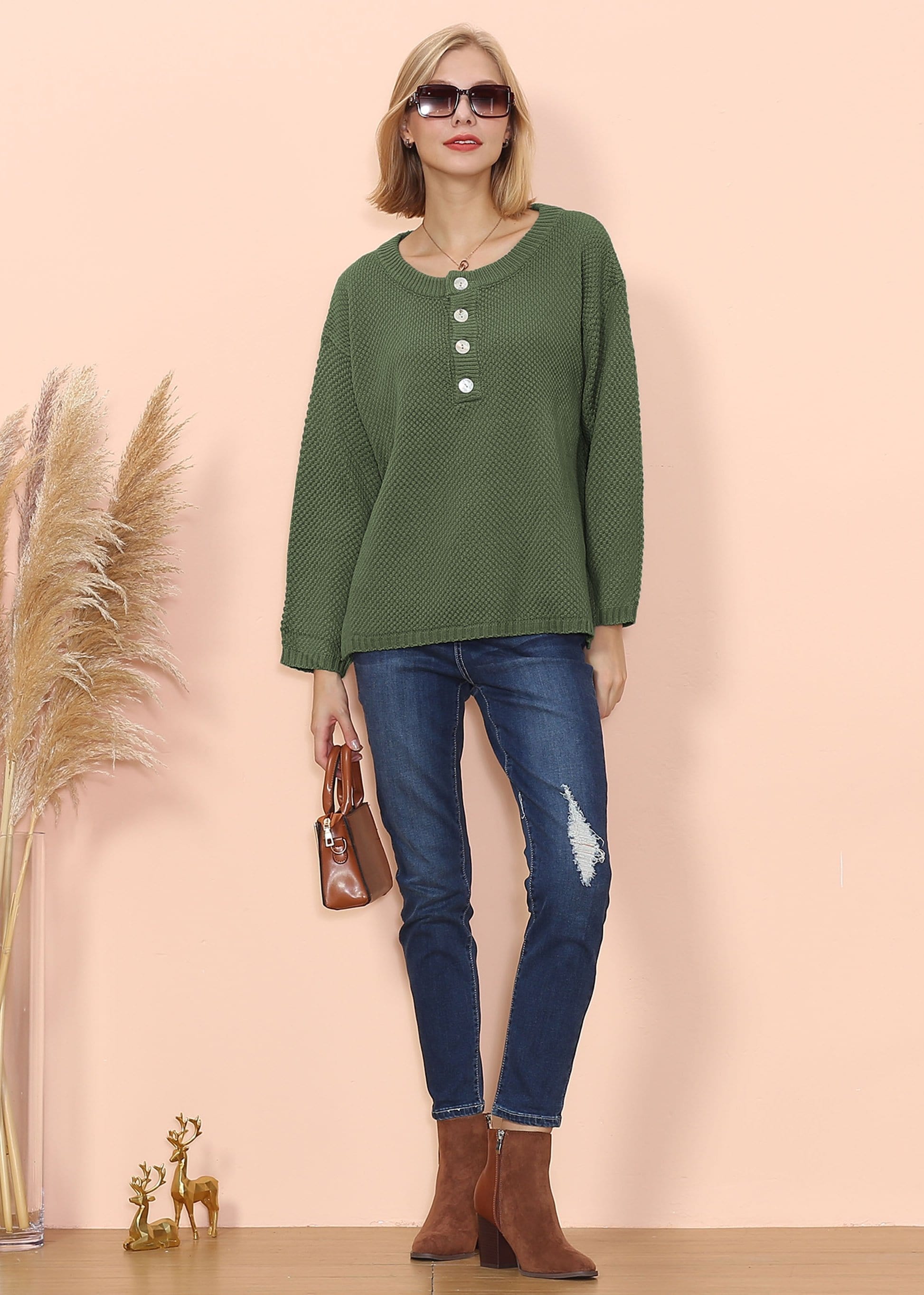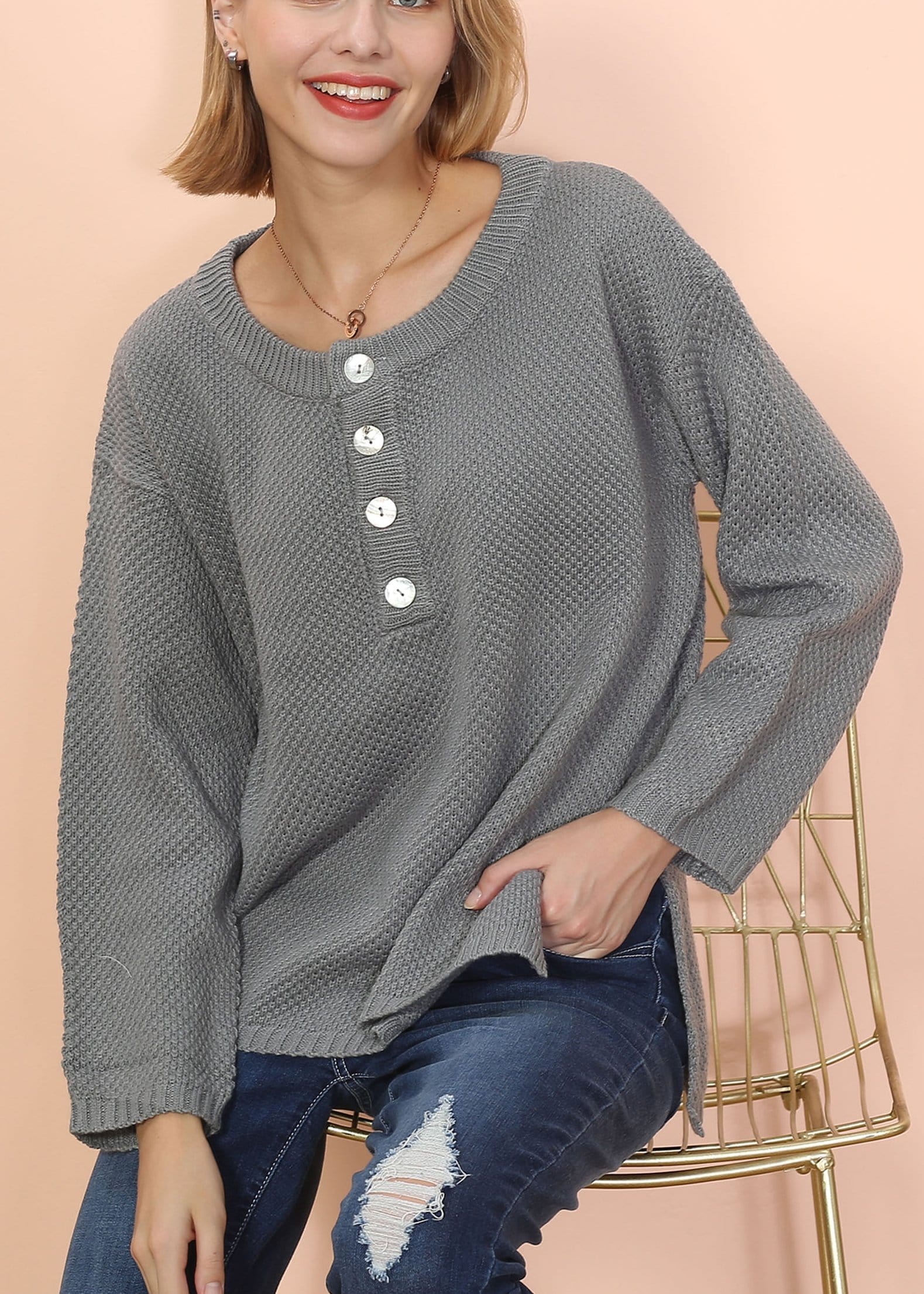 The Anna-Kaci sweater is detailed with a cute contrast half button down front detail. Features a round neck line, long sleeves, textured knit, and oversized fit. Pair it with wide-leg jeans and sneakers for a casual outdoor look.