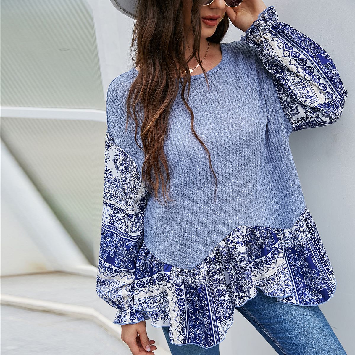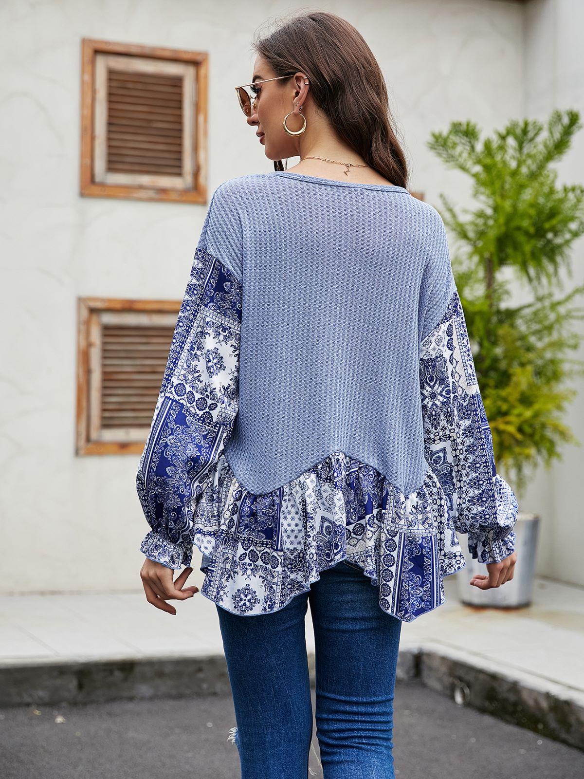 The Anna-Kaci sweater is detailed with a fun two tone design featuring gorgeous paisley prints. Features a round neck line, long bishop sleeves, drop shoulder, asymmetrical hem, waffle knit texture, and an oversized fit. Pair it with denim skinny jeans and sneakers for an easygoing look.