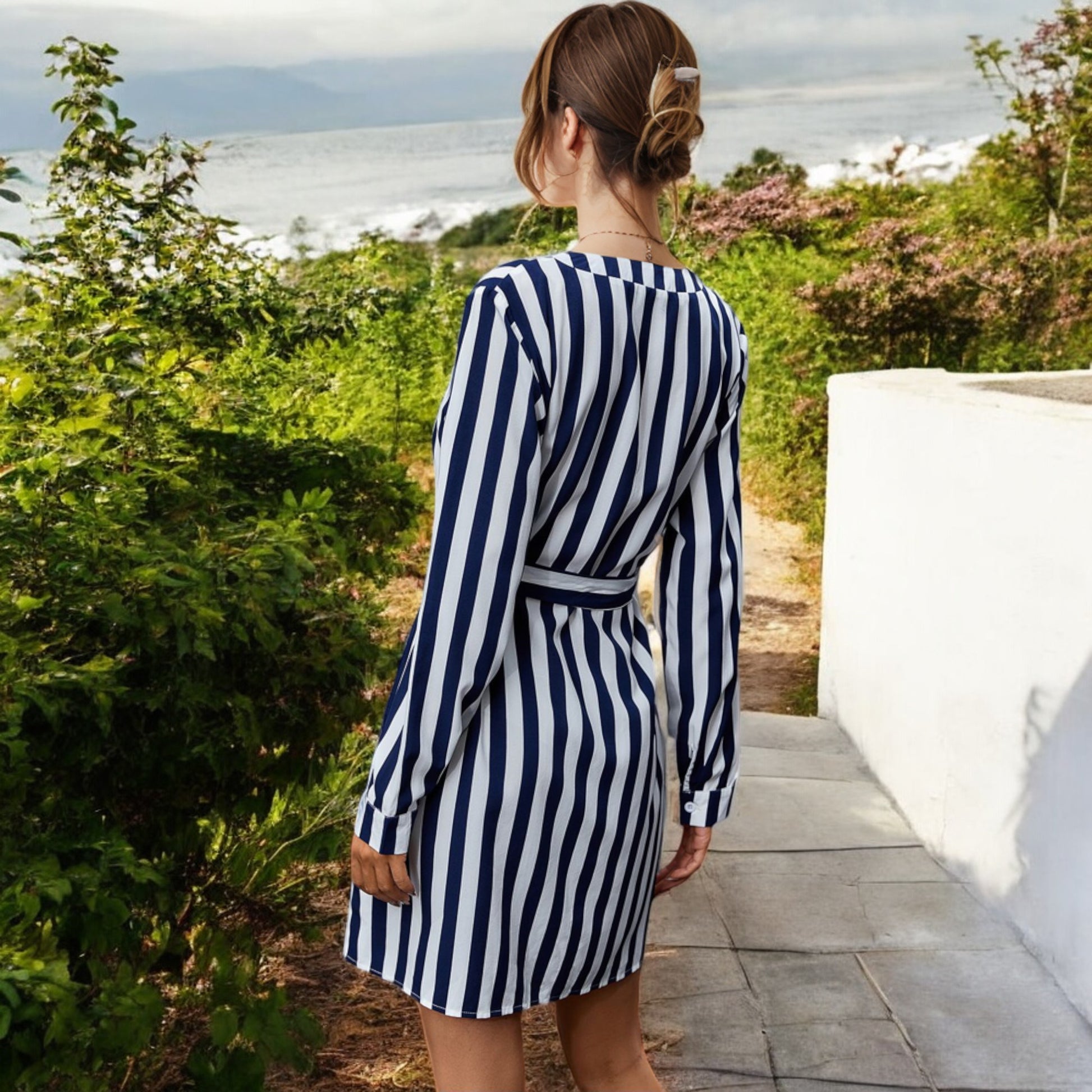 This chic striped mini dress features a flattering tie waist and long sleeves, perfect for casual or semi-formal occasions. The lightweight fabric offers comfort and style, while the vertical stripes create an elongating silhouette. Its notch neckline adds a touch of sophistication to the design. Pair this versatile dress with heels or sneakers for a polished, everyday look.