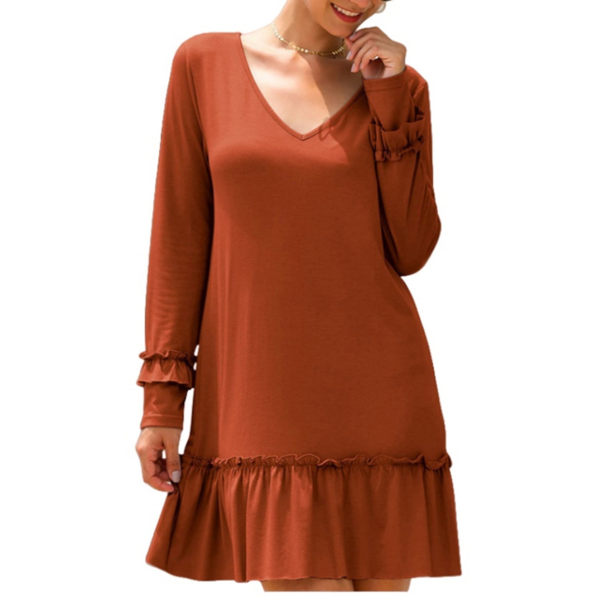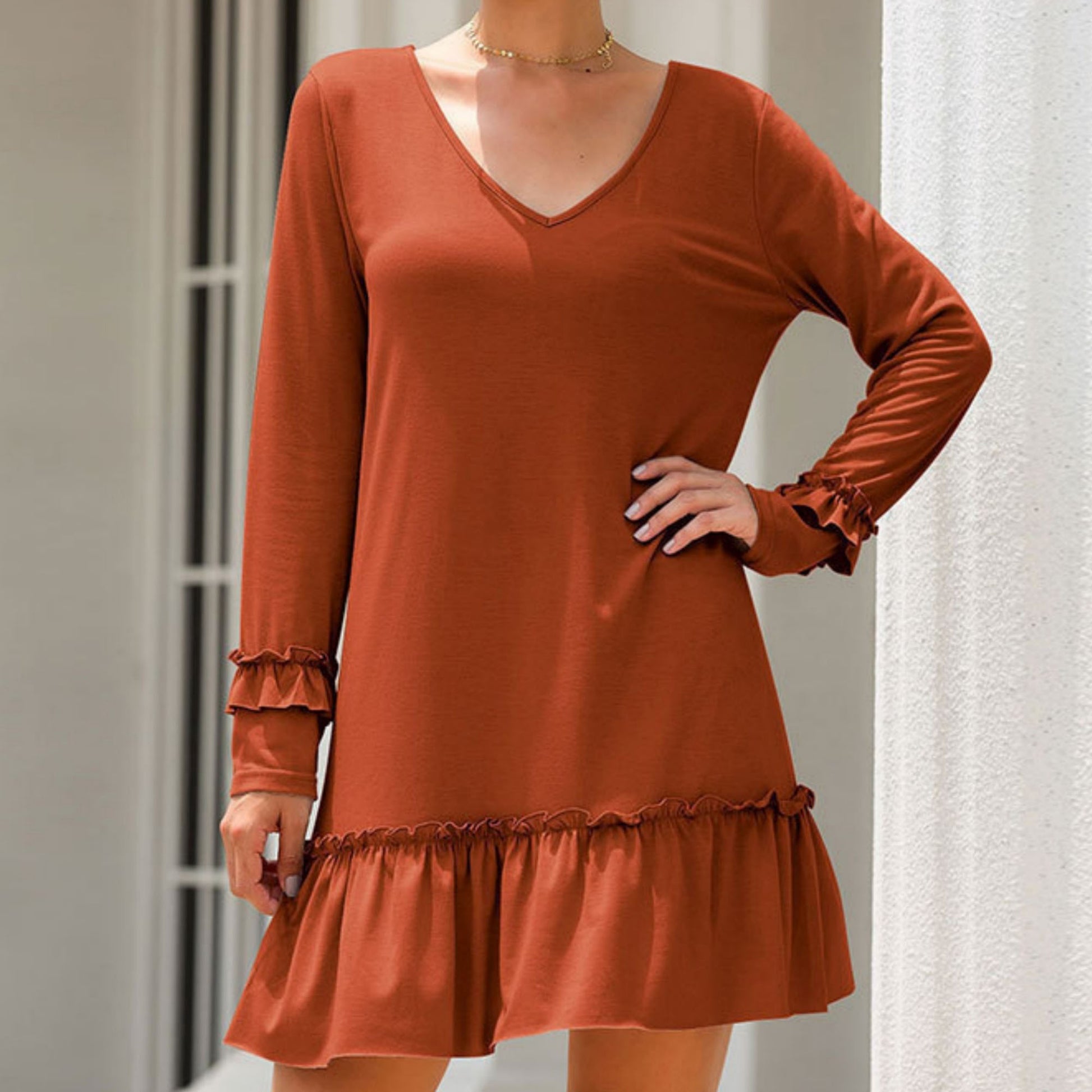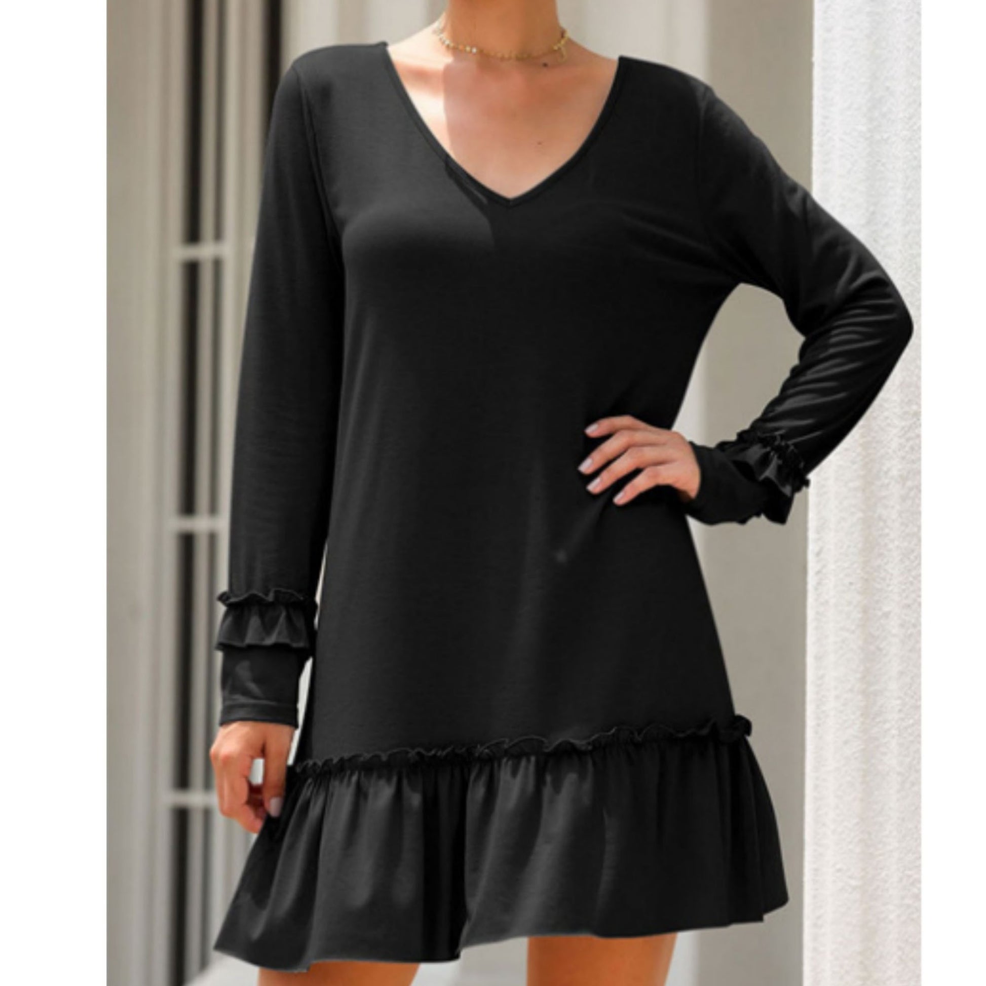 Anna-Kaci Women's Long Sleeve V Neck Ruffle Hem Mini Dress with Flowy Silhouette