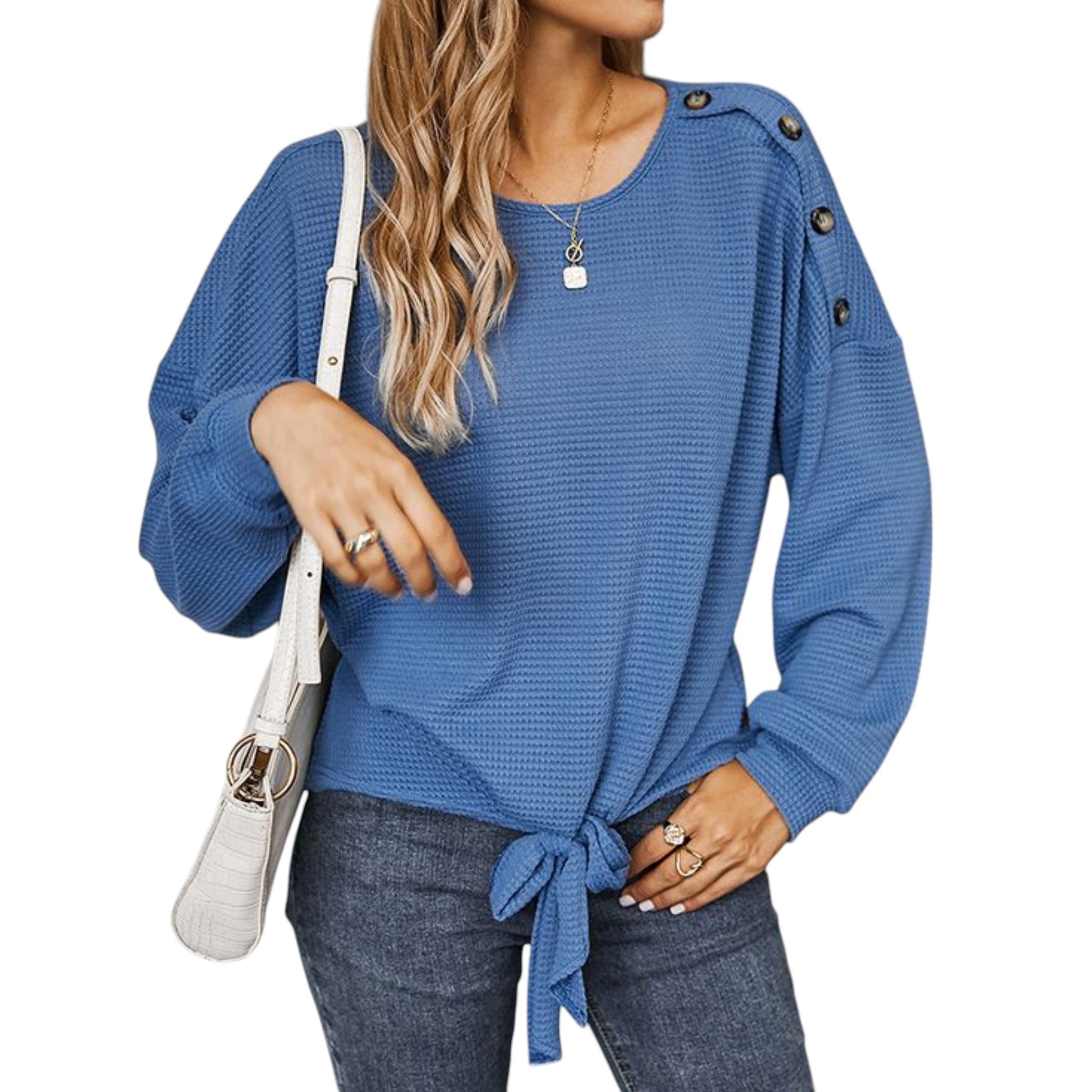 Anna-Kaci Women's Long Sleeve Waffle Knit Pullover Top with Shoulder Button Detail and Front Tie Hem