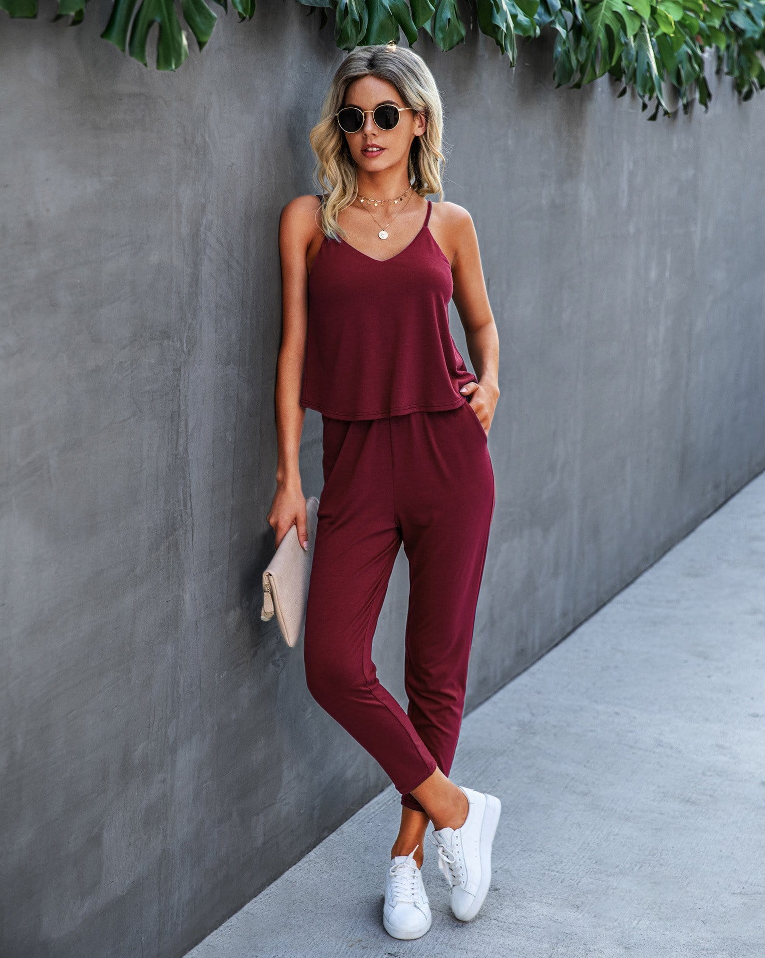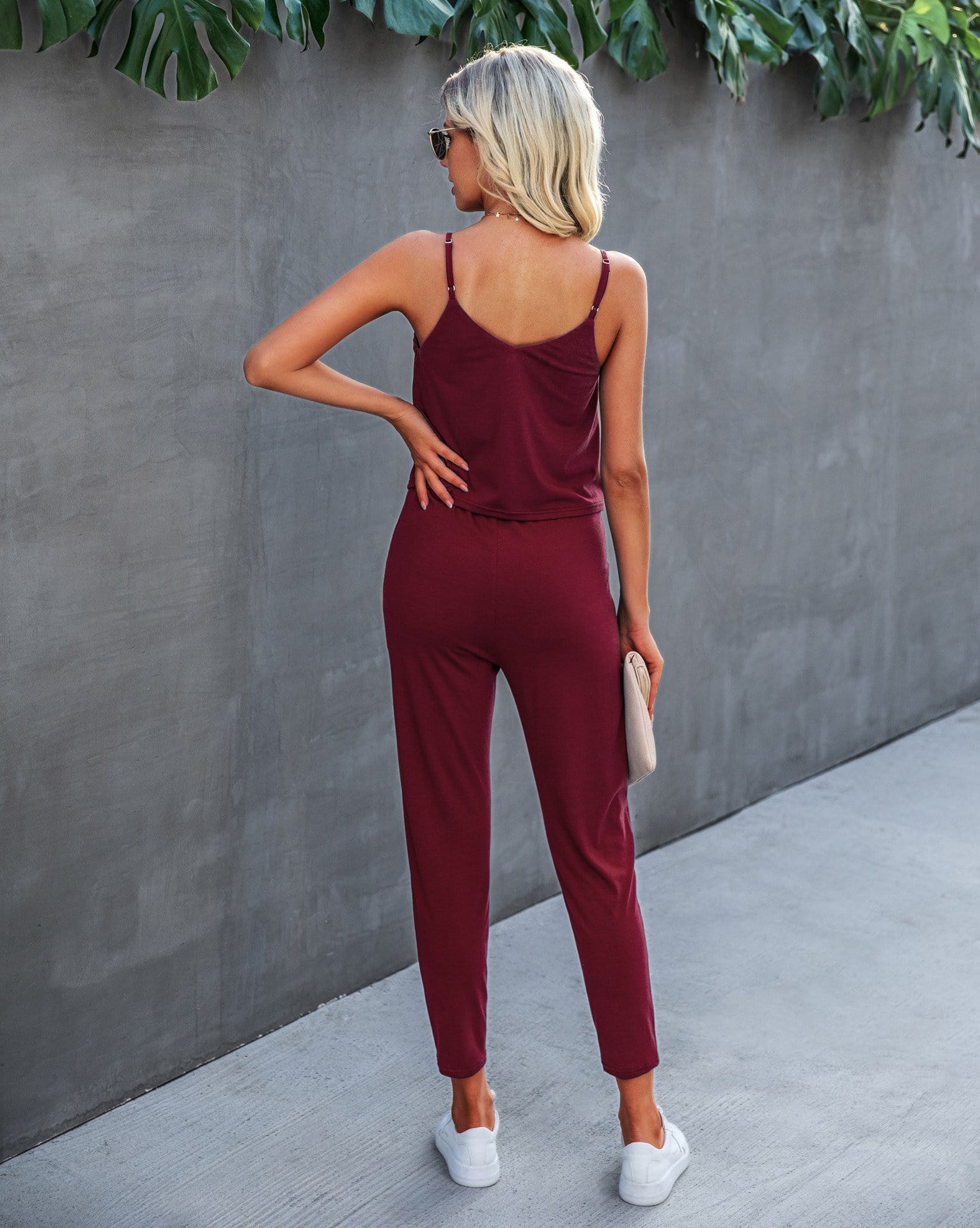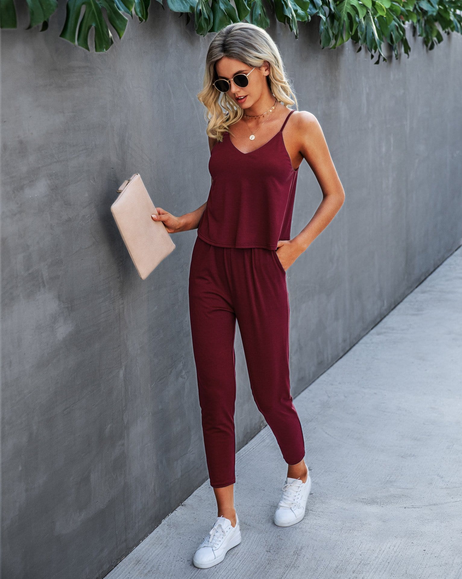 The Anna-Kaci coordinates are detailed with a classy solid color. Features a cami top with a v neck line, spaghetti straps, regular fit, and a matching regular fit and cropped length pants. Pair it together with sneakers for an easygoing look.