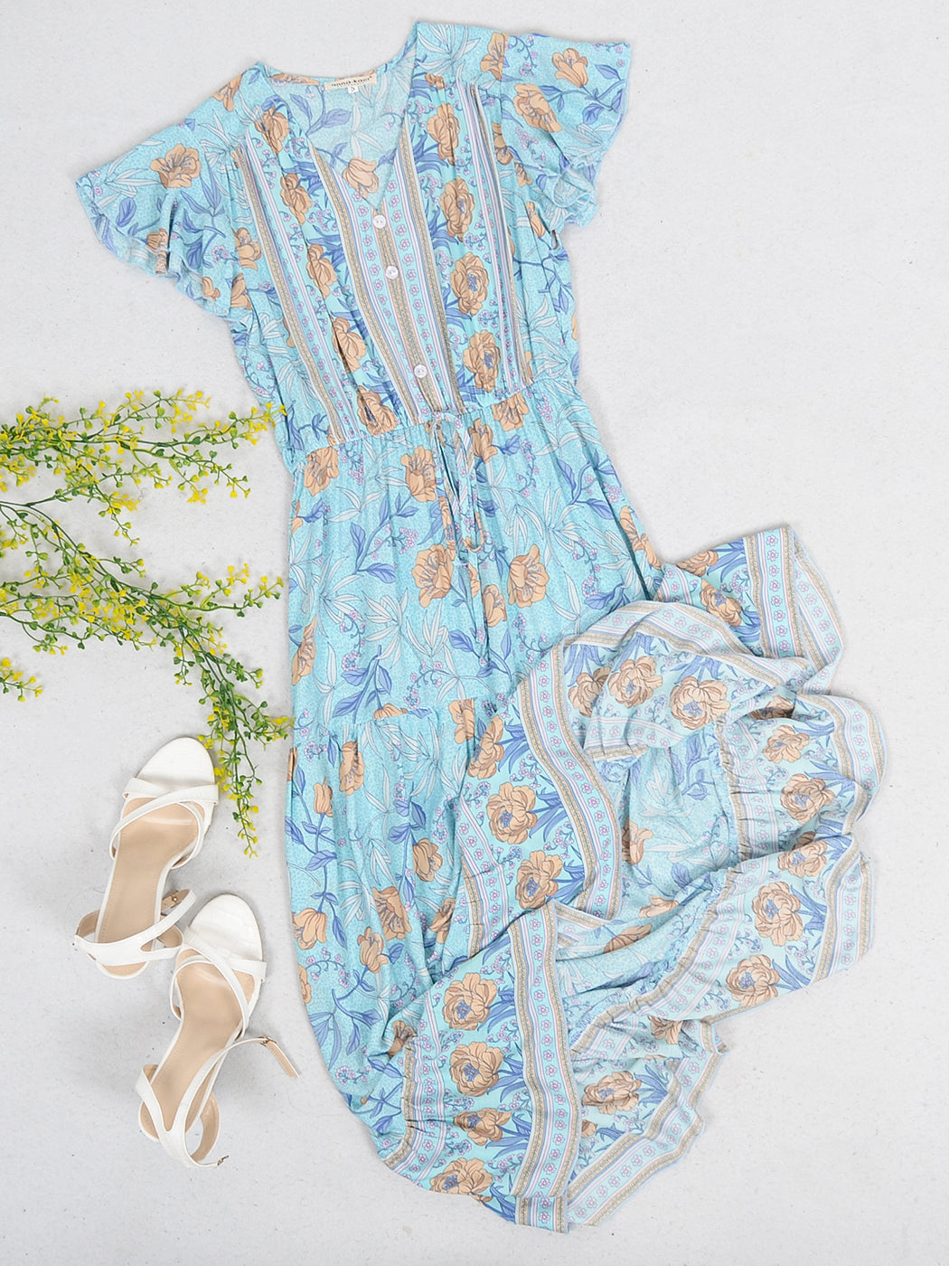 The Anna-Kaci dress is detailed with cute butterfly sleeves. Features a v neck line, button front, floral prints, drawstring waist, A-line silhouette, and above ankle length. Pair it with sunnies and sandals for a boho look.