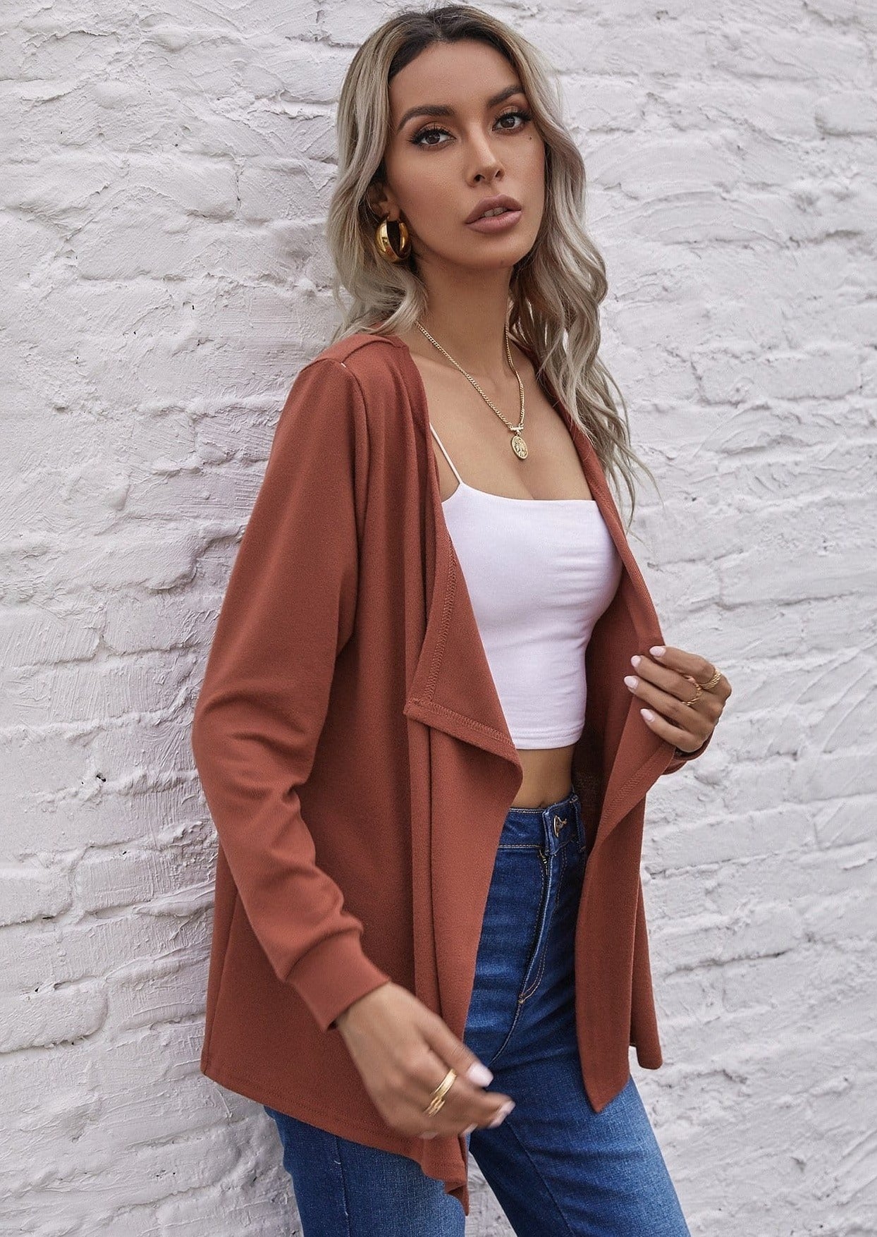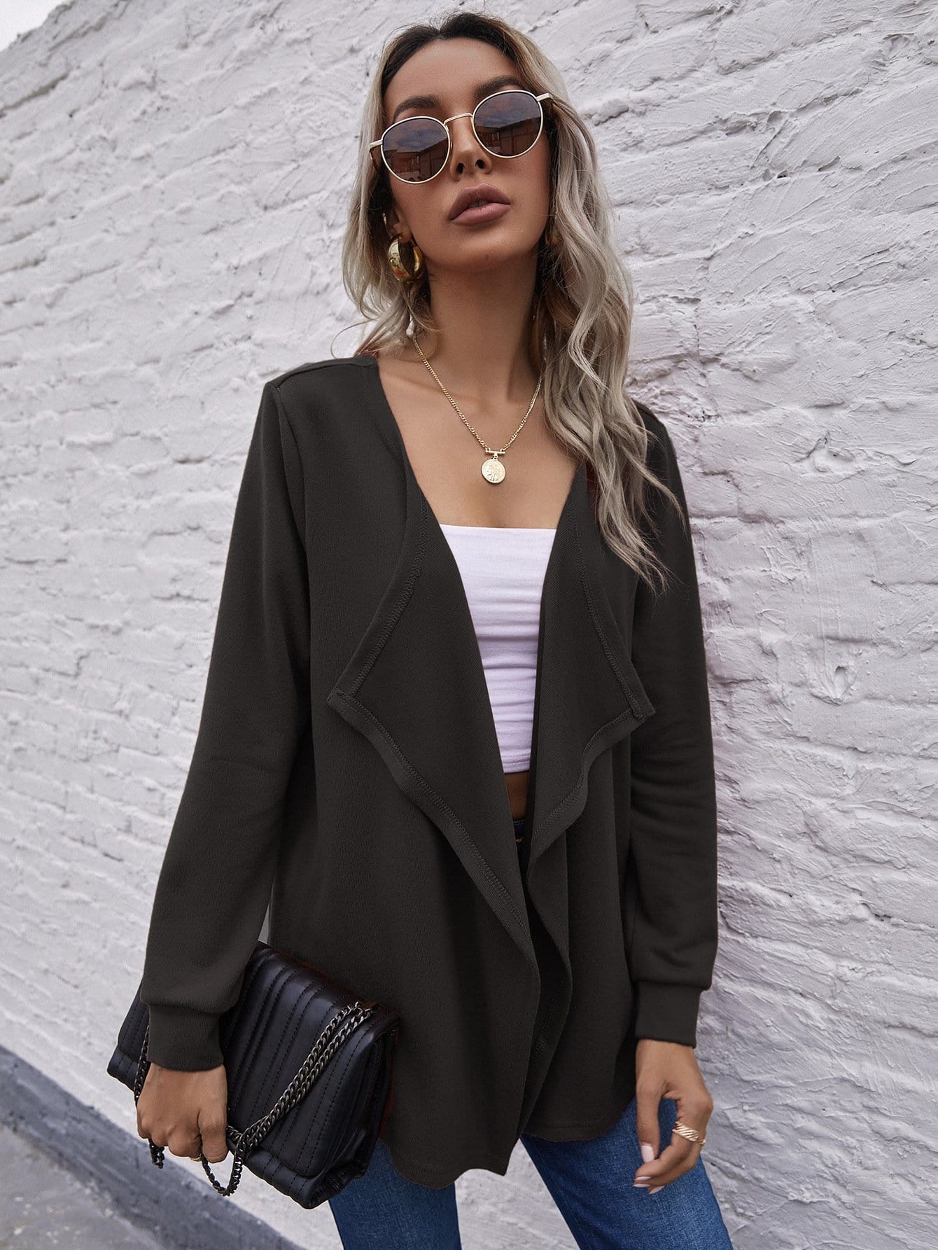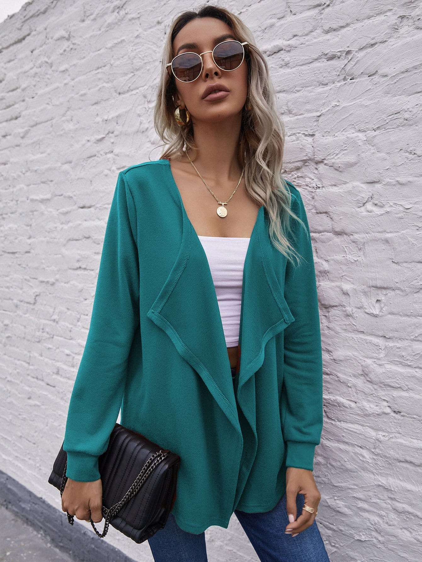 The Anna-Kaci jacket is detailed with a simple shawl design. Features an open front, long sleeves, solid color, and regular fit. Layer it over a basic tee and bootleg jeans for a fun look.