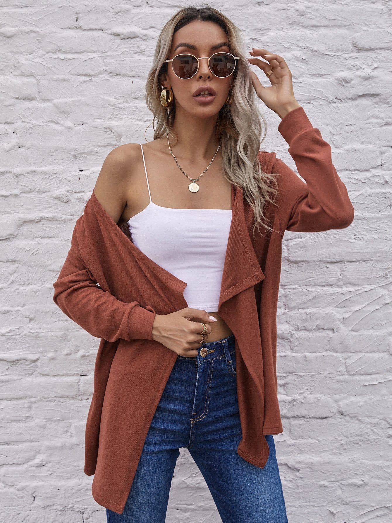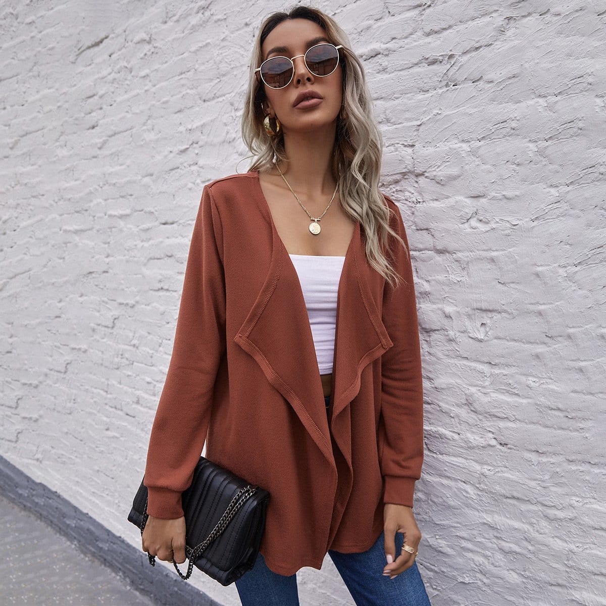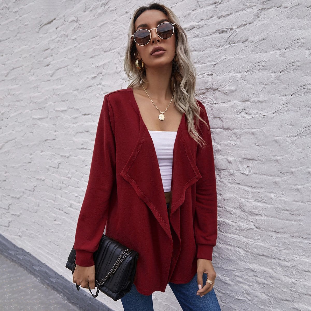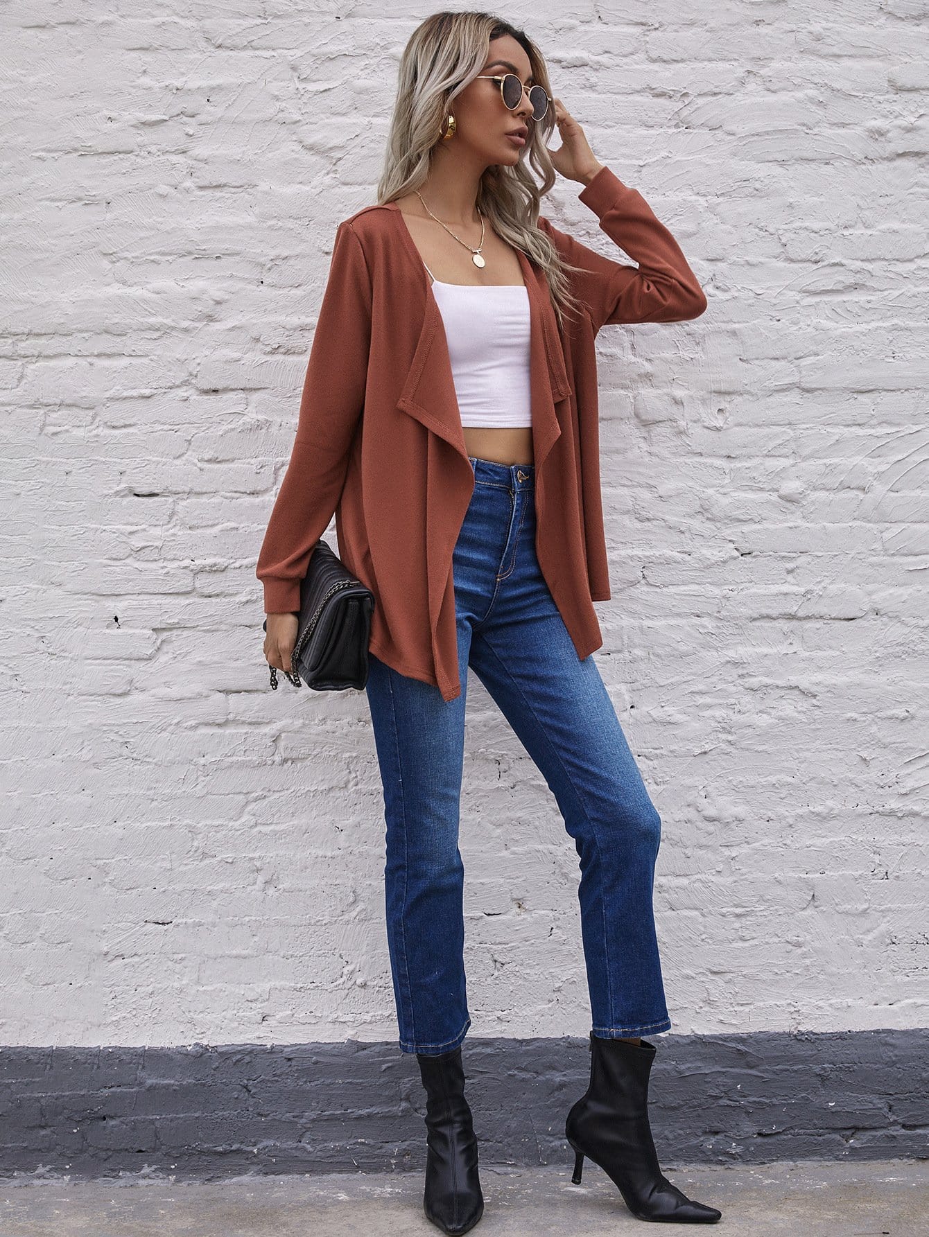 The Anna-Kaci jacket is detailed with a simple shawl design. Features an open front, long sleeves, solid color, and regular fit. Layer it over a basic tee and bootleg jeans for a fun look.