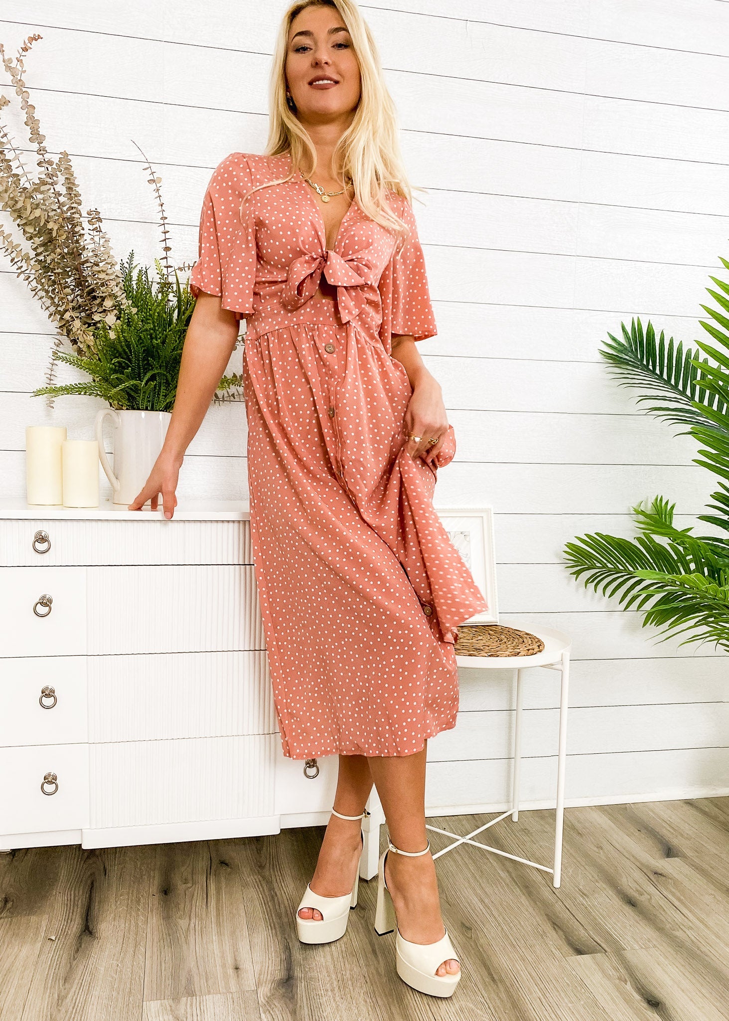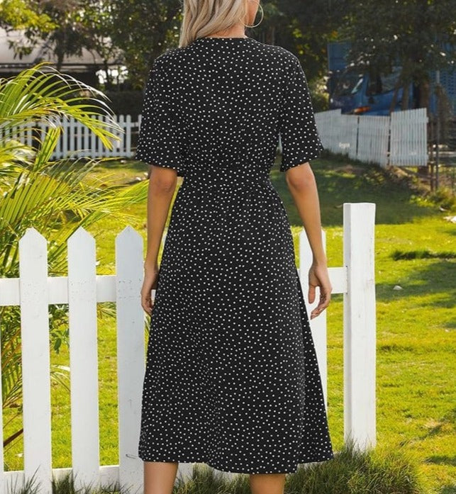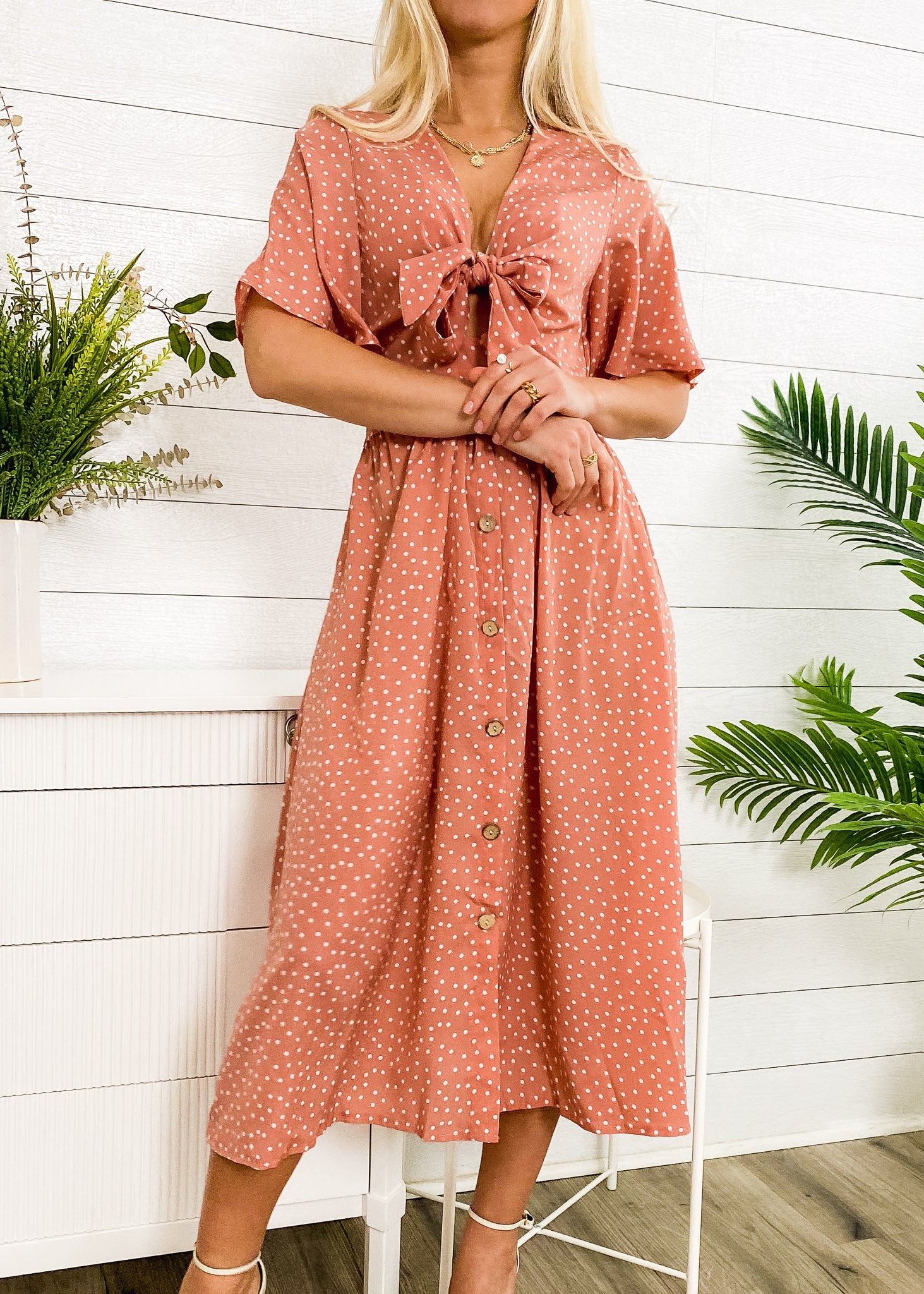 The Anna-Kaci dress is detailed with a sexy tie front. Features a v neck line, front cutout, short sleeves, button detail, A-line silhouette, polka dot print, and below knee length. Pair it with stilettos and a baguette bag for an extraordinary summer look.