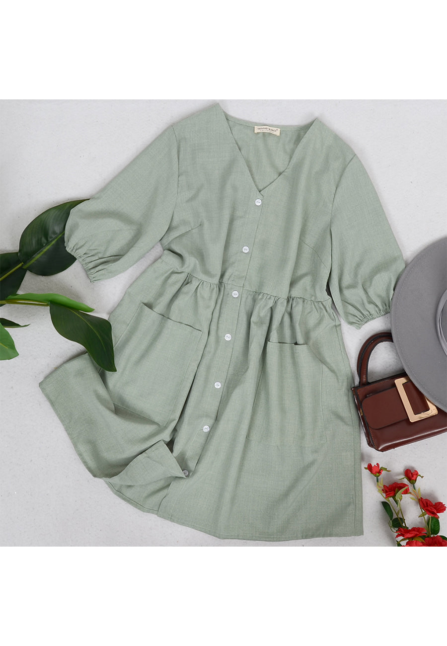 The Anna-Kaci Women's Button Front Mini Dress is a chic and versatile piece featuring a flattering V neckline and relaxed silhouette. Designed with half puff sleeves, this dress brings a soft, feminine touch while maintaining everyday comfort. The front button closure adds a classic element, and the roomy side pockets provide both style and practicality. Crafted from lightweight fabric, this dress offers a breezy feel that’s easy to wear and pair with your favorite accessories.